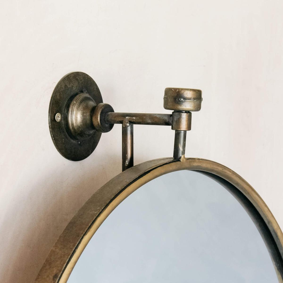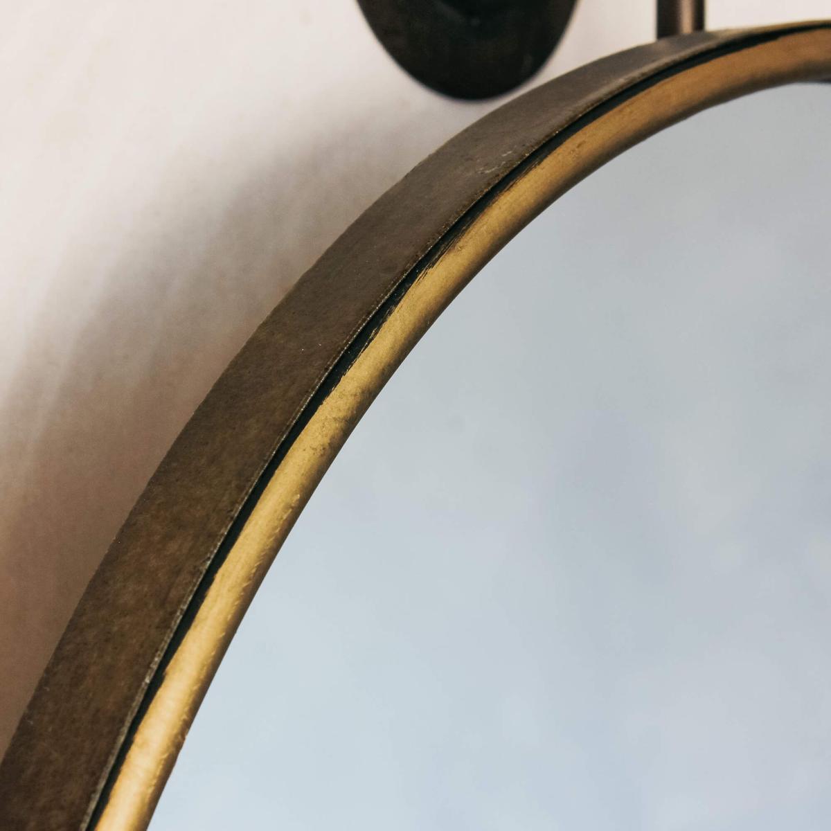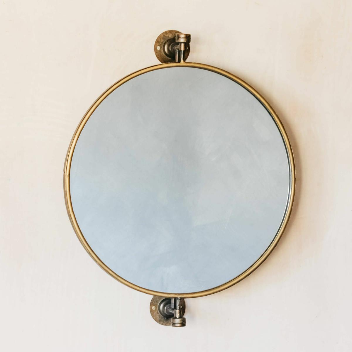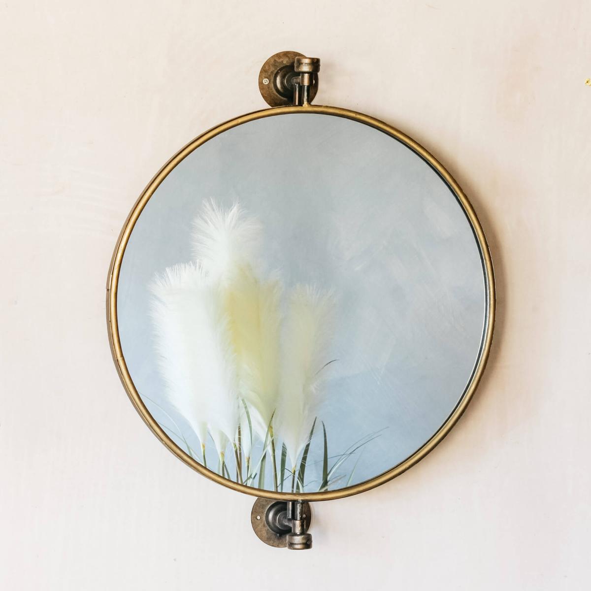 With the handy swivel function, this vintage-inspired round mirror is crafted from iron with an antiqued brass finish.