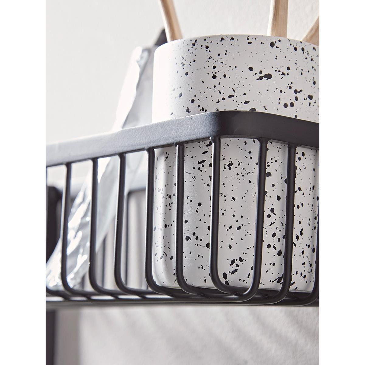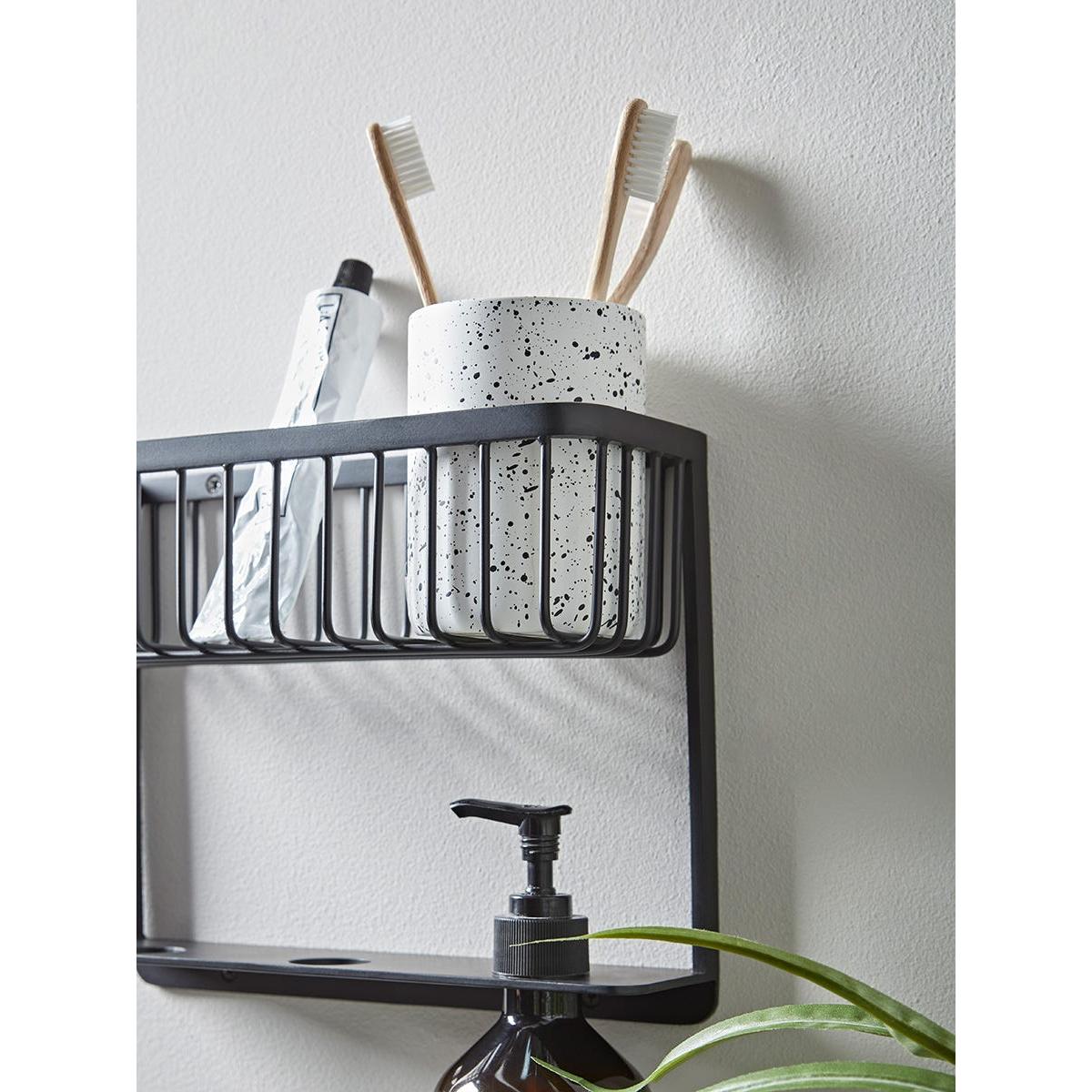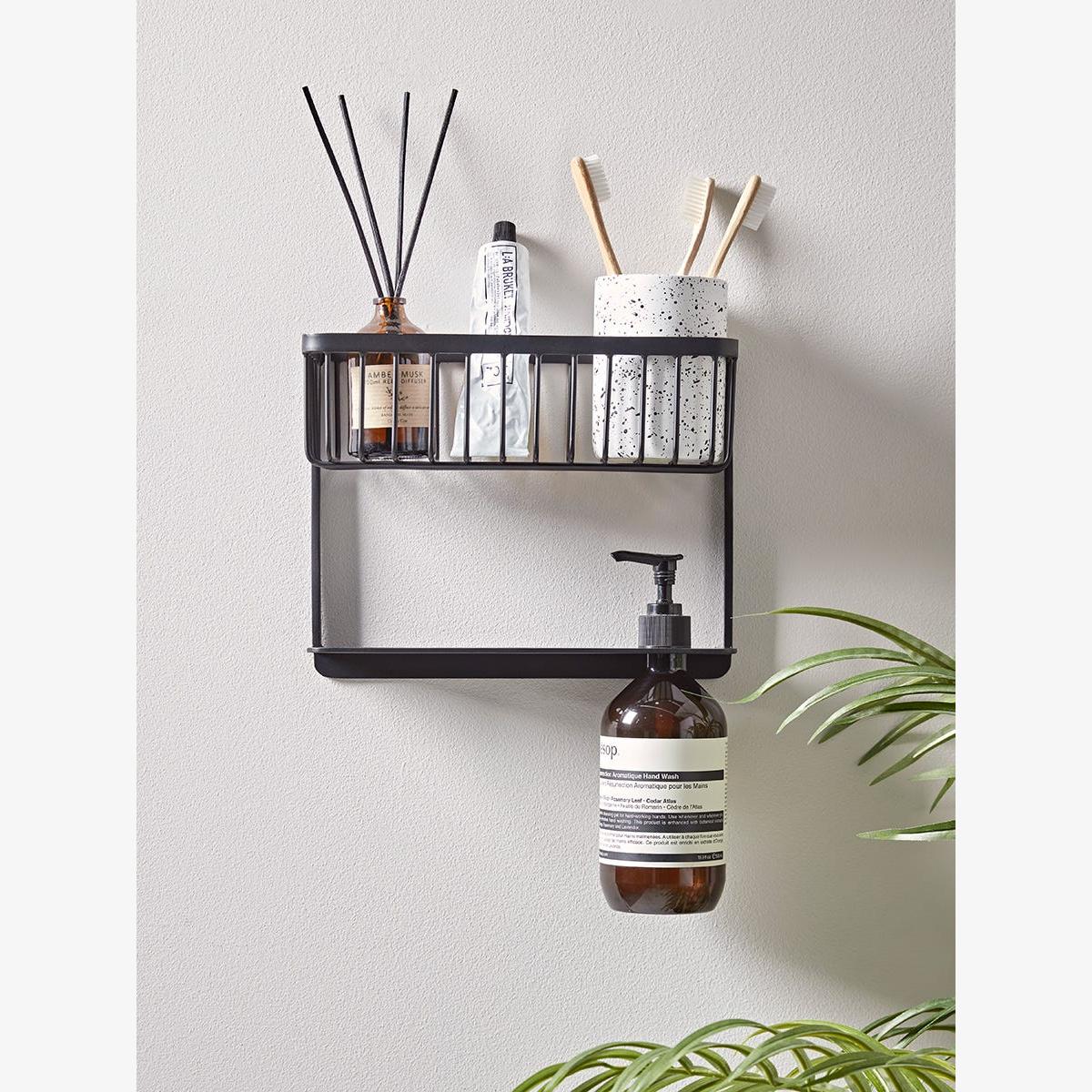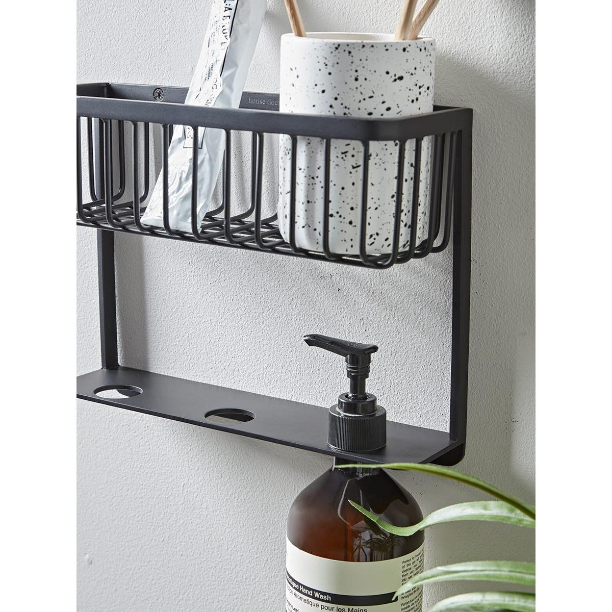 Ideal for smaller bathrooms or cloakrooms, this iron bathroom shelf will bring some clean cut industrial energy to your space. With a wire basket shelf above to safely contain toiletries, candles and tooth mugs, the lower shelf has three holes for pump dispensers containing soaps and lotions. A genius option for washrooms with freestanding bowl style sinks. This shelf is also available in brass.