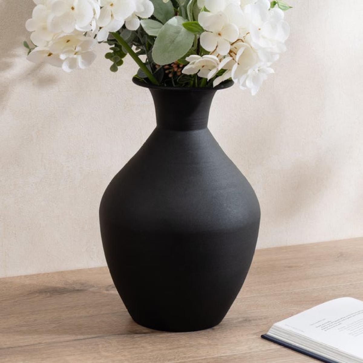 The iron-collared vase is a versatile piece that works particularly well in contemporary and minimalist interiors, thanks to its sleek matte black finish. I love how it adds a touch of sophistication without feeling overpowering, making it ideal for both living rooms and Entrance halls. Style it with fresh or dried flowers, or stand it alone as a statement piece on a console table or mantle. For a balanced look, pair it with neutral tones and simple decor to let the vase’s shape and matte finish shine. Practical tip: using it with a small bunch of seasonal flowers can instantly brighten a space, while its sturdy build makes it a practical choice for various interior settings.