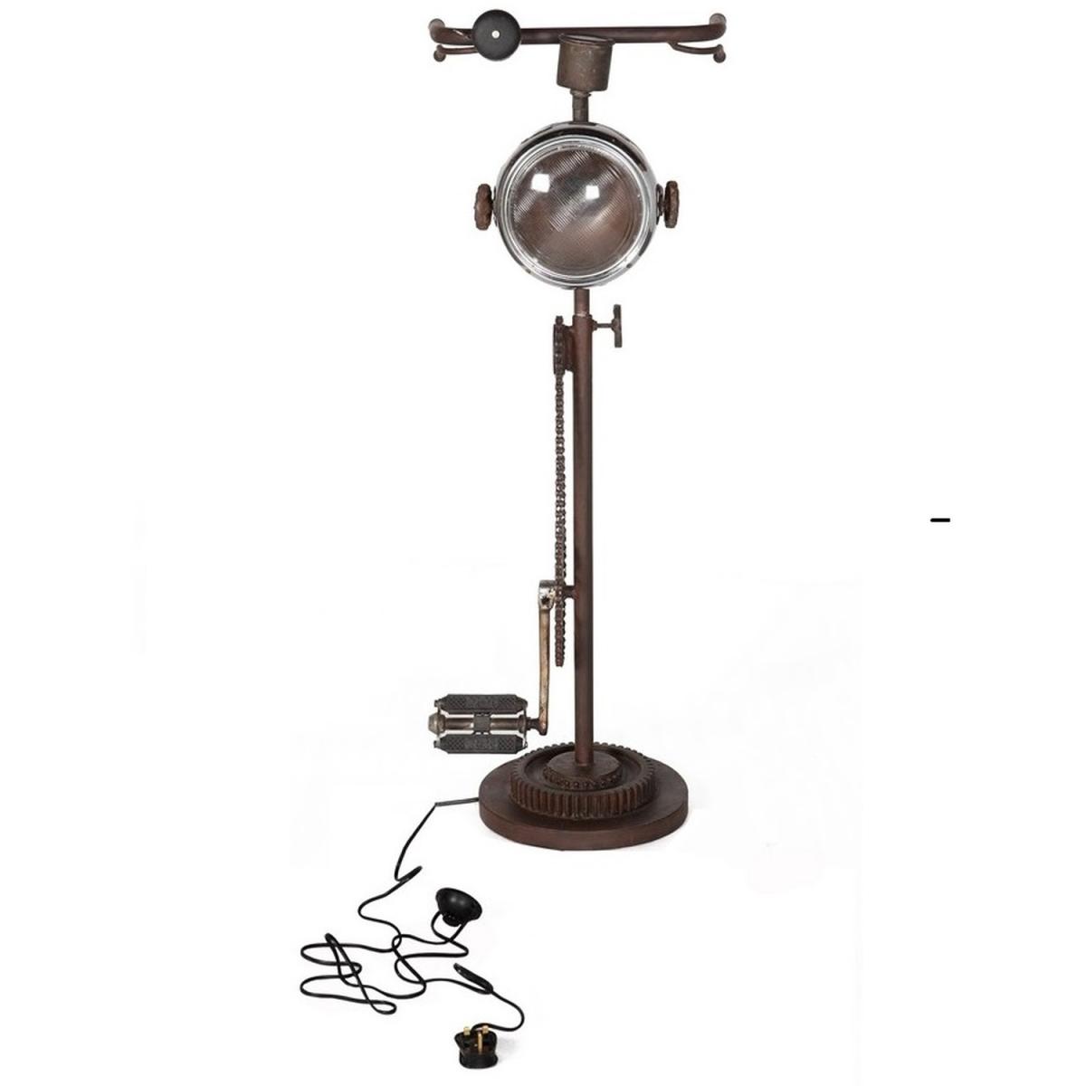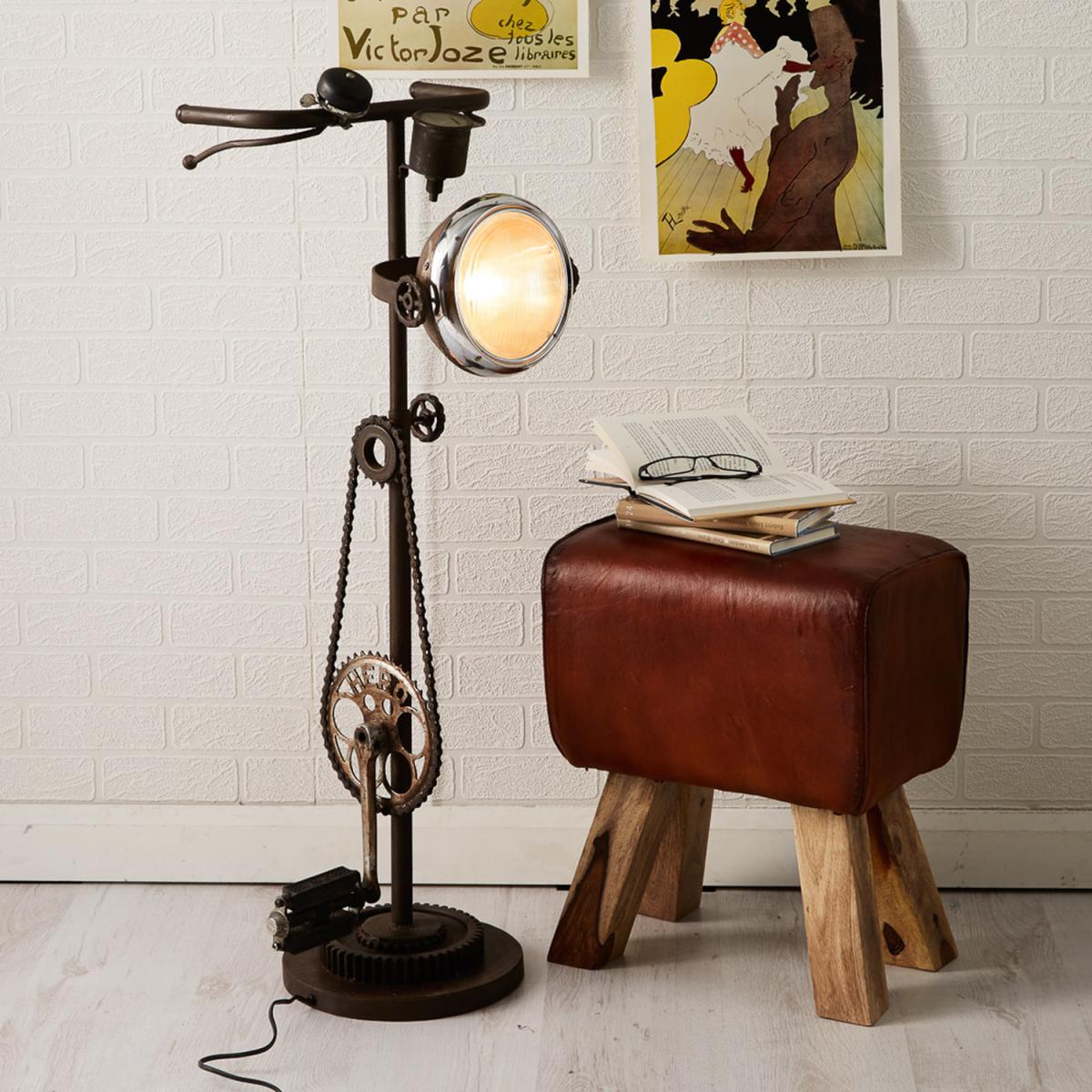 The Iron-Cycle Floor Lamp has been cleverly up-cycled using bicycle parts to create a unique floor lamp. The base which features a cog supports the stand which includes a gear chain and pedal. The vintage headlight incorporates the light bulb which is movable so that the light can be perfectly adapted to your room.