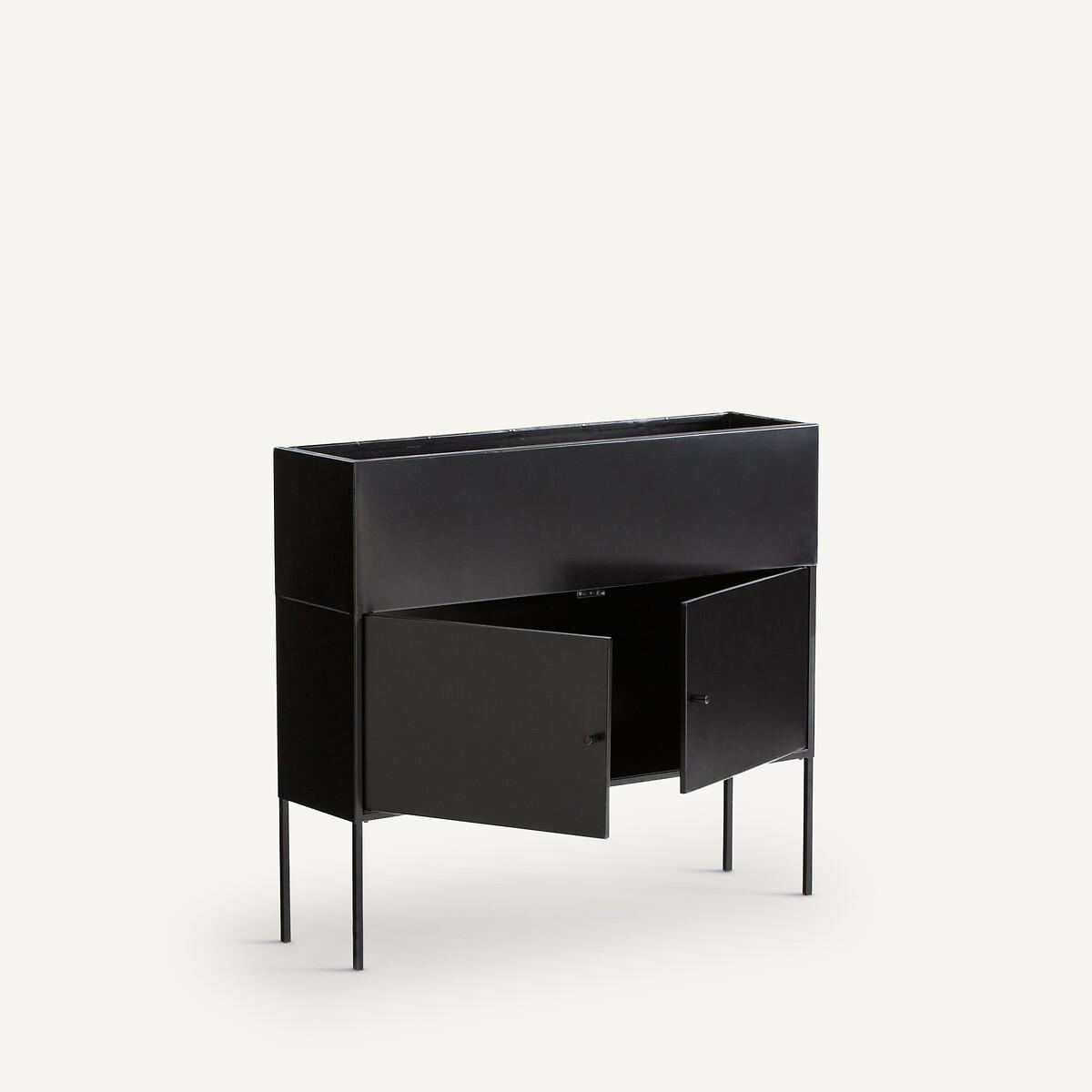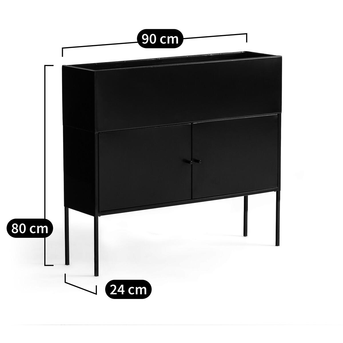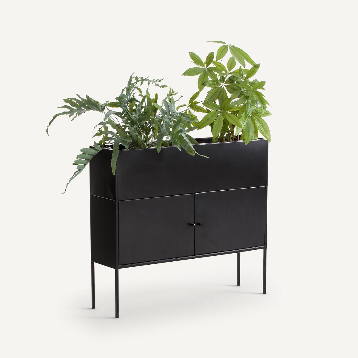 Consuela planter/console. A contemporary and refined style to highlight your plants and have your gardening equipment at your fingertips and nicely hidden behind the two doors. Product Details • In iron with matte black epoxy finish • 2 doors. Dimensions • Length: 90cm • Height: 80cm • Depth: 24cm • Dimensions of planting space: L87 x H23.6 x D20.5cm. • Dimensions of compartment : L89.7 x H31.3 x D23.5cm. Parcel Dimensions:L100.5 x H31 x D87.7cm, 30.6kg.
