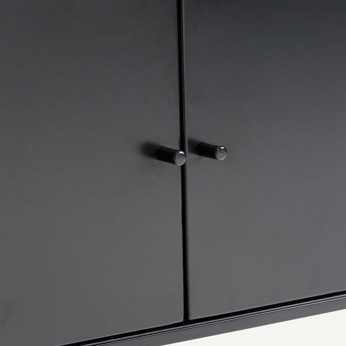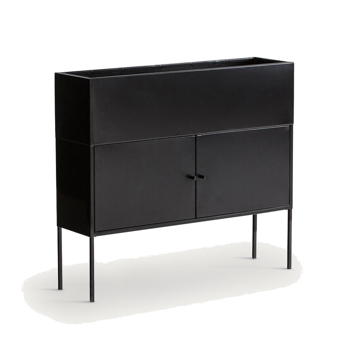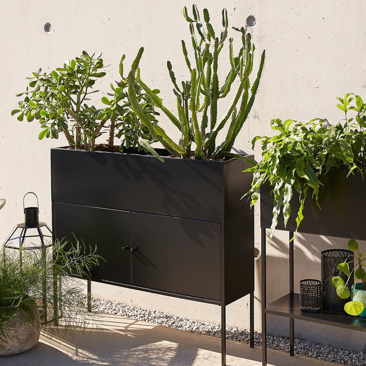 Consuela planter/console. A contemporary and refined style to highlight your plants and have your gardening equipment at your fingertips and nicely hidden behind the two doors. Product Details • In iron with matte black epoxy finish • 2 doors. Dimensions • Length: 90cm • Height: 80cm • Depth: 24cm • Dimensions of planting space: L87 x H23.6 x D20.5cm. • Dimensions of compartment : L89.7 x H31.3 x D23.5cm. Parcel Dimensions:L100.5 x H31 x D87.7cm, 30.6kg.