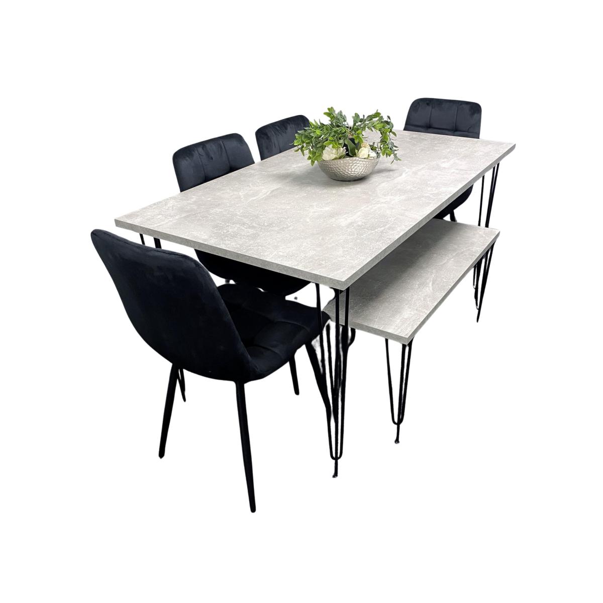 Elevate your dining experience with this stylish dining set, featuring a sleek grey table with a stone-grey effect finish and sturdy black hairpin legs. The durable melamine laminate tabletop provides a smooth, long-lasting surface, ideal for daily use. Accompanied by four tufted black velvet chairs and a matching bench, this set combines comfort and modern design. The bench mirrors the table's aesthetic with its hairpin legs, providing a coordinated look. Each chair offers ergonomic support with its slightly curved backrest and sturdy metal legs. Perfect for kitchens and dining rooms, this set brings together both form and function. Chairs are available in two colours.