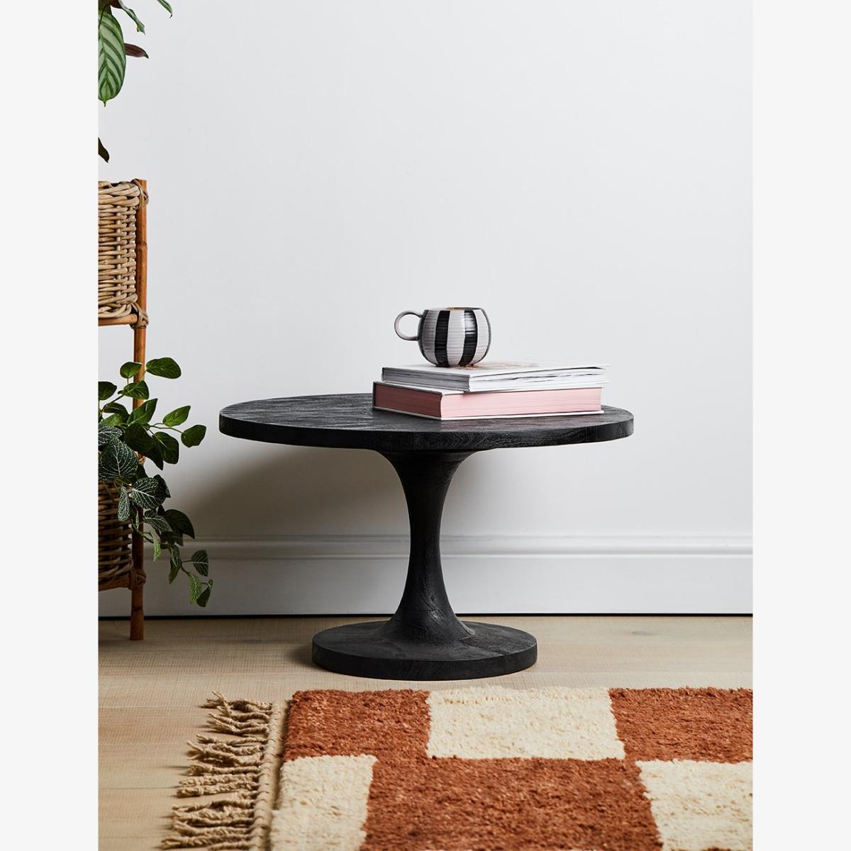 This simple yet stylish black mango wood coffee table is perfect for placing in front of your sofa to hold cups of tea, magazines and candles. A matching brown wooden side table is also available.