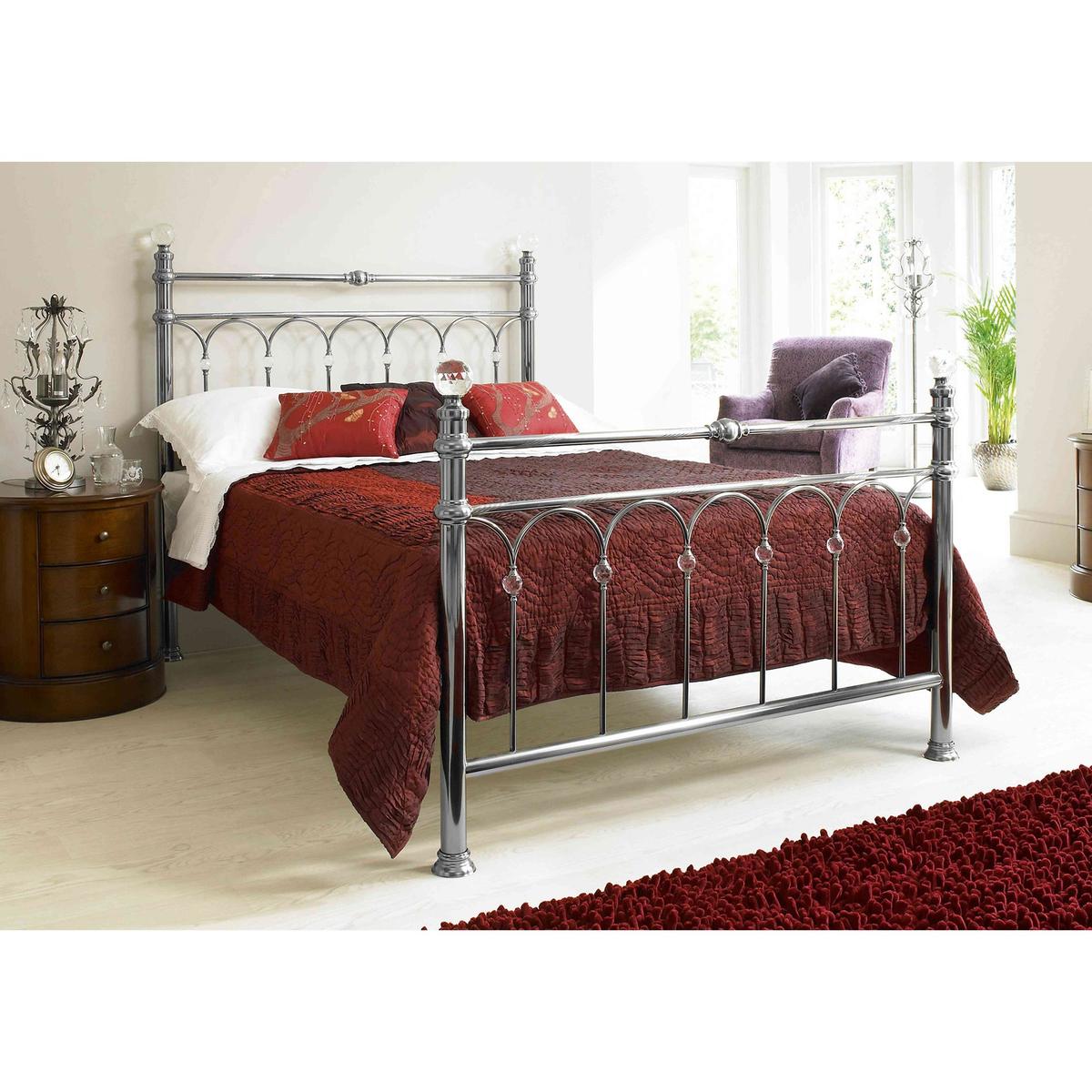 Headboard and footboard each come as one single piece. Glamorous, ornate metal bed frame. Finished in bright chrome. Sparkling crystal finials and detailing at head and foot. Made from a sturdy steel alloy. Base is sprung beech wood slats. Attractively priced. Mattress available separately