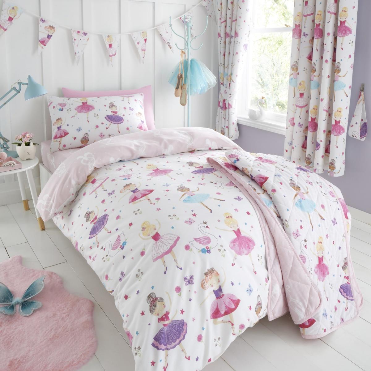 Dance on your prima ballerina tippy toes with this duvet cover and pillow case set. This set is reversible so you get 2 great designs for the price of 1! Created using a blend of high quality natural cotton polyester ensuring a soft, durable, easy care finish. OEKO-TEX certified and free from harmful chemicals. Convenient button closure for easy removal and secure fit. 1 Single duvet cover 138cm x 200cm (54" x 79") 1 Pillow case 50cm x 75cm (20" x 30").