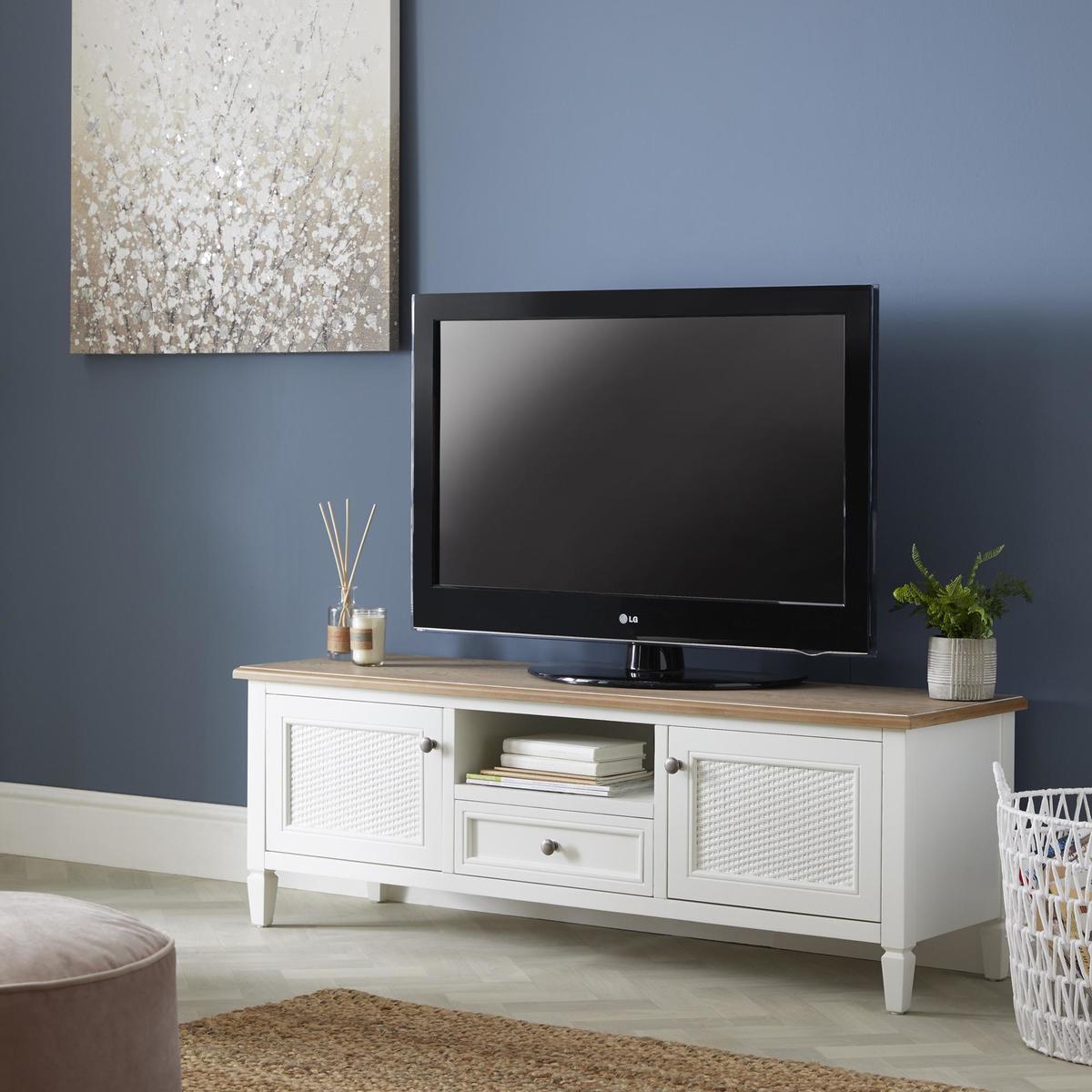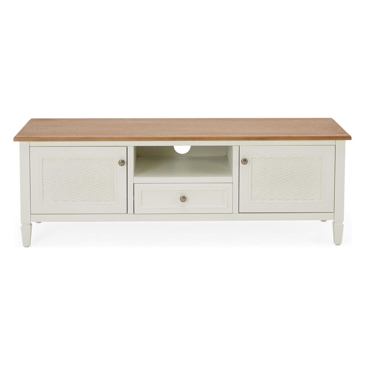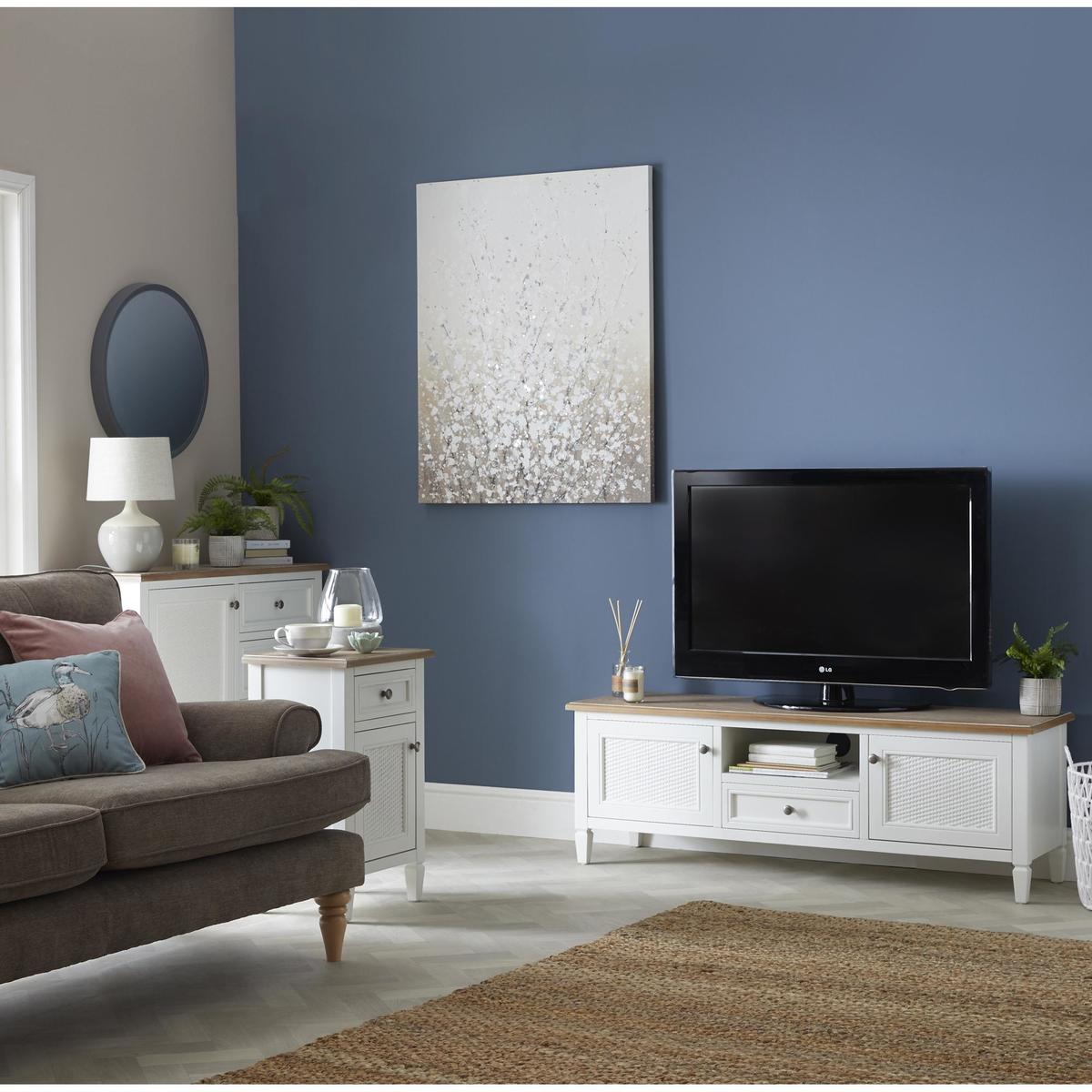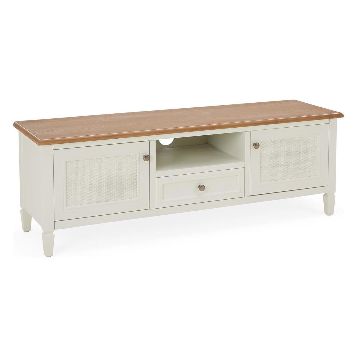 Dunelm Exclusive – Designed and Developed by Dunelm The Isabelle range is elegantly crafted to provide a stunning piece of furniture for any living space. Fashioned in a painted ivory finish with an oak veneer top, this beautiful range features a woven cane panel detailing and brass metal handles. Perfect to host various difference sized TVs, this wide TV stand features a spacious drawer with fixed shelving space above and two cupboards with ample storage space inside.