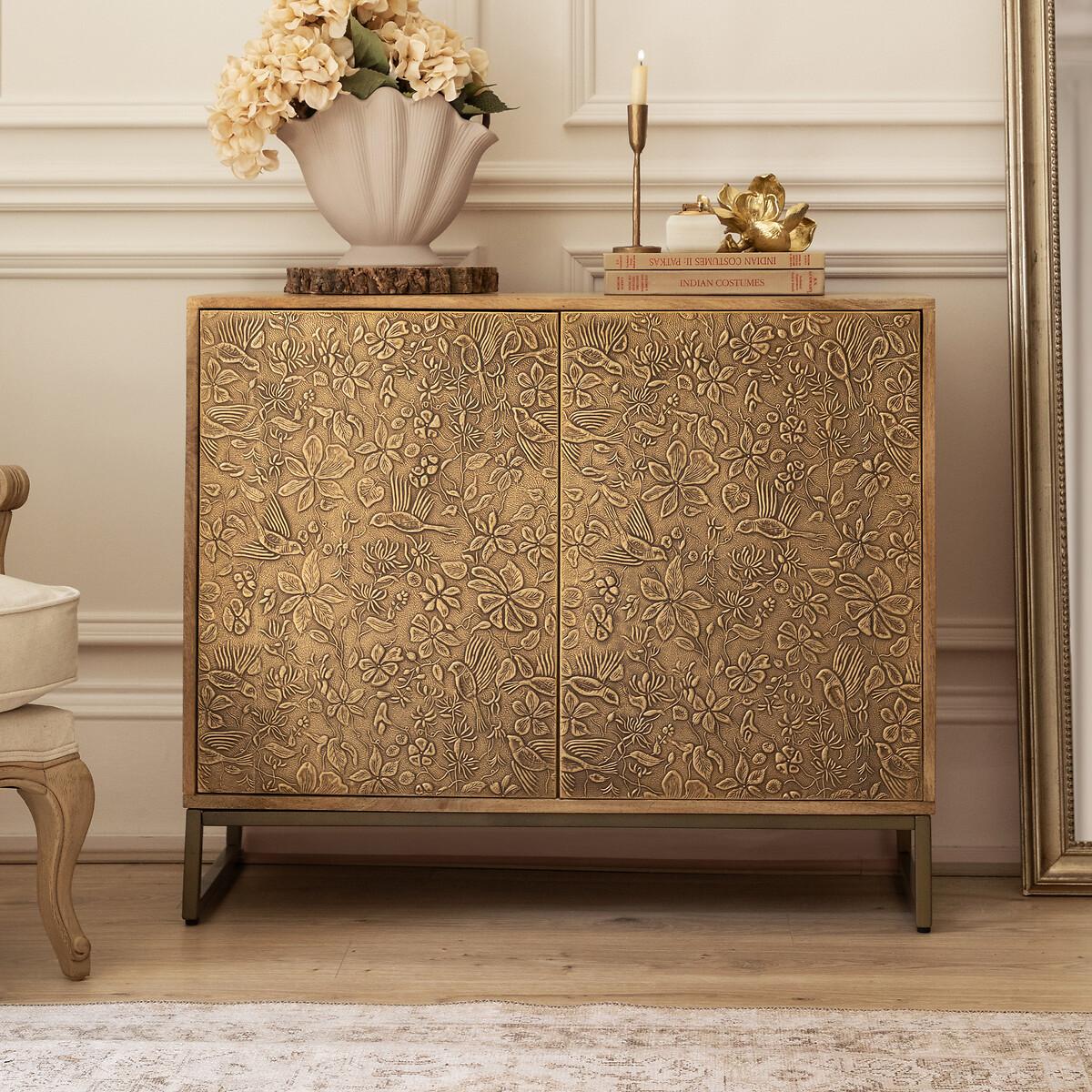 Introducing the Isadora Cabinet, a fusion of elegance and functionality. Its antique brass doors showcase intricate bird and floral motifs reminiscent of gilded ceilings. With a pale mango wood body and plenty of storage space, it's both visually striking and versatile, ideal for entryways, living areas, and bedrooms. Product Details • Delicate embossed design inspired by the romantic botanical gardens of the 1900s. • Antique brass doors (standard close) • Metal steel legs • Press and push closures • Fixed shelves • Delivered fully assembled Product Composition - Antique Brass Doors (MDF back), Pale Mango Wood Body, Mild Steel Legs. Product Dimensions - 40 cm x 95 cm x 80 cm, Weight 32 kg Leg height - 15 cm Package Dimensions - 95 cm x 80 cm x 40 cm, Weight 34 kg. This product will be dispatched by one of our trusted suppliers. You’ll be contacted by their selected courier about your delivery.