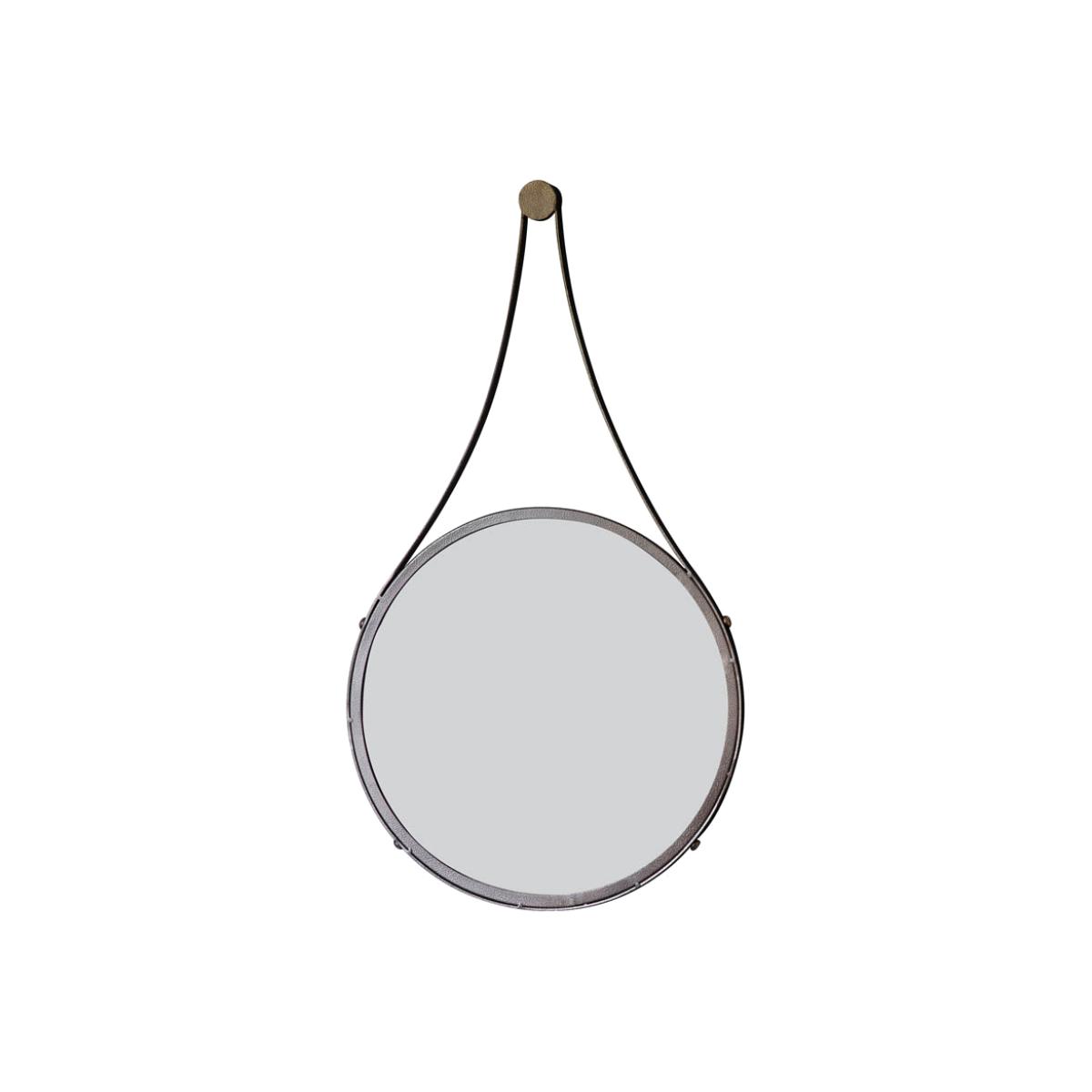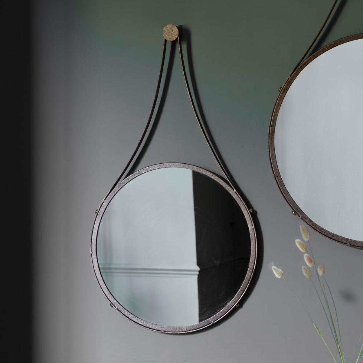 Add a slightly industrial feel to a wall with this unusual mirror which features a metal surround and ‘hanging strap’. Larger size also available. Shape: Round. Material: Glass, Iron, MDF. Colour/Finish: Bronze. Mount Type: Wall.