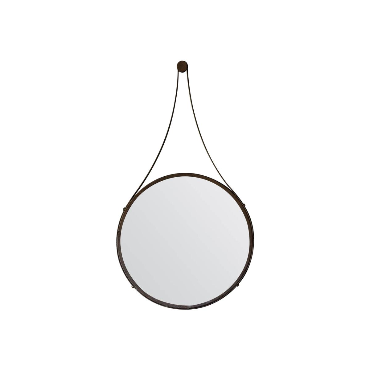 Add a slightly industrial feel to a wall with this unusual mirror which features a metal surround and ‘hanging strap’. Smaller size also available. Shape: Round. Material: Glass, Iron, MDF. Colour/Finish: Bronze. Mount Type: Wall.