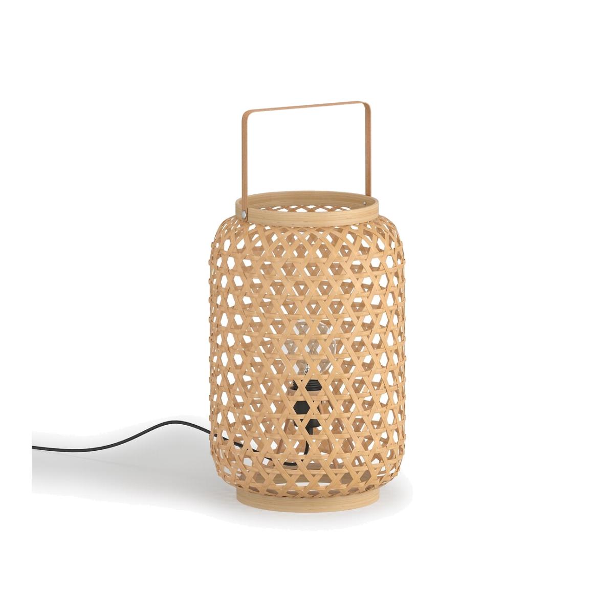 The Iska bamboo table lamp. A trendy, artisanal lamp which diffuses the light softly through your home. Artisanal craftsmanship. Product Details • Fitted with E14 socket compatible with 40W max bulb, (not included) • Supports bulb class A to E • Hand woven bamboo • Iron structure covered with epoxy paint. Dimensions • Diameter: 20cm • Height: 28cm • Handle 10cm