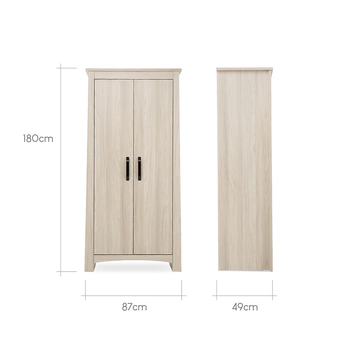 The Isla Wardrobe is the perfect storage option for a contemporary or a more traditional nursery. This soft ash double wardrobe has stylish black handles for a modern twist. Fill the Isla nursery wardrobe with all of your little one’s cutest outfits. Inside the wardrobe, you’ll find a spacious interior featuring removable hanging rails and a shelf for keeping all their clothes organised. To convert Isla into a full-size wardrobe, simply remove one of the hanging rails.• 2 removable hanging rails• 1 internal shelf• The wardrobe measures 85 x 50 x 180cm (L x W x H)• Fully certified and accredited testing to FIRA FRQG C001 & C004. Please remember to measure your available space before ordering. Cot Bed: 83.3% Chipboard, 2.5% HDF, 14.2% Pine Parcel 1 Packaged Dimensions: 107cmx 77cmx 2cm Weight: 17900g Parcel 2 Packaged Dimensions: 186cmx53cmx7cm Weight: 27000g Parcel 3 Packaged Dimensions: 164cmx 42cmx 6cm Weight: 15000g. Unless faulty or damaged, goods need to be in their original unopened packaging to be returned. This product will be dispatched by one of our trusted suppliers. You’ll be contacted by their selected courier about your delivery. CUDDL01