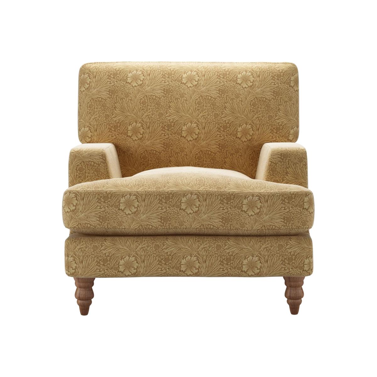 I love this armchair for bringing a pop of colour and a touch of vintage charm to a space. Its rich marigold velvet ochre makes it an excellent statement piece in neutral or muted interiors, adding warmth without overpowering the room. It's versatile enough to work well in both traditional and contemporary settings, especially when paired with other textured fabrics or wooden accents. For styling, consider layering with cosy throws or patterned cushions to highlight its character. Practical tip: its compact size makes it ideal for small living rooms, reading nooks, or even as an accent piece in bedrooms or hallways.