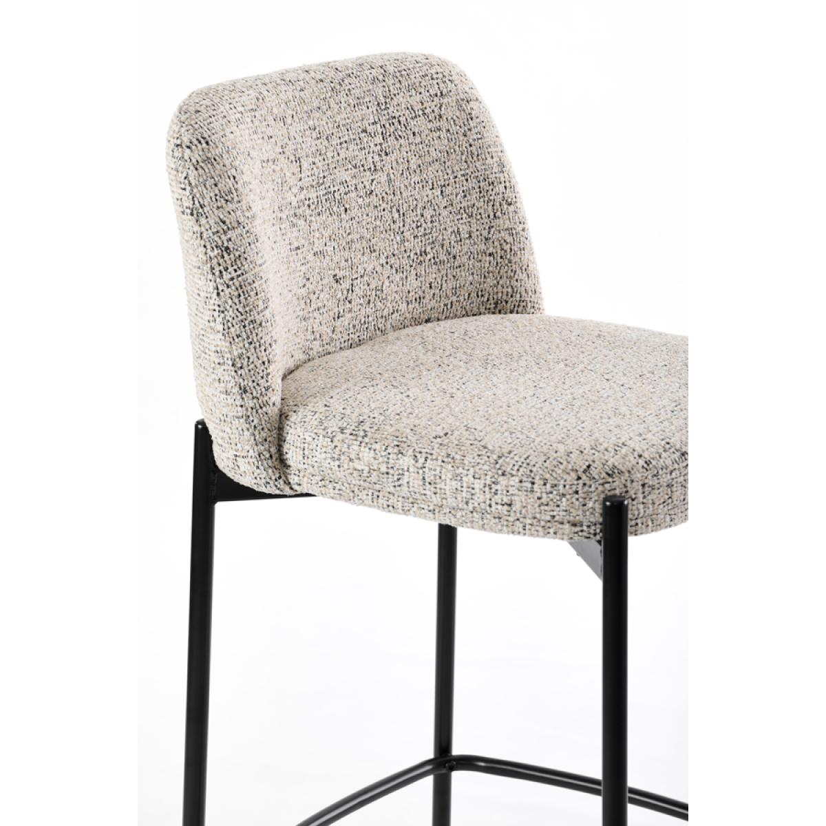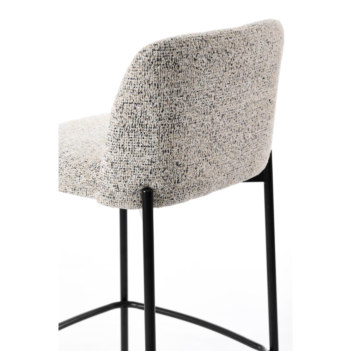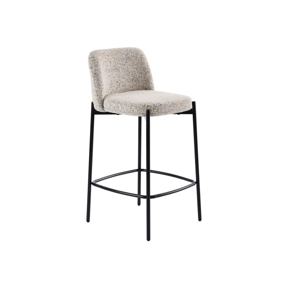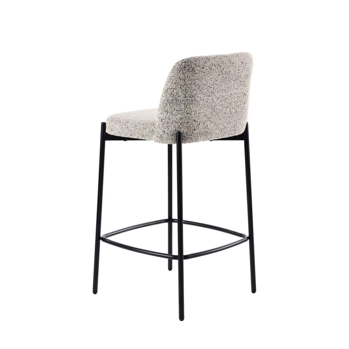 A stylish, modern bar stool with subtly sculpted curves. Deep foam-padded seat and back, upholstered in a comfortable multi-tone chenille fabric. Striking steel base, with a durable black powder-coated finish. Black height-adjustable glide feet. Ideal in height for use at standard breakfast bars. Minimal assembly required — approximately 10 minutes.