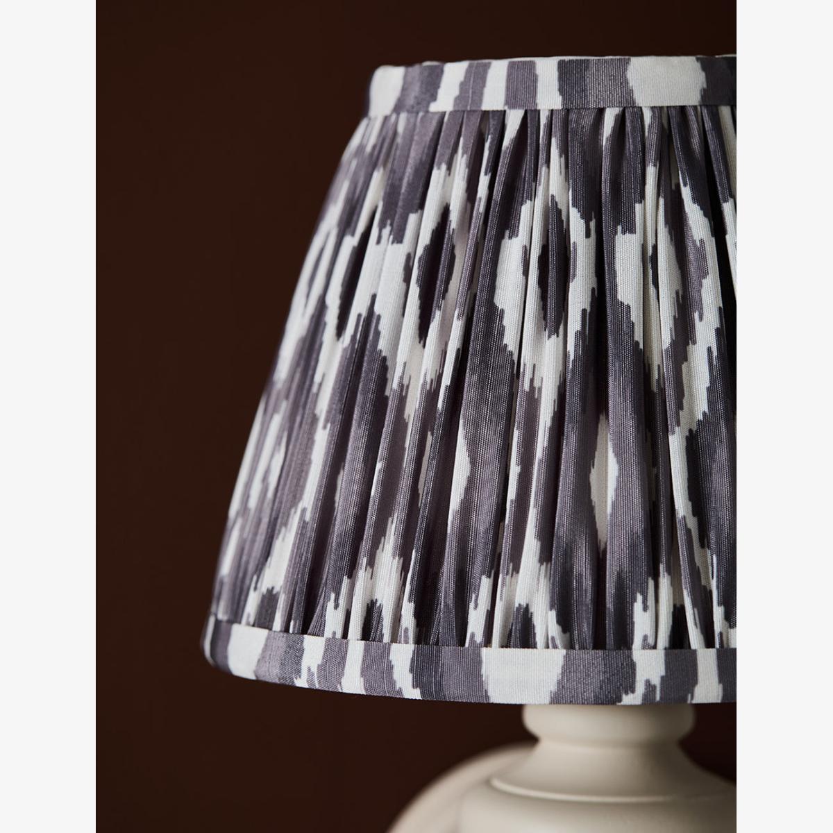 An extra small Pearl Grey pleated fabric shade in an Ikat print (a dyeing technique from Southeast Asia) which is lined and edged beautifully. Fitting clips over the bulb. Goes perfectly with any of our rechargeable brass lamps...which colour will you go for? Also available in a Coral or Natural colourway or in a Zig Zag print in Pearl Grey and Moss Green. Pair with our Auguste or Gustave rechargeable lamps. A small 16cm pearl grey toned pleated fabric shade in an Ikat print suitable for our Gustave and Auguste portable brass lamps. Fitting simply clips onto the bulb.