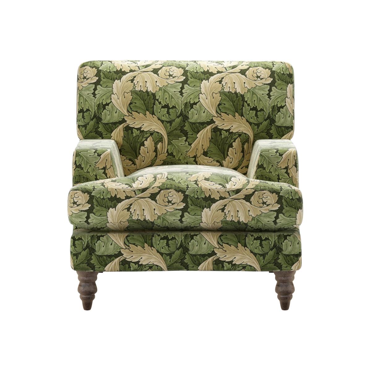 This armchair is a fantastic statement piece that works well in both traditional and eclectic interiors. I love its bold, patterned upholstery in Acanthus Velvet Nettle, which adds texture and visual interest without overwhelming the space. It's versatile enough to pair with neutral palettes for a pop of colour, or to complement more layered, patterned rooms. Practical styling tips include placing it alongside a sleek side table for functionality, or creating a cosy reading nook by adding a soft throw and a small lamp. Its compact size makes it suitable for smaller living rooms or bedrooms, where it can serve as a comfortable accent chair without cluttering the space.