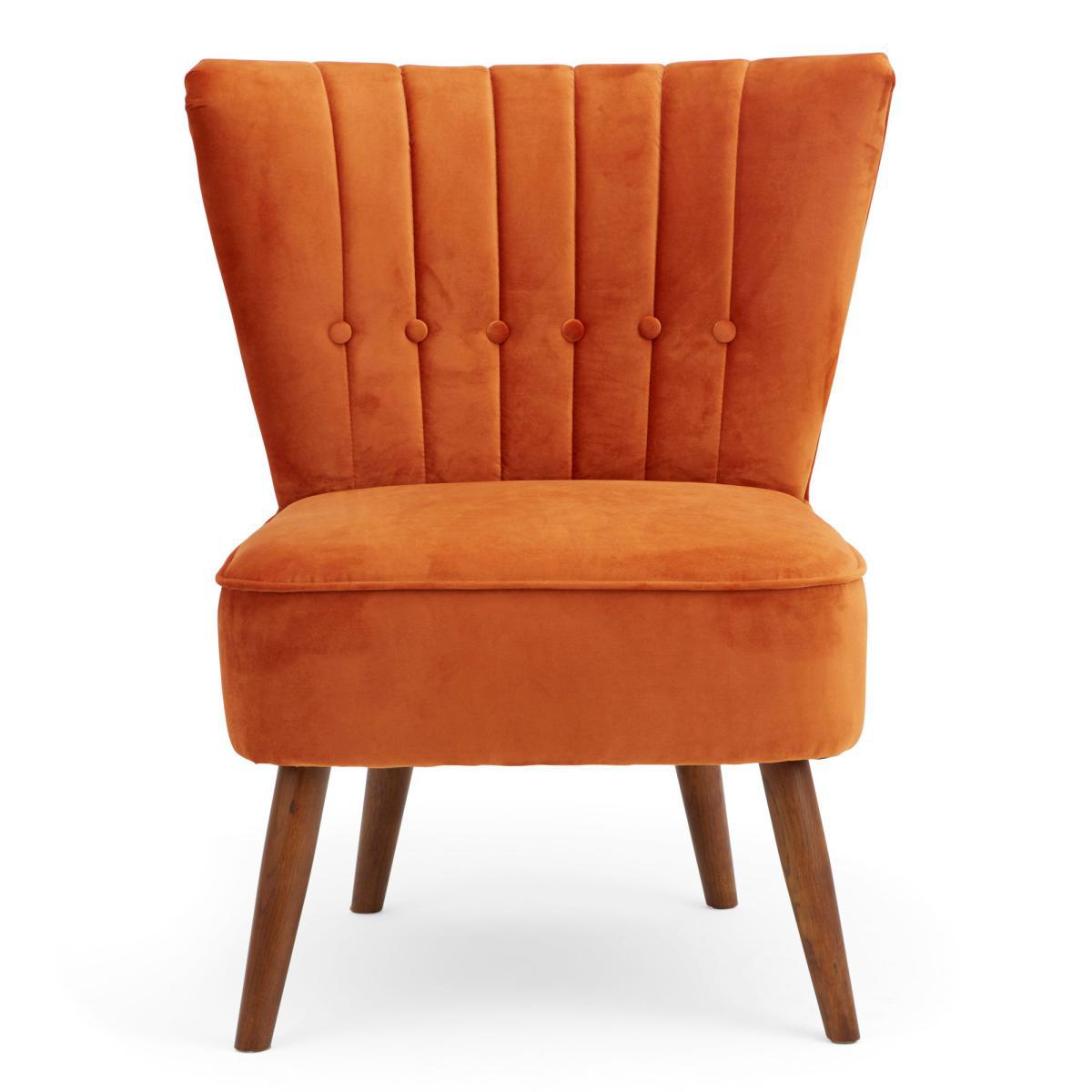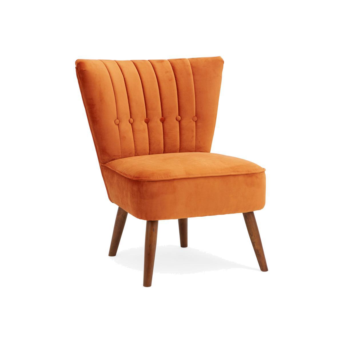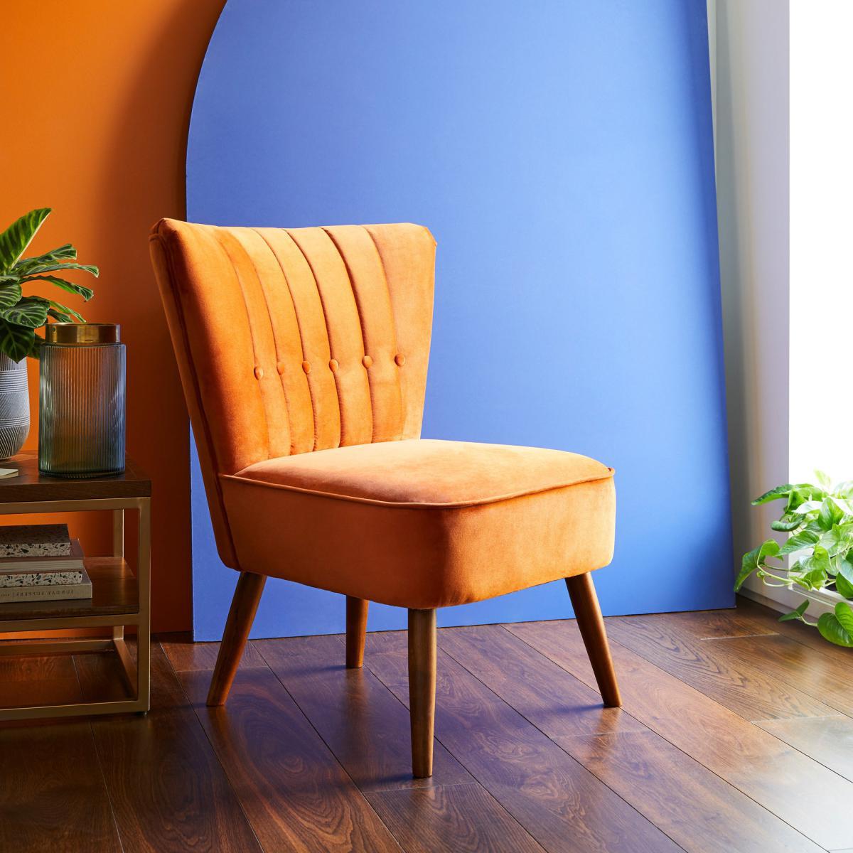 The orange velvet armchair is a great statement piece that adds colour and texture to a space. I love how its rich, vibrant hue instantly enlivens a room, making it ideal for contemporary or eclectic interiors. Its plush velvet finish also brings a touch of luxury, while the curved, slightly tapered legs keep the look modern yet understated. Practical styling tips include pairing it with neutral or contrasting coloured accessories to really make it pop or placing it alongside other bold patterns for an eclectic mix. It's versatile enough to work well in living rooms, bedrooms or even cosy reading corners, adding personality without overwhelming the space.