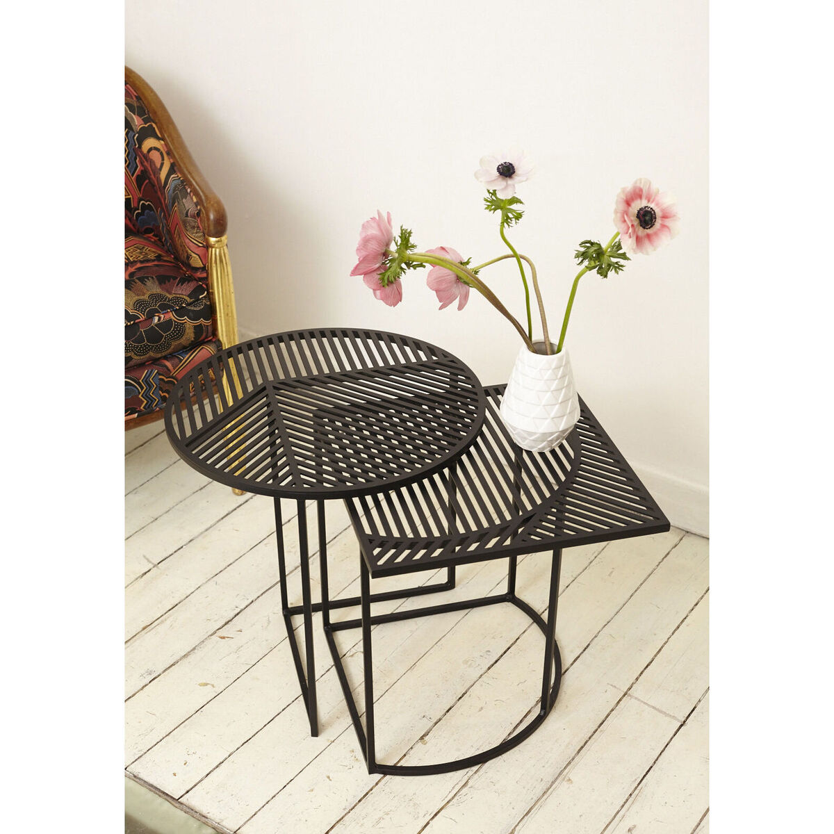 I love this small coffee table for its sleek, industrial vibe which works particularly well in modern or minimalist interiors. Its black metal finish makes it versatile enough to pair with a range of colour schemes, from neutral tones to bolder hues. For styling tips, consider using it as a statement piece by layering with a textured tray, small plants, or decorative objects to add personality. Its open, slatted top also makes it practical for selecting lightweight accessories or even as a discreet surface for books and magazines, especially in a compact living space where you want functionality without clutter.