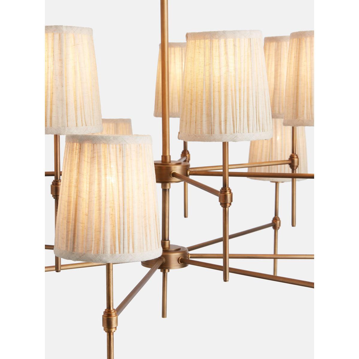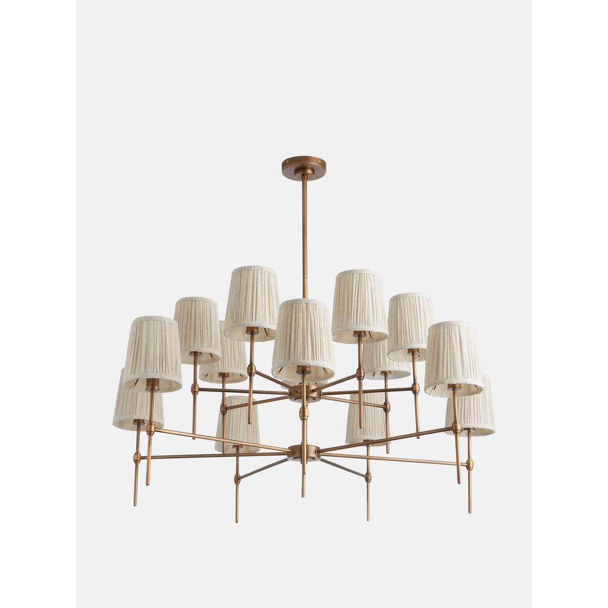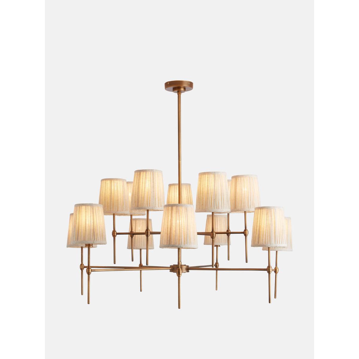 The Isobella chandelier is inspired by the traditional interiors at Babington House. Fourteen linen shades are individually lined in cotton, then pleated and trimmed by hand before being carefully wrapped around an antique brass-plated frame. Hang it in a hallway or living area to recreate the classic lighting curations at our country House. Antique brass-plated chandelier Refined stem and arm details Fourteen handmade linen shades Lined in cotton Pleated and trimmed by hand Requires 14 x E14 / max 28W bulbs Inspired by Babington House