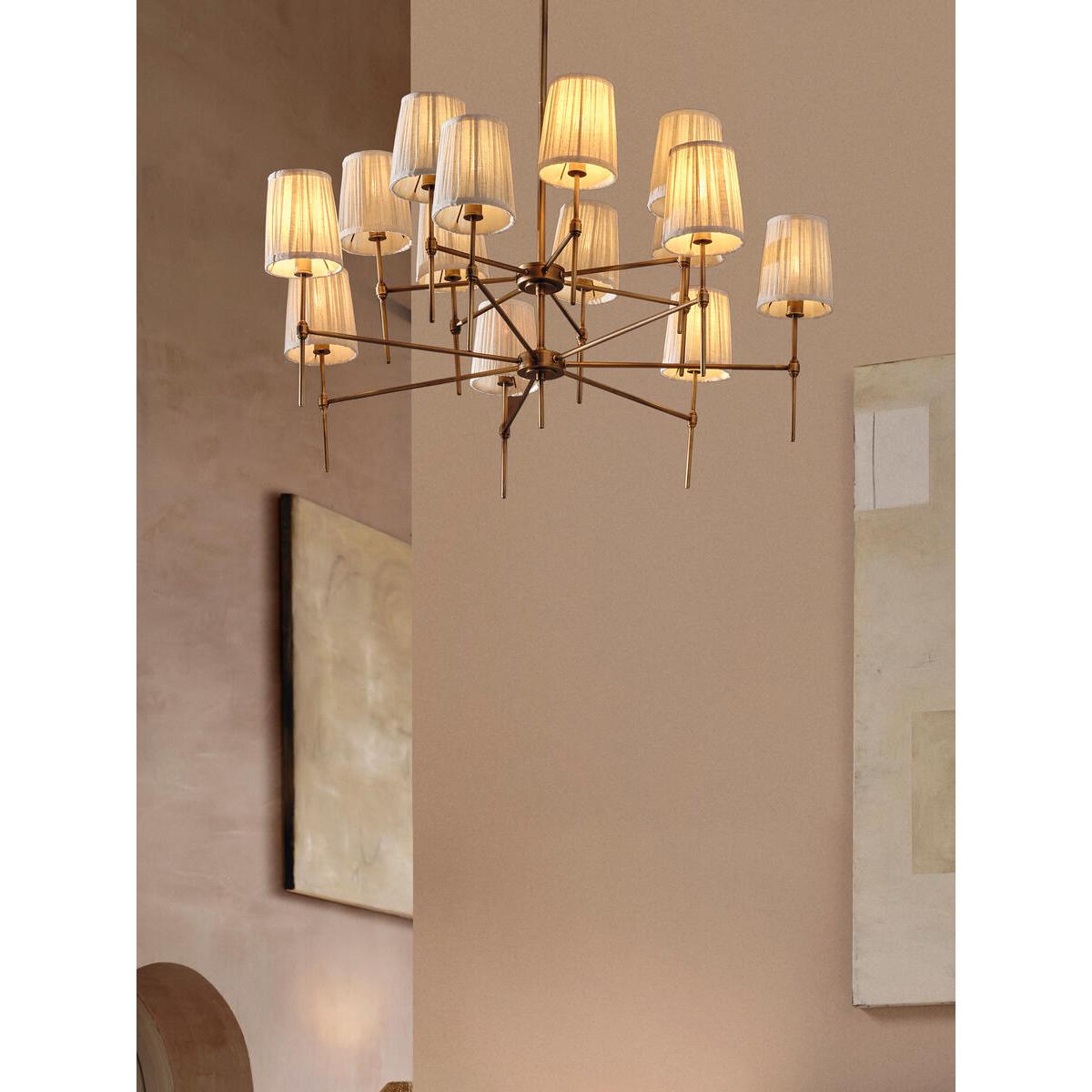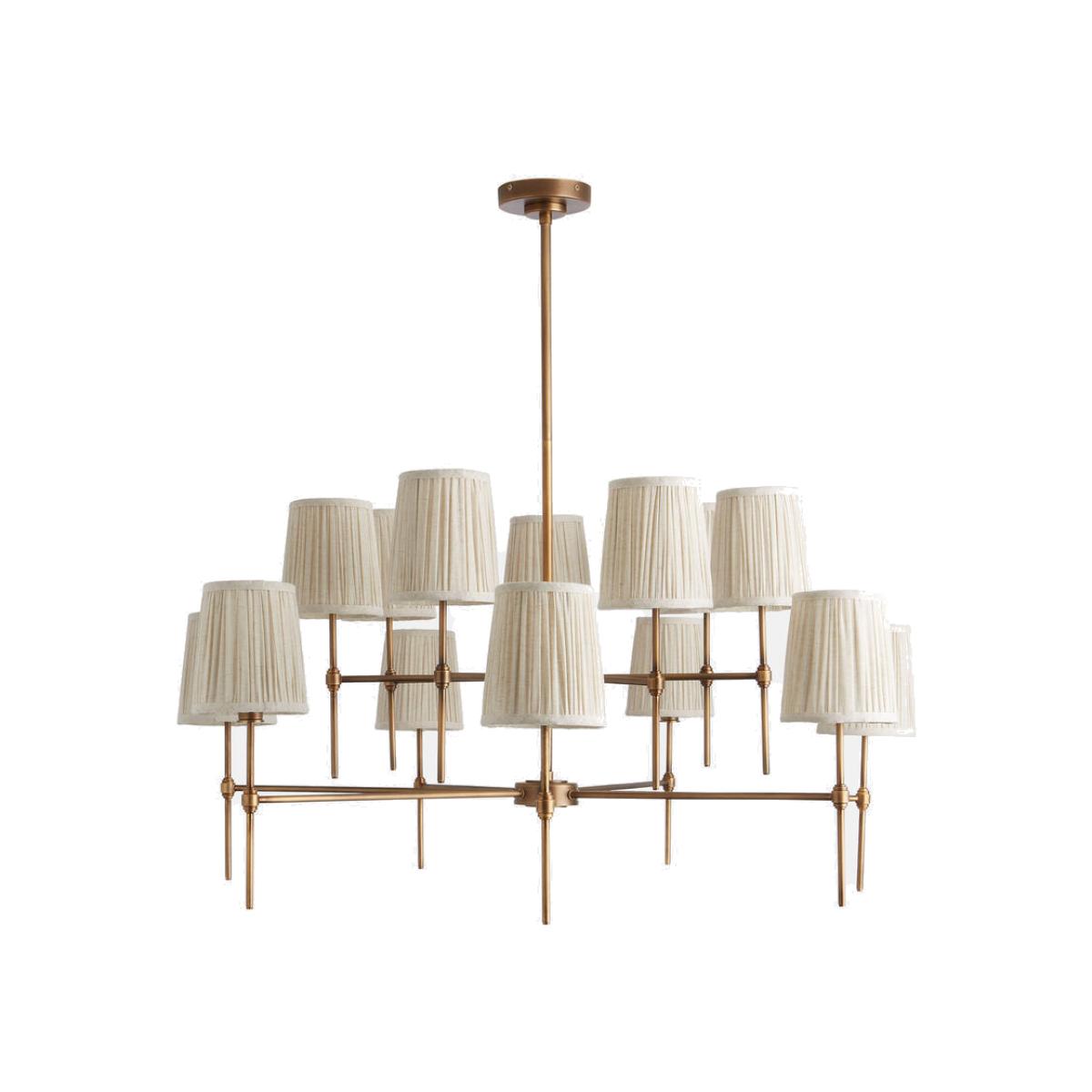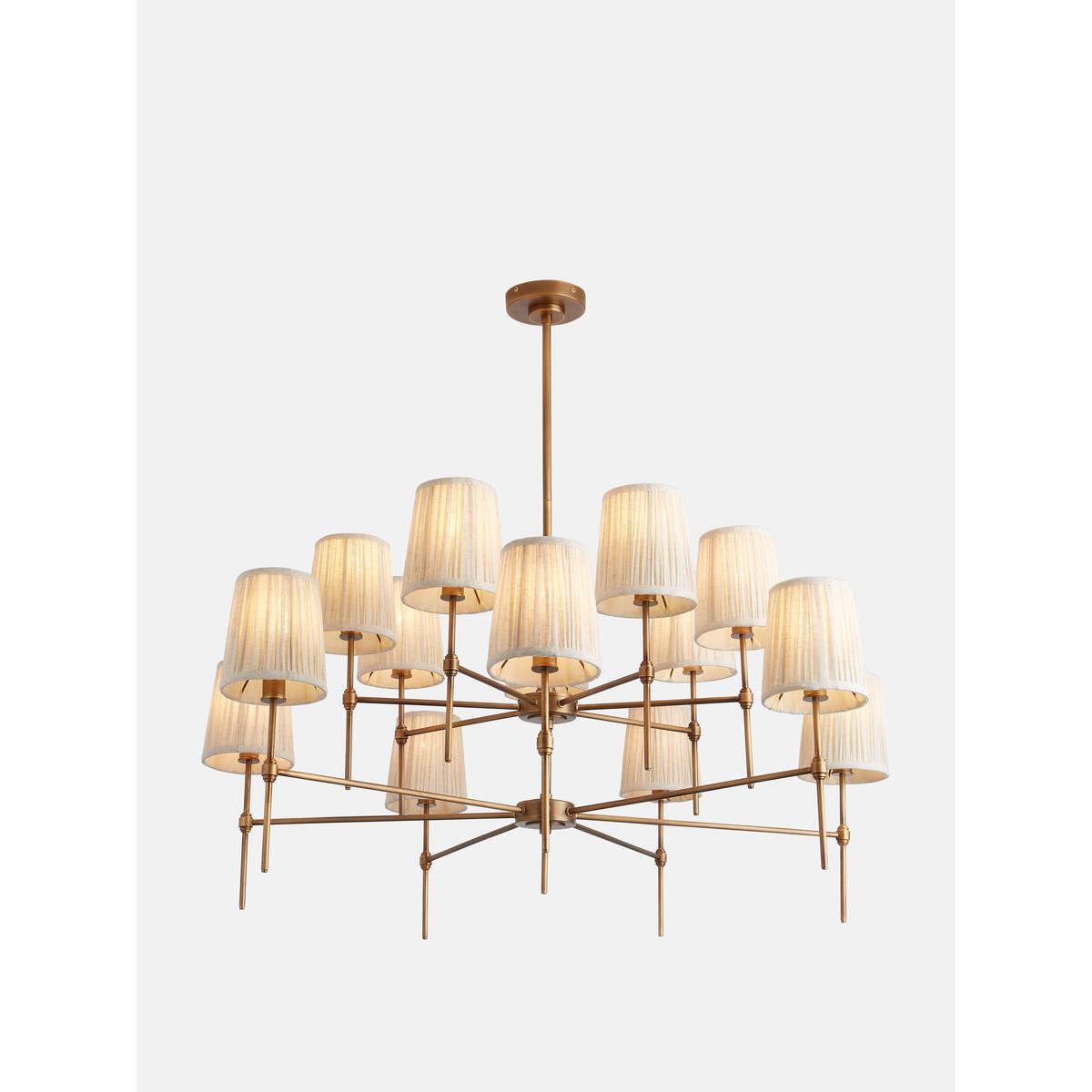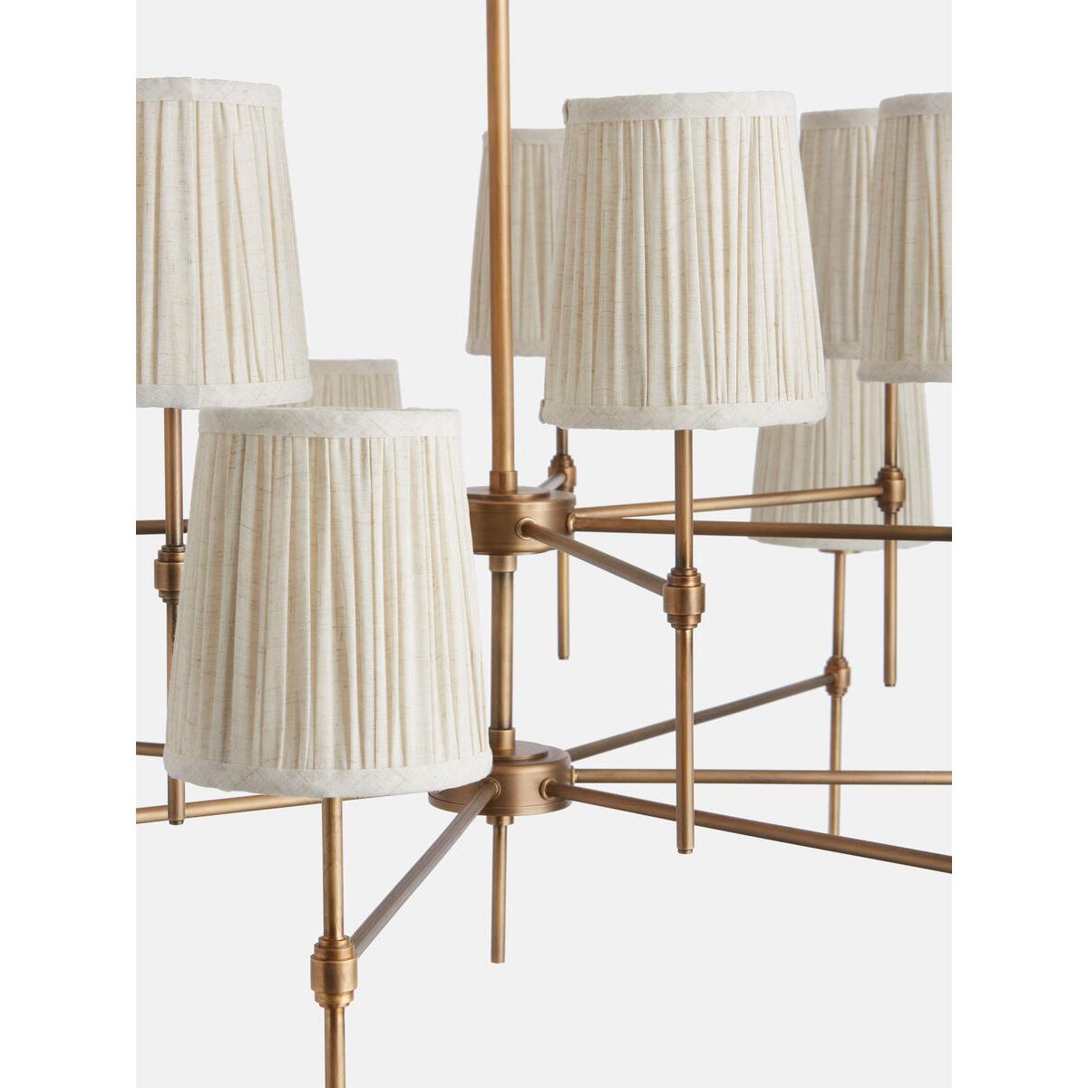 The Isobella chandelier is inspired by the traditional interiors at Babington House. Fourteen linen shades are individually lined in cotton, then pleated and trimmed by hand before being carefully wrapped around an antique brass-plated frame. Hang it in a hallway or living area to recreate the classic lighting curations at our country House. Antique brass-plated chandelier Refined stem and arm details Fourteen handmade linen shades Lined in cotton Pleated and trimmed by hand Requires 14 x E14 / max 28W bulbs Inspired by Babington House