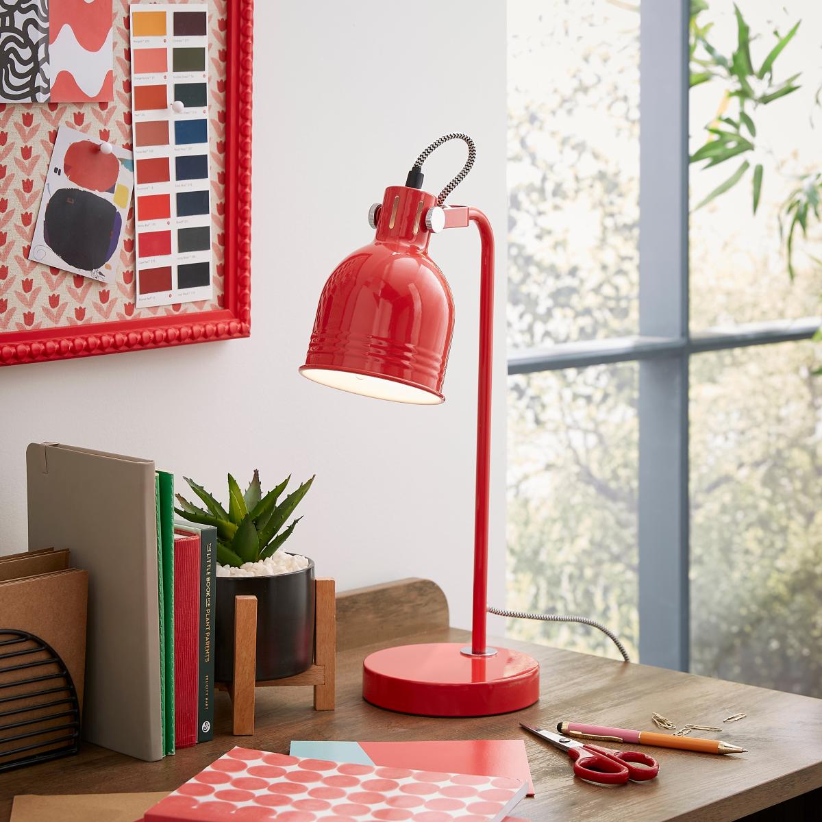I love this red desk lamp for adding a pop of colour to both modern and eclectic interiors. Its bold hue makes it a stand-out piece on a minimalist desk or a colourful workspace, while its simple silhouette ensures it can slot into various schemes without overpowering other design elements. For practical styling, consider pairing it with other vibrant accessories or contrasting textures, like matte furniture or natural wood finishes, to create an inviting and functional area. It’s perfect for a home office or study nook where you want a functional yet playful touch.