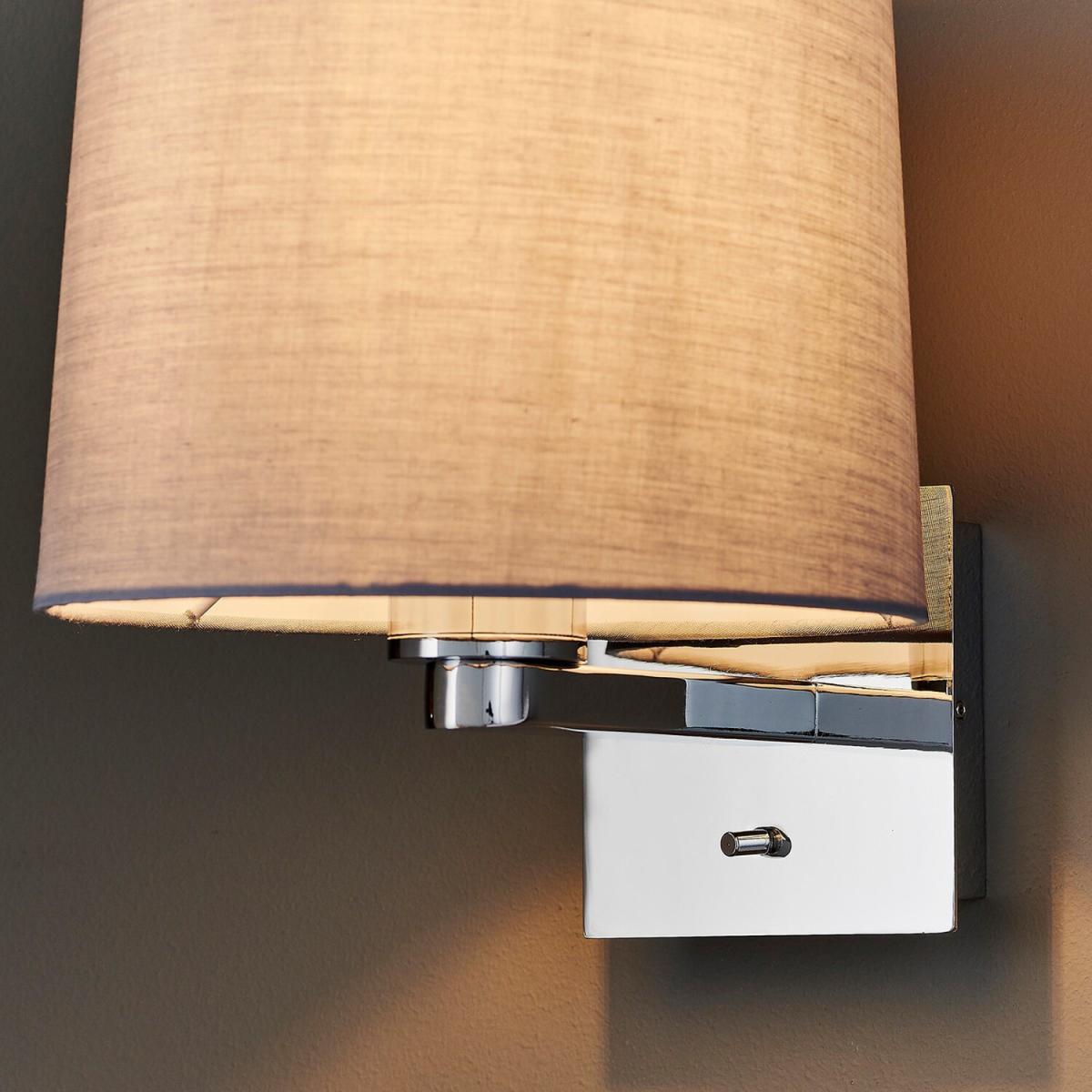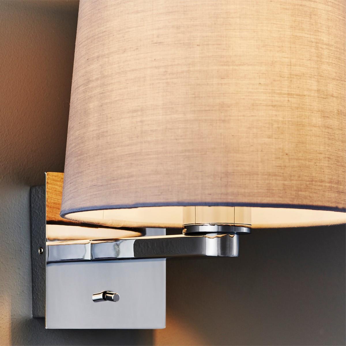 This wall light is a timeless, modern, clean line design. The perfect addition to boutique style bedrooms, finished in polished chrome plating. Featuring an easily accessible onoff switch, perfect for use with LED lamps. Supplied excluding shade for you to tailor the design to your requirements, options are cylinder, ellipse, rectangular and tapered shapes and are finished in vintage white, cool grey or taupe cotton fabric.