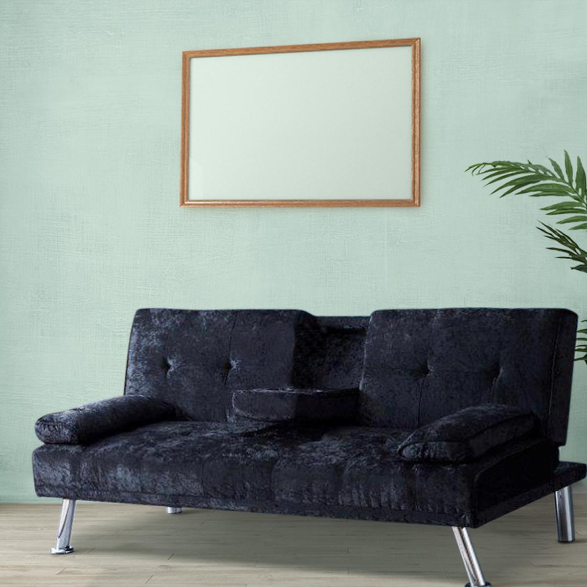 This sofa bed is a highly functional, stylish Sofa. It has a fold-down table with two drinks holders, perfect for movie nights. Made of high-quality crush velvet, this multi-functional sofa bed offers durability as well as looking great, creating a focal point in whichever room it's in. It transforms from a sofa into a bed with the additional feature of the pull-down table, providing a hassle-free solution for people staying over. This has been designed for comfort and style, with the ingenious click-clack mechanism and fantastic pull-down table it is difficult to beat. This product is finished with quality soft crush velvet and polished chrome feet. The armrests are not attached and can double up as pillows when in bed mode and can comfortably sleep, one adult. The quality and design of the sofa bed offer ease of use and reliability.
