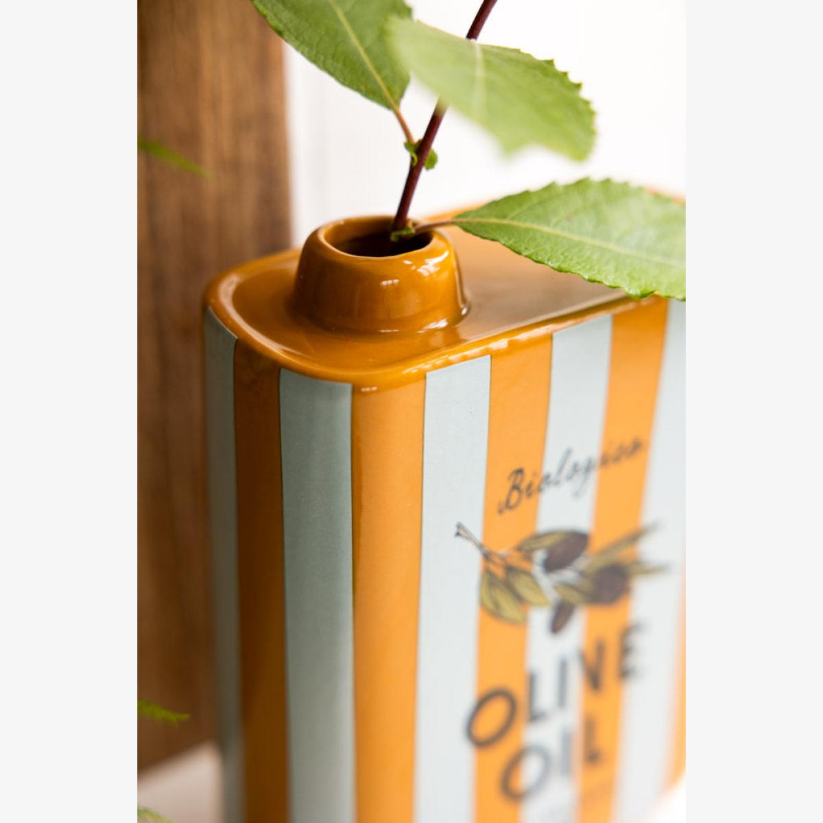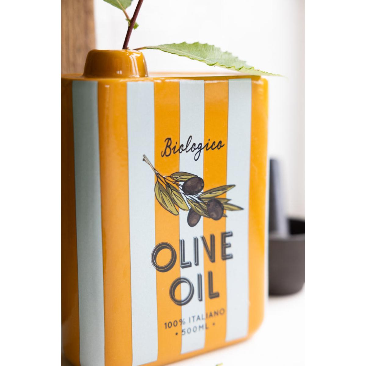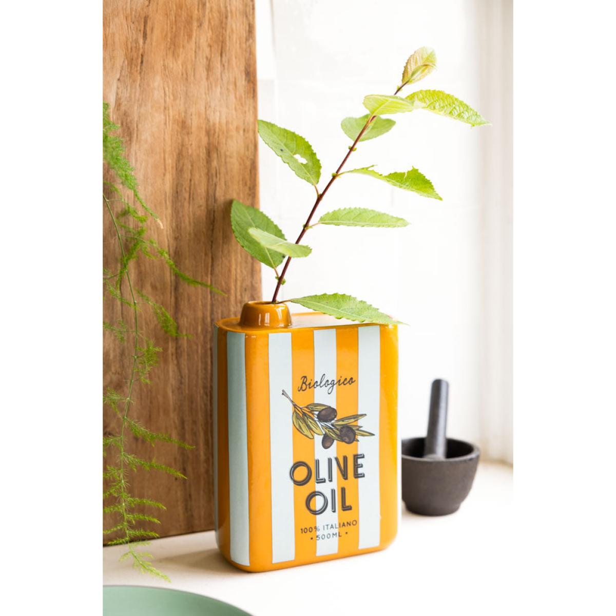 Add a pop of personality and colour to your kitchen or living room with this mustard and cream striped ceramic vase. It just oozes Italiana chic, which when combined the art deco-esque stripes and typography, makes it a striking addition to your home. Sporting a narrow neck that’s perfect for displaying one or two select blooms, it’s the vase that’s the star of this show – style against a dark wood sideboard or with a dark block tile or painted wall as a background, and enjoy the way this brightens your day. Unique and quirky, this also makes a fabulous gift. And yes – self-gifting is allowed! - Italiana Stripe Olive Oil Vase- Material: Earthenware - Measures: H17cm x W13cm x 5.5cm