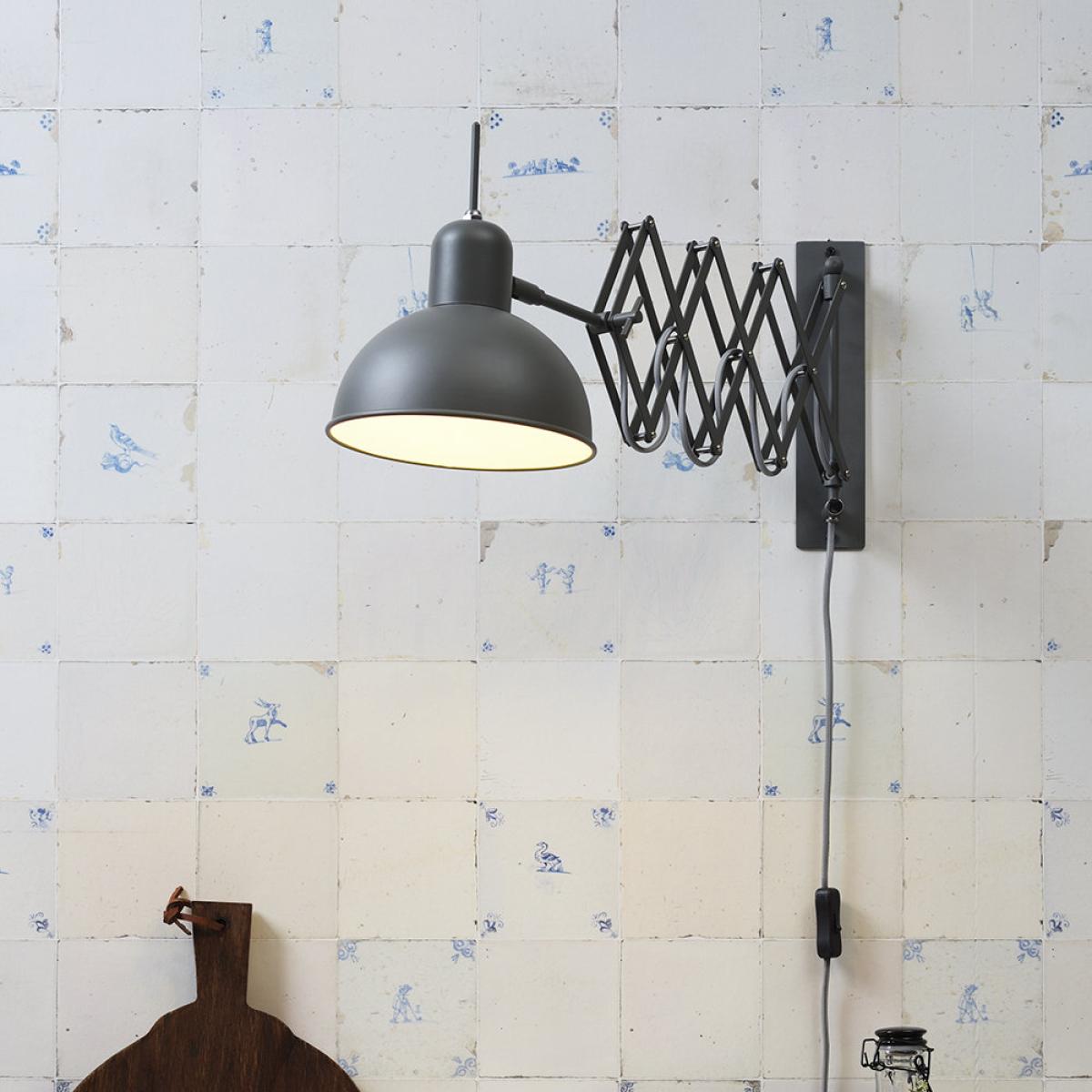 Transform your interior with the industrial style Aberdeen wall lamp from It's All About Ro. Mi. Crafted from iron, it features a distinctive scissor arm design and a round shade. Available in several colour finishes, this wall lamp will look great in the bedroom to the home office. Key features: * Material: iron * Dimensions: H27xL60-85cm adjustable * Shade: Ø20xH17cm * Bulb required: E14 40W (not included) * Cord length: 200cm * Hand switch on cable * Matt grey-green design