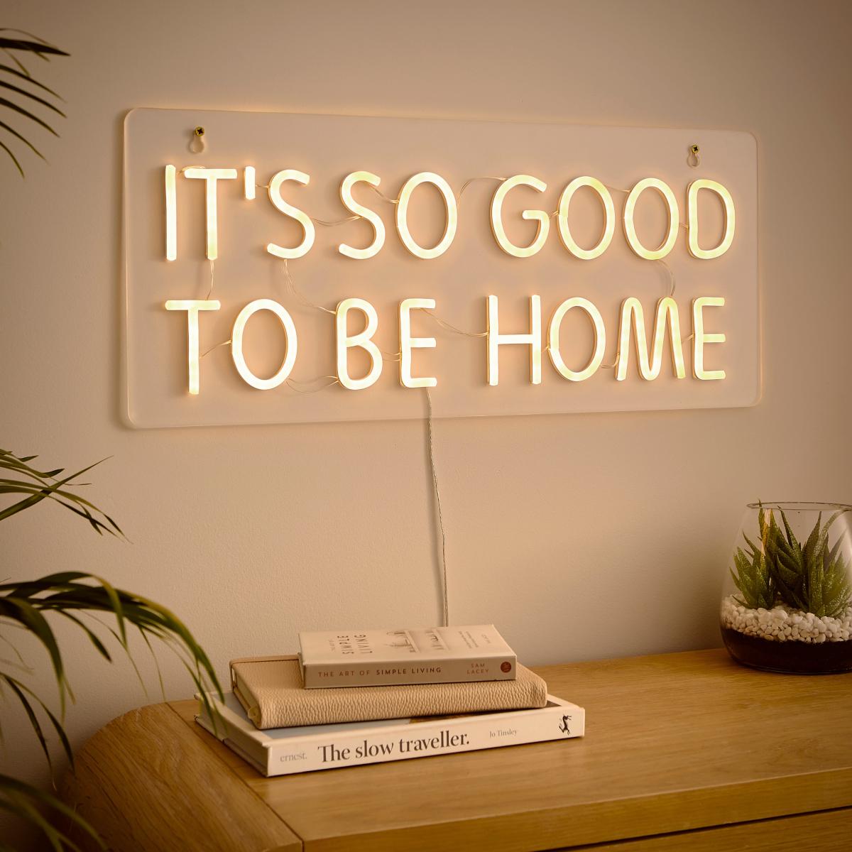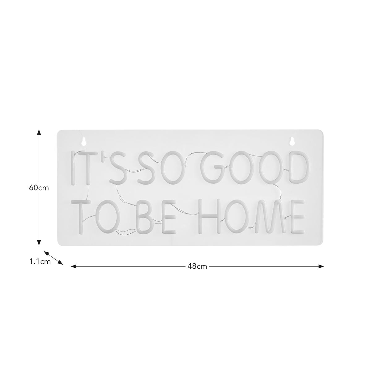 * Fun, Relatable Slogan* Soft LED Strip* Warm White Bulb Colour* Easy to Hang Brighten up your space with the " It's Good to be Home" Neon Wall Light. Its fun and relatable slogan adds a welcoming touch to any room. Featuring a soft LED strip and warm white bulb colour, it creates a cosy and ambient atmosphere, perfect for unwinding after a long day. Easy to hang, it's a hassle-free way to add personality to your hallway or bedroom.