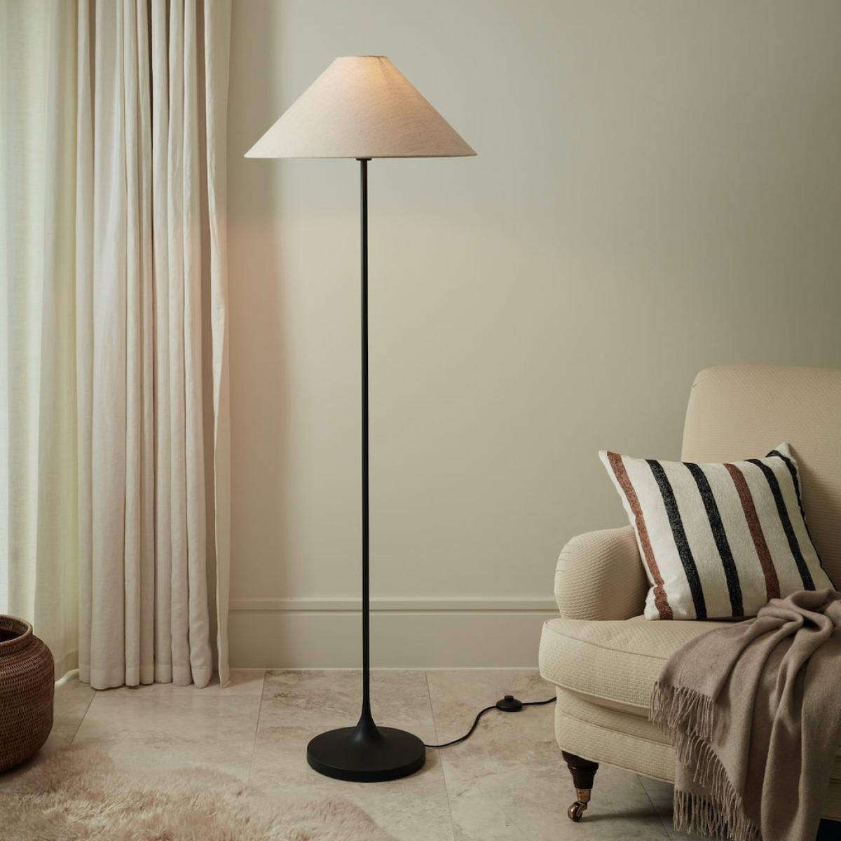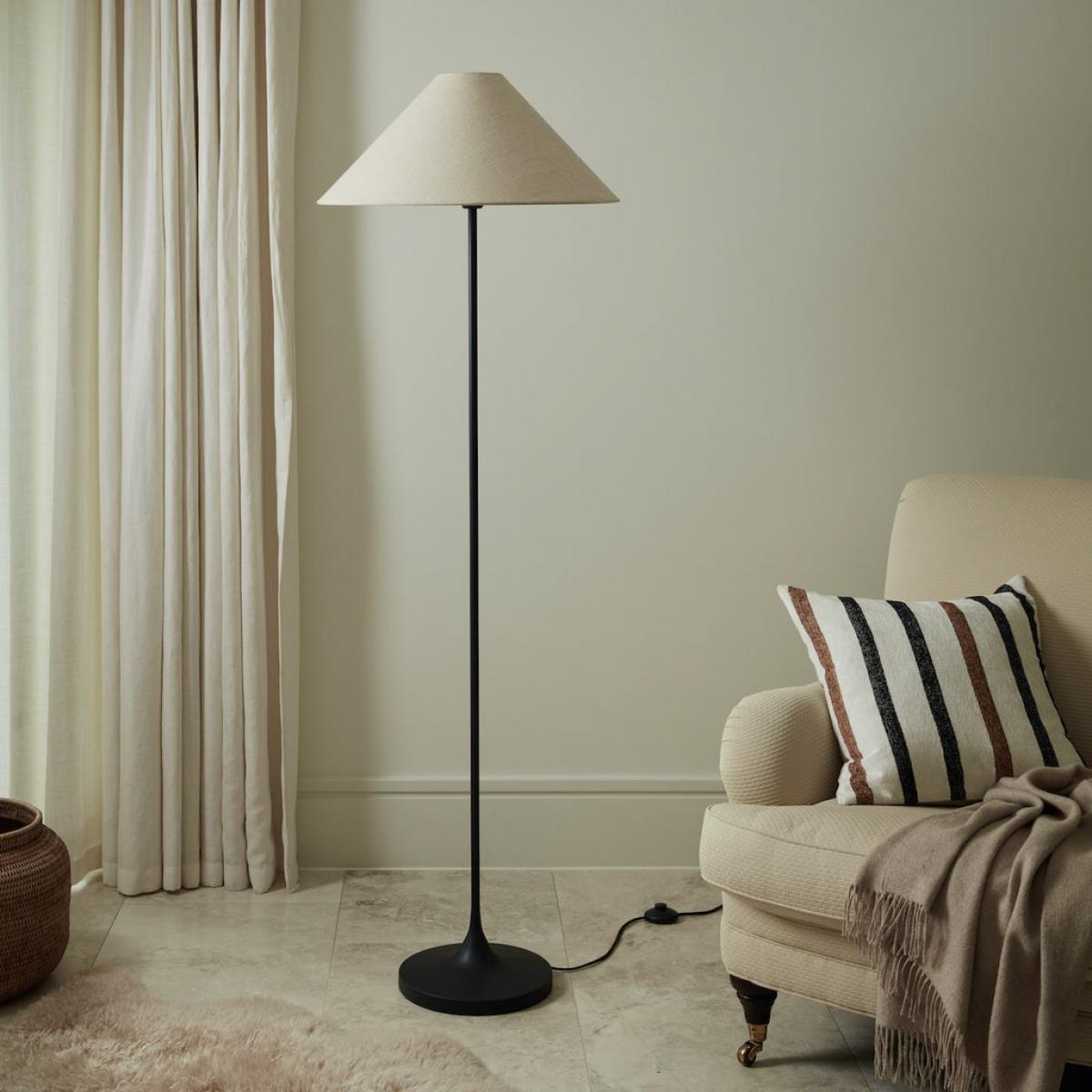 A sleek and slender floor lamp, with an on trend cone shade. The rich matt black metal is complemented beautifully by the natural tone of cotton shade and the high end look completed with a chorded lead and on/off button. A timeless piece to brighten your darkest reading corner.