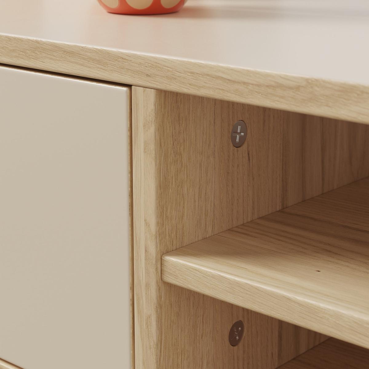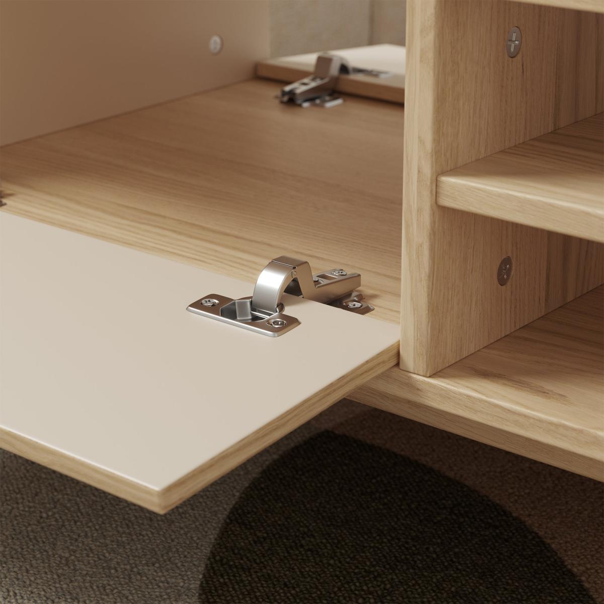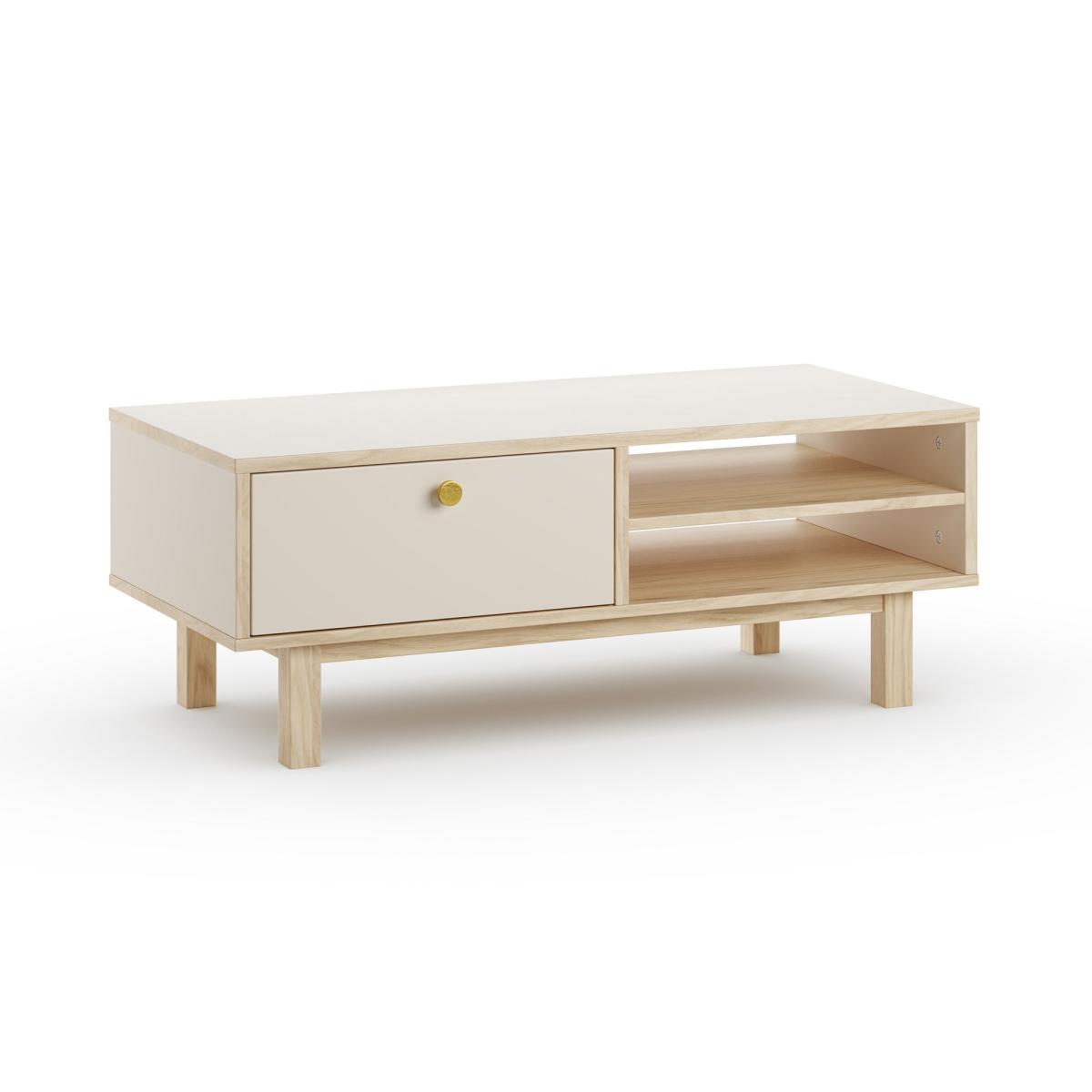 A trouble-free coffee table with everything you need and nothing you don't. The eye-catching oak effect finish is teamed with brushed gold effect handles and cupboard, while open shelves give you that extra storage space for remotes and decor.