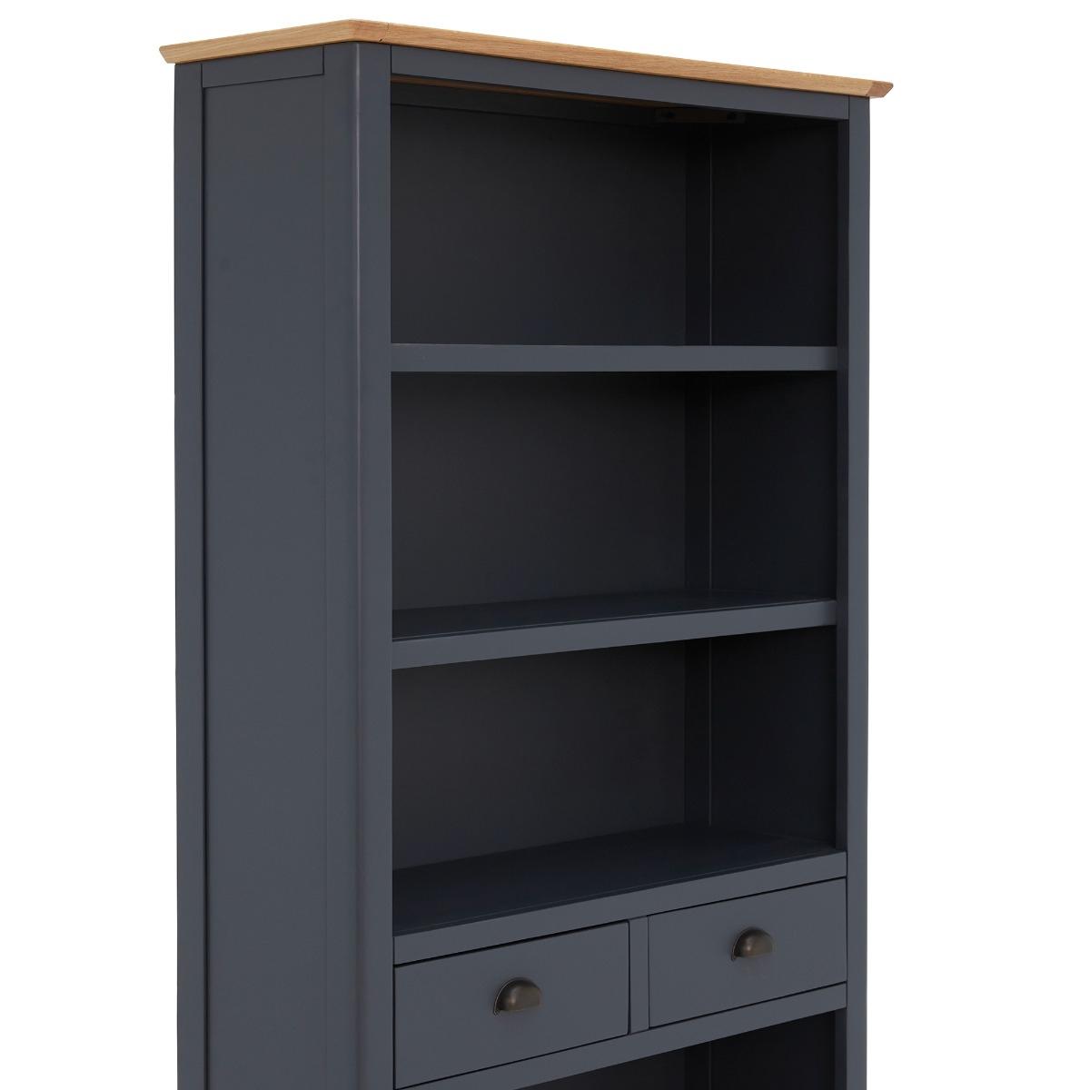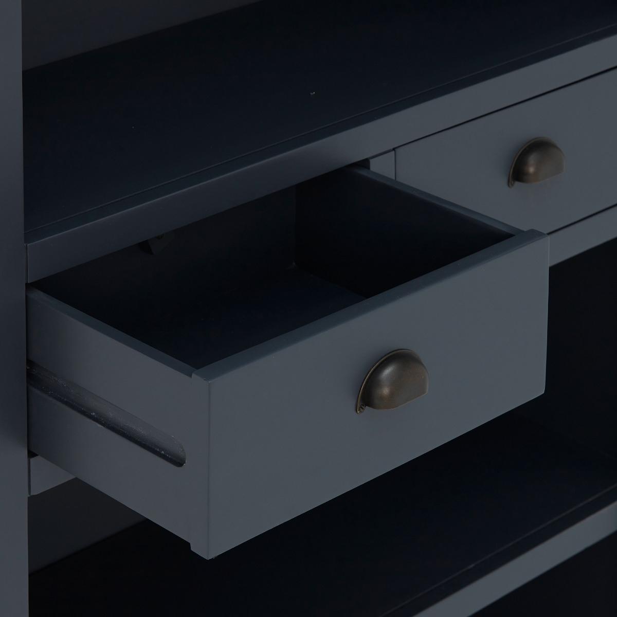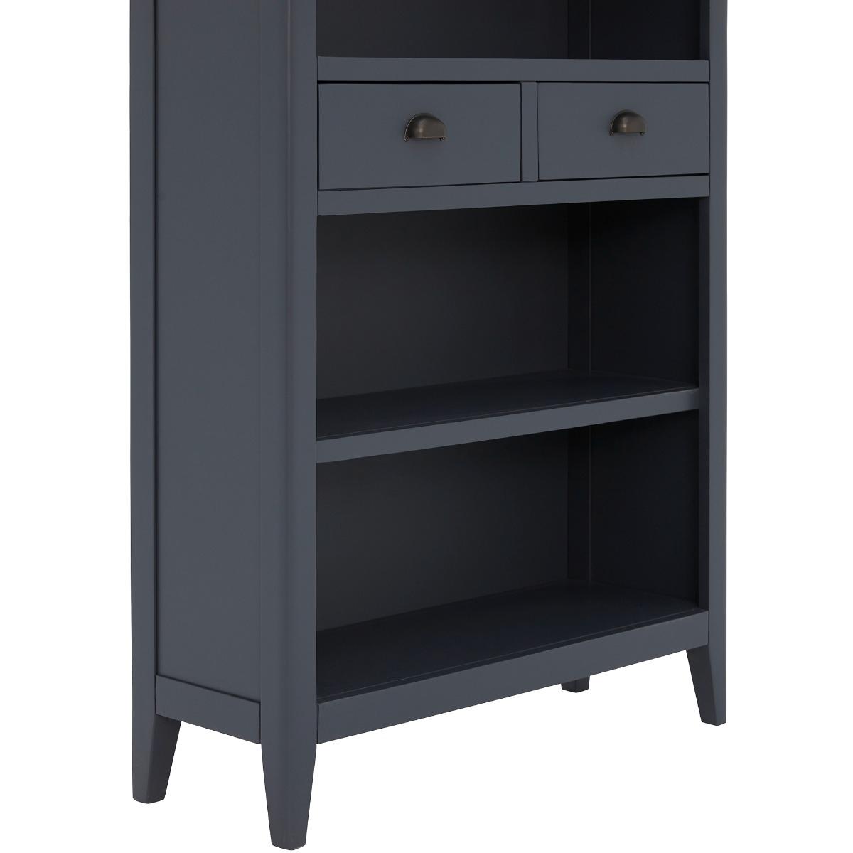 Design. With a slightly moody feel thanks to the rich colouring of the ink blue shell, the Ives 2 Drawer Tall Bookcase will create quite the statement in your living area or study. If curling up with a good book is your passion, it is important they are stored away neatly and displayed with pride, as well as any ornaments, trinkets, and plants to add character to the room. The Ives Tall Bookcase, complete with two handy drawers for further subtle storage, is sure to be a practical and stylish furniture piece to add to your home.
