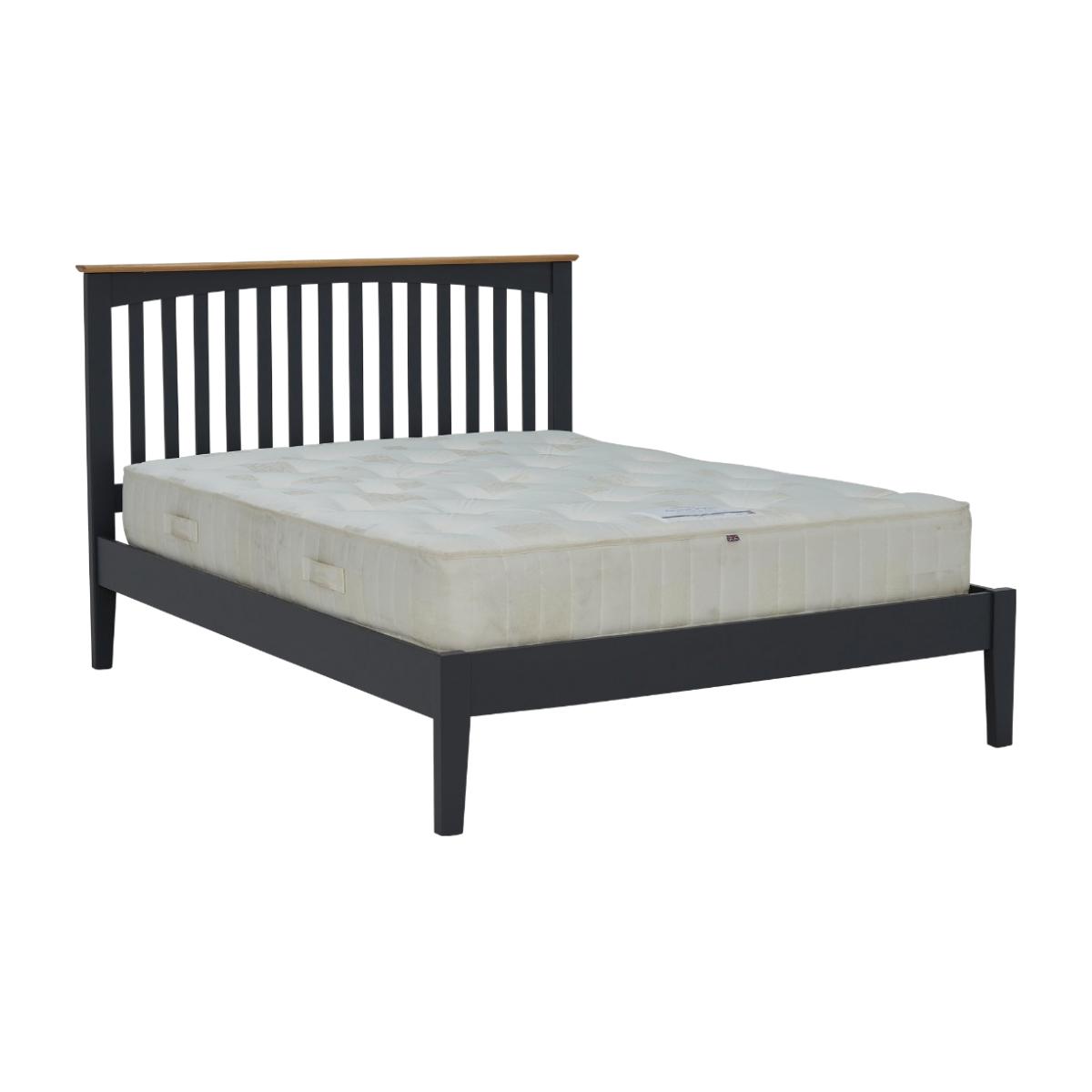 Design. Simplistic yet eye-catching, the Ives Bed Frame showcases a traditional shape with the gorgeous deep blue paint adding that modern sophistication to your room. The slim legs elevate the stylish Ives Bed Frame from the ground, creating plenty of space beneath for you to store away items and keep everything neat and tidy. The deep shade of the paint, completed with a natural oak top along the headboard, allows you to design the rest of the room's interior to your taste, with plenty of scope to add more colours or keep it neutral.