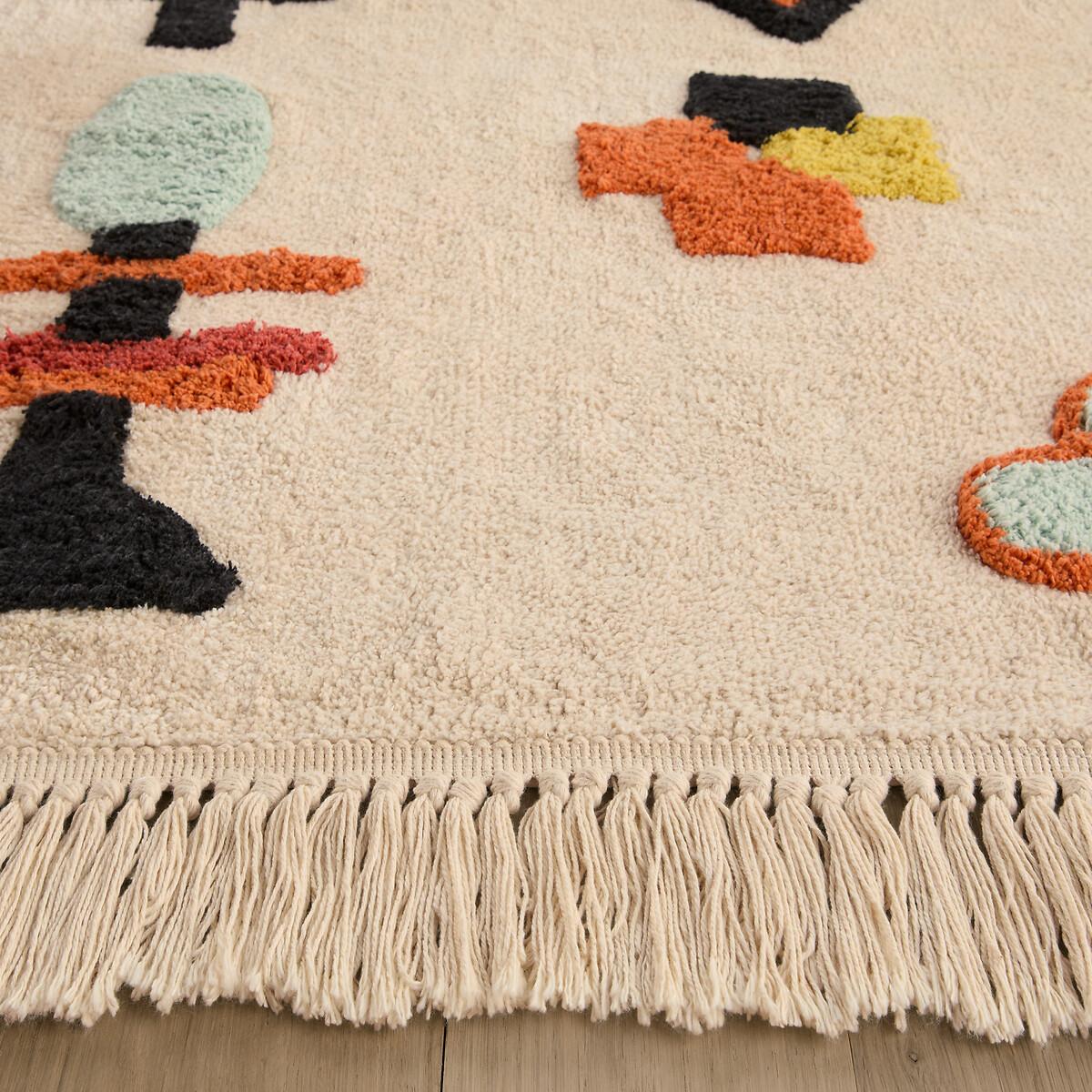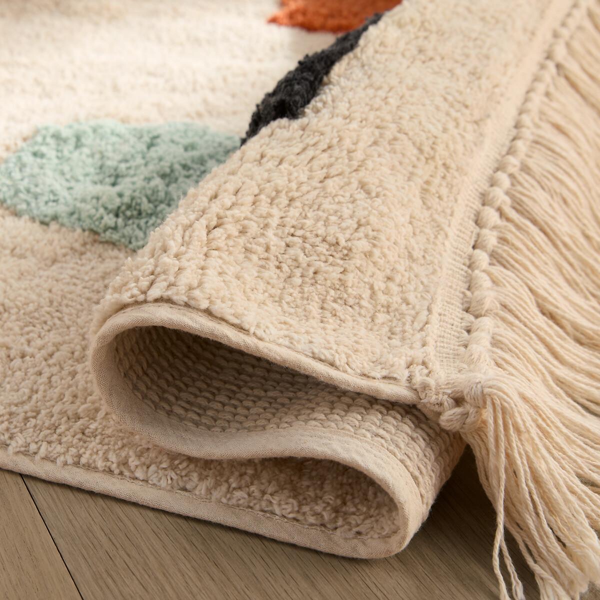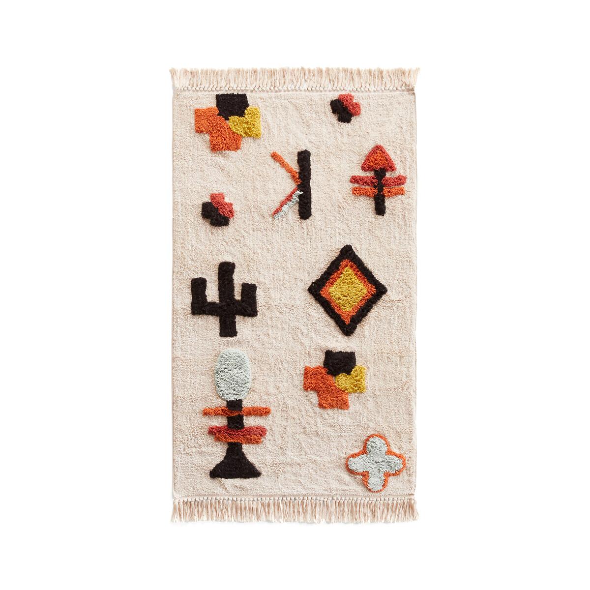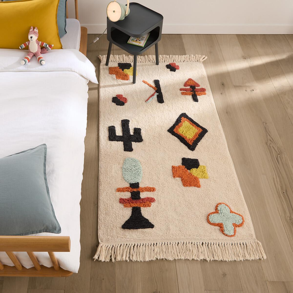 Beautiful and colourful embroidered tribal designs to decorate your child's room. This rug is very soft and will allow your child to play while insulating themselves from the cold.. Product Details • 100% cotton • Weight: 1600g/m² • Organic cotton • Craftsmanship: Hand tufted • Fringed trim. Quality Info • Cotton is soft to the touch and fluffy. The cotton rug is easy to maintain, it will also be a good thermal and sound insulator. Care Advice • Machine washable at 30°C • Vacuum regularly. Sizes • Width 80 x Length 140cm • Cotton from organic farming. Organic farming does not use any chemicals, pesticides, insecticides or GMOs. Produced with minimal impact on biodiversity. Dimensions and weight of parcel • L83 x H12 x D12cm, 2.3kg