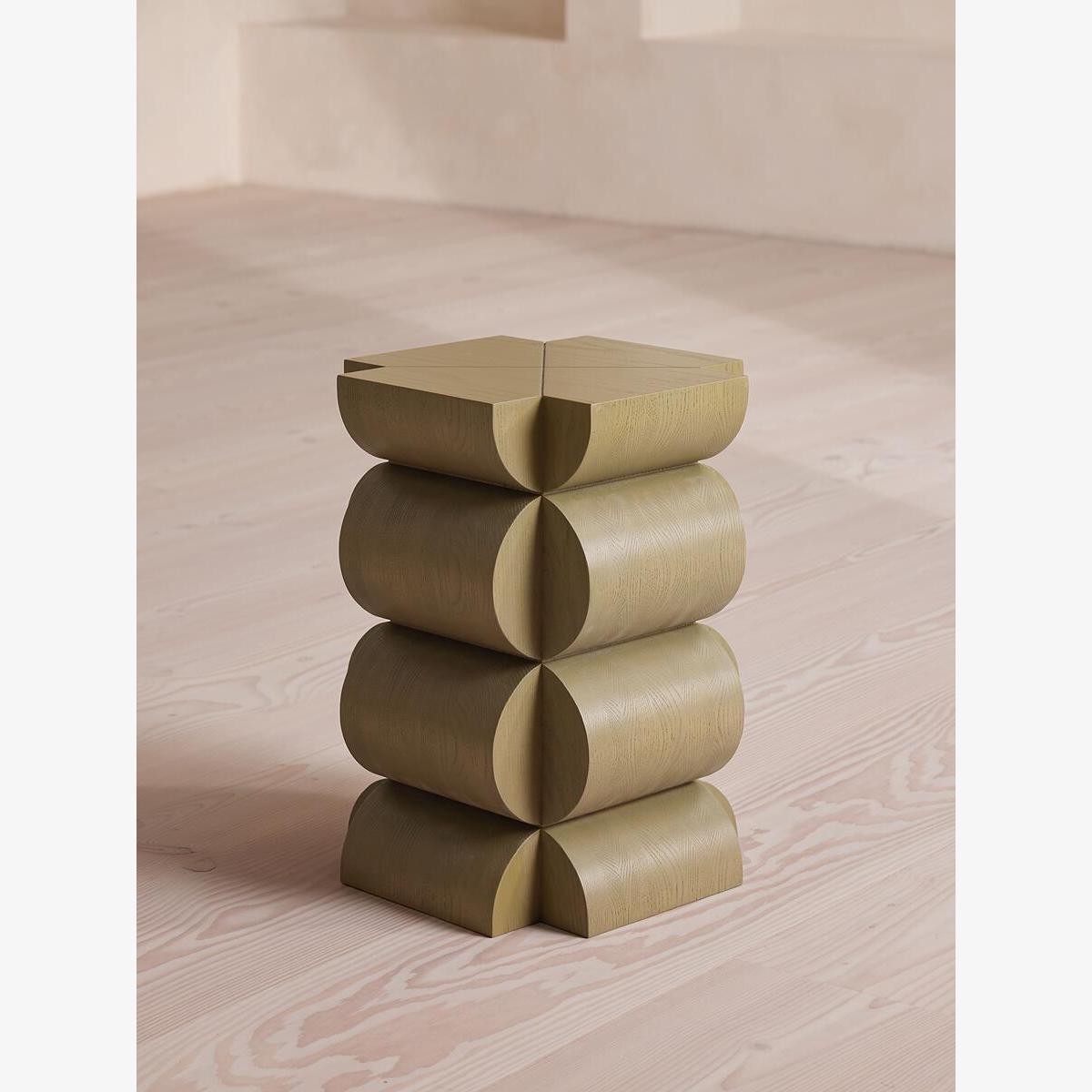 The stacked, semi-circular silhouette of this side table has been carved from solid oak wood. Taking cues from the various shades of green seen throughout Little House Balham, the Ivor side table is carved from solid oak and finished with an olive green stain.