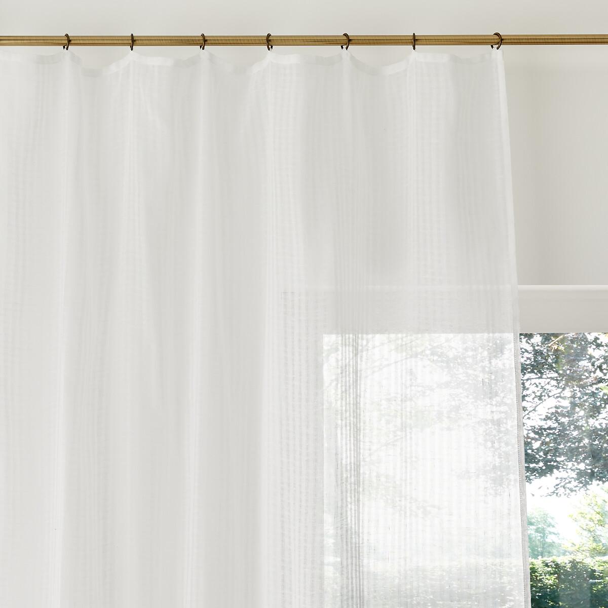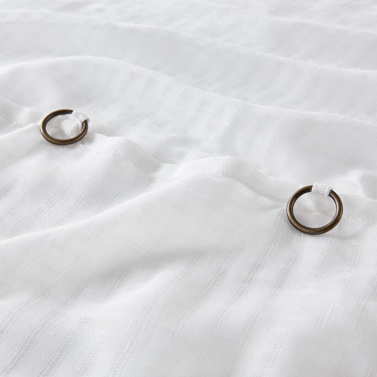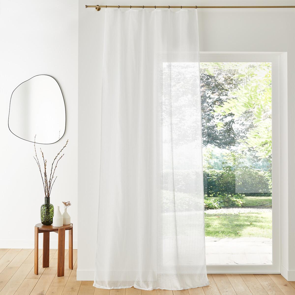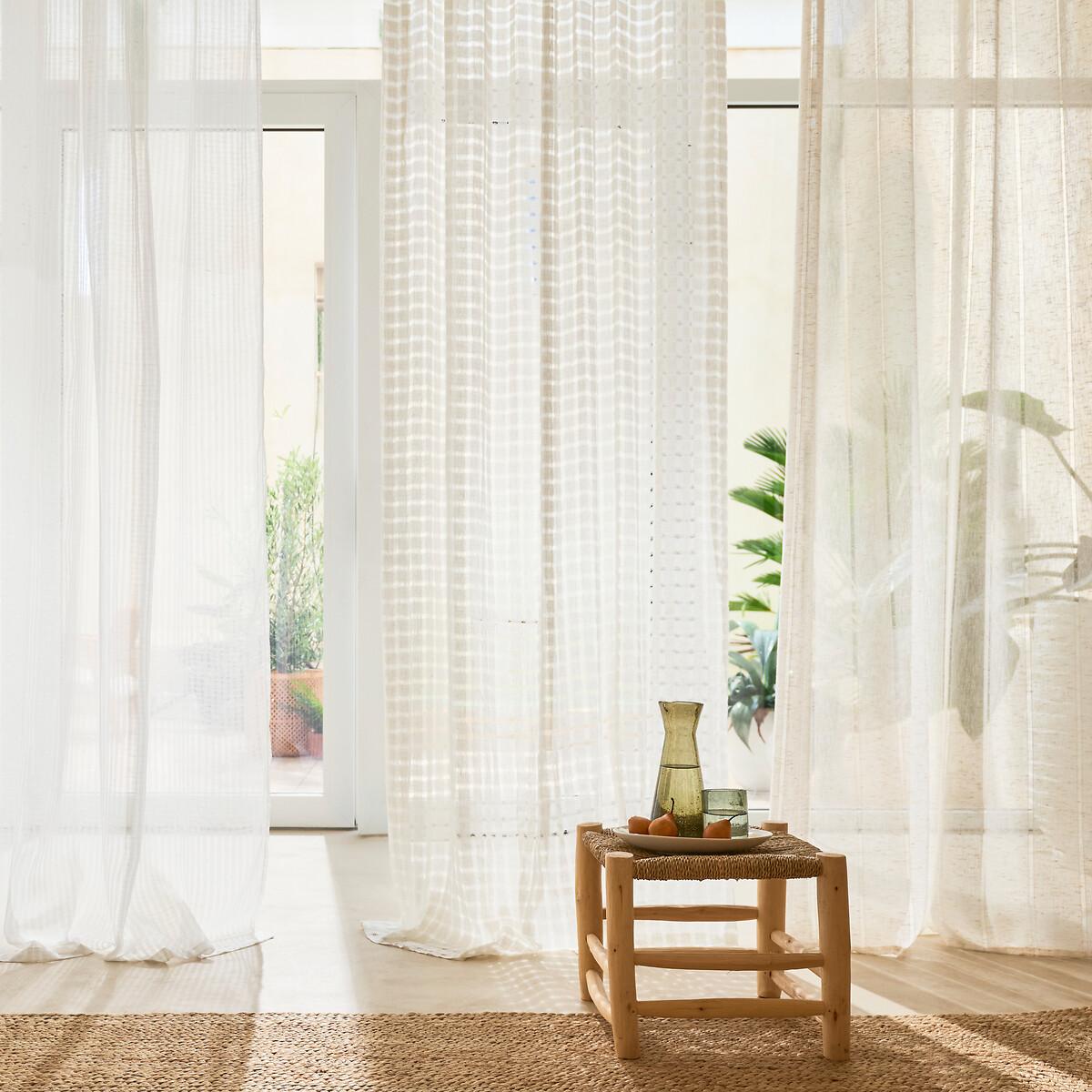 With its openwork check pattern, the Ivory sheer curtain showcases an elegant and light graphic universe. It filters light, while protecting from outside eyes. Perfect for creating a cosy atmosphere in a room. The eyelets guarantee nice regular waves and ensure the fabric falls beautifully. They slide easily over the rod, making it easy to open and close the curtain. Product Details • 100% polyester • Openwork check patterns • Small bronze-coloured eyelet finish • Inner diameter of eyelets: 2.5cm • Stitched hem Care instructions • Machine washable. Size • Drop 280 x Width 140cm • Recycled polyester. Using recycled polyester is all about conserving resources and reducing waste. • OEKO-TEX® Standard 100. Standard 100 certification by OEKO-TEX® tests textile products for harmful substances via an independent, international label.