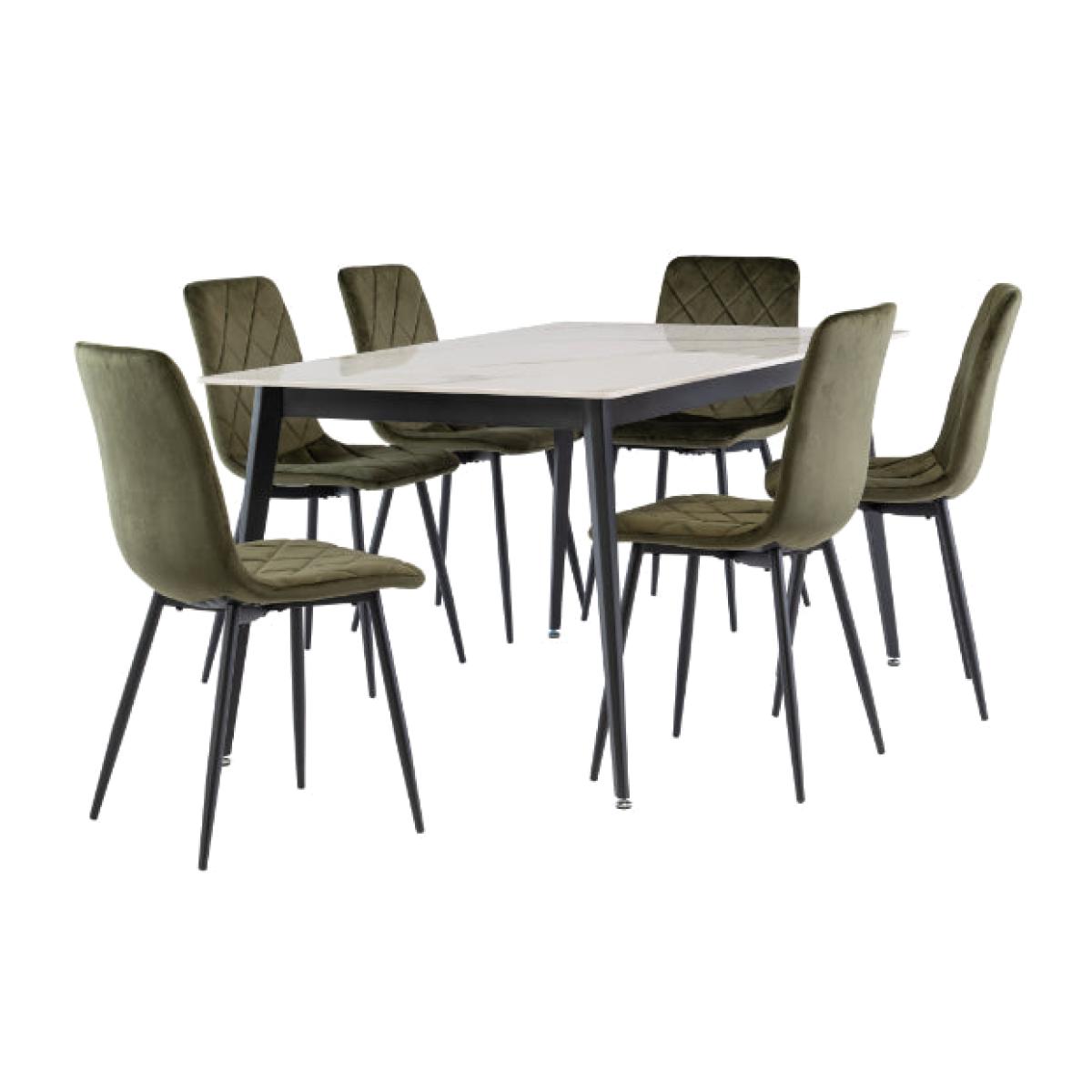 The Ivy Dining Set delivers contemporary dining room style. The Ivy table offers relaxed modern elagance and is a perfect solution for a compact dining room. This table will make a statement in any dining room with a sleek sintered stone top and quality black powder-coated legs. Designed for everyday living, this table comfortable seats 6 people. The chairs are curved, elegant, and sultry. Exquisitely tailored in a stunning cross-stitch velvet fabric and finished with black powder-coated legs. Sintered stone is an engineered surface material composed of natural minerals, such as quartz, porcelain, and minerals. It undergoes a high-heat, high-pressure sintering process, resulting in a dense, durable, and versatile material used in countertops, flooring, and architectural applications. A dining table with a sintered stone top offers durability, resistance to heat, scratches, and stains. It's easy to clean, non-porous, for a stylish and low-maintenance dining experience. To clean a sintered stone table top, use a mild, p. H-neutral cleaner and warm water. Wipe gently with a soft cloth or sponge, avoiding abrasive or acidic cleaners. Routine cleaning maintains its appearance and durability. The Ivy Dining Set delivers contemporary dining room style. The Ivy table offers relaxed modern elagance and is a perfect solution for a compact dining room. This table will make a statement in any dining room with a sleek sintered stone top and quality black powder-coated legs. Designed for everyday living, this table comfortable seats 6 people. The chairs are curved, elegant, and sultry. Exquisitely tailored in a stunning cross-stitch velvet fabric and finished with black powder-coated legs. Sintered stone is an engineered surface material composed of natural minerals, such as quartz, porcelain, and minerals. It undergoes a high-heat, high-pressure sintering process, resulting in a dense, durable, and versatile material used in countertops, flooring, and architectural applications. A dining table with a sintered stone top offers durability, resistance to heat, scratches, and stains. It's easy to clean, non-porous, for a stylish and low-maintenance dining experience. To clean a sintered stone table top, use a mild, p. H-neutral cleaner and warm water. Wipe gently with a soft cloth or sponge, avoiding abrasive or acidic cleaners. Routine cleaning maintains its appearance and durability.