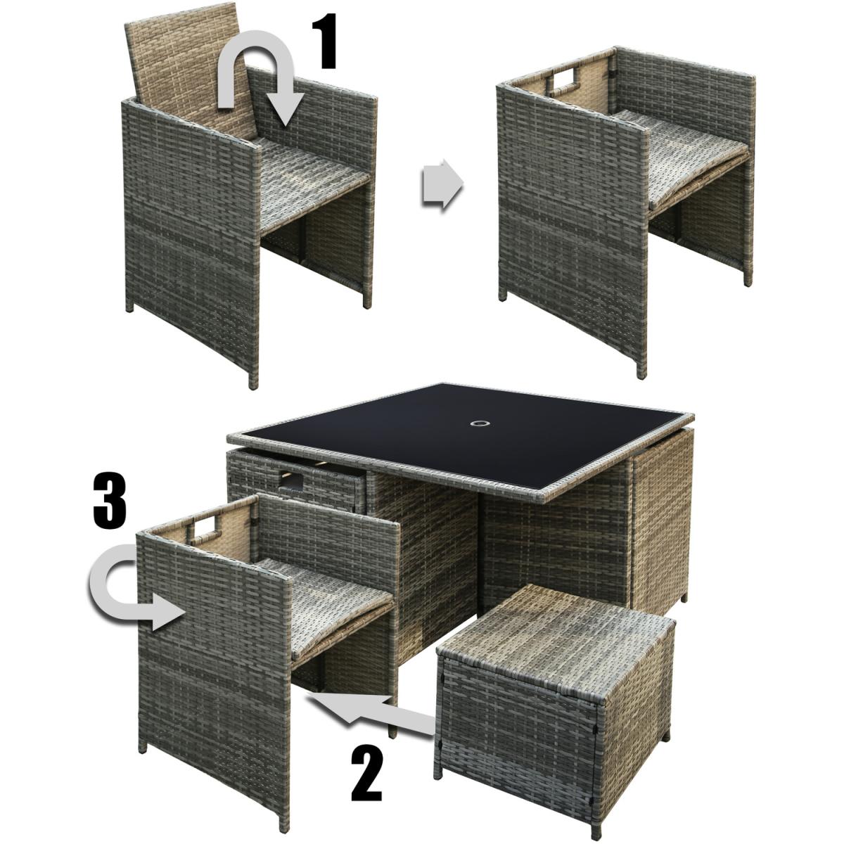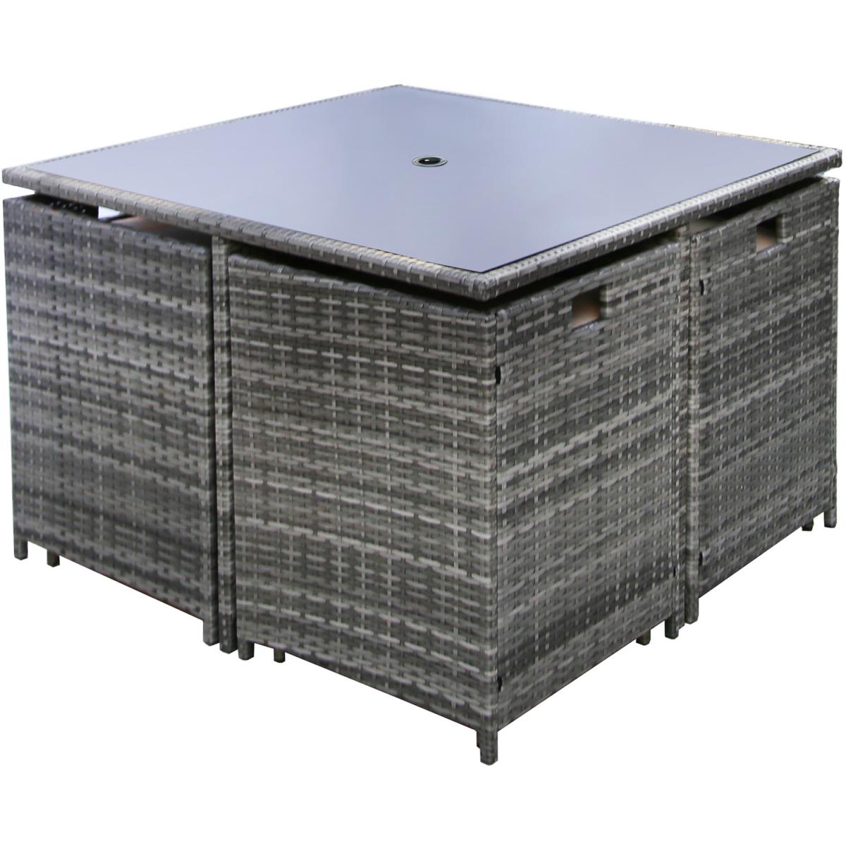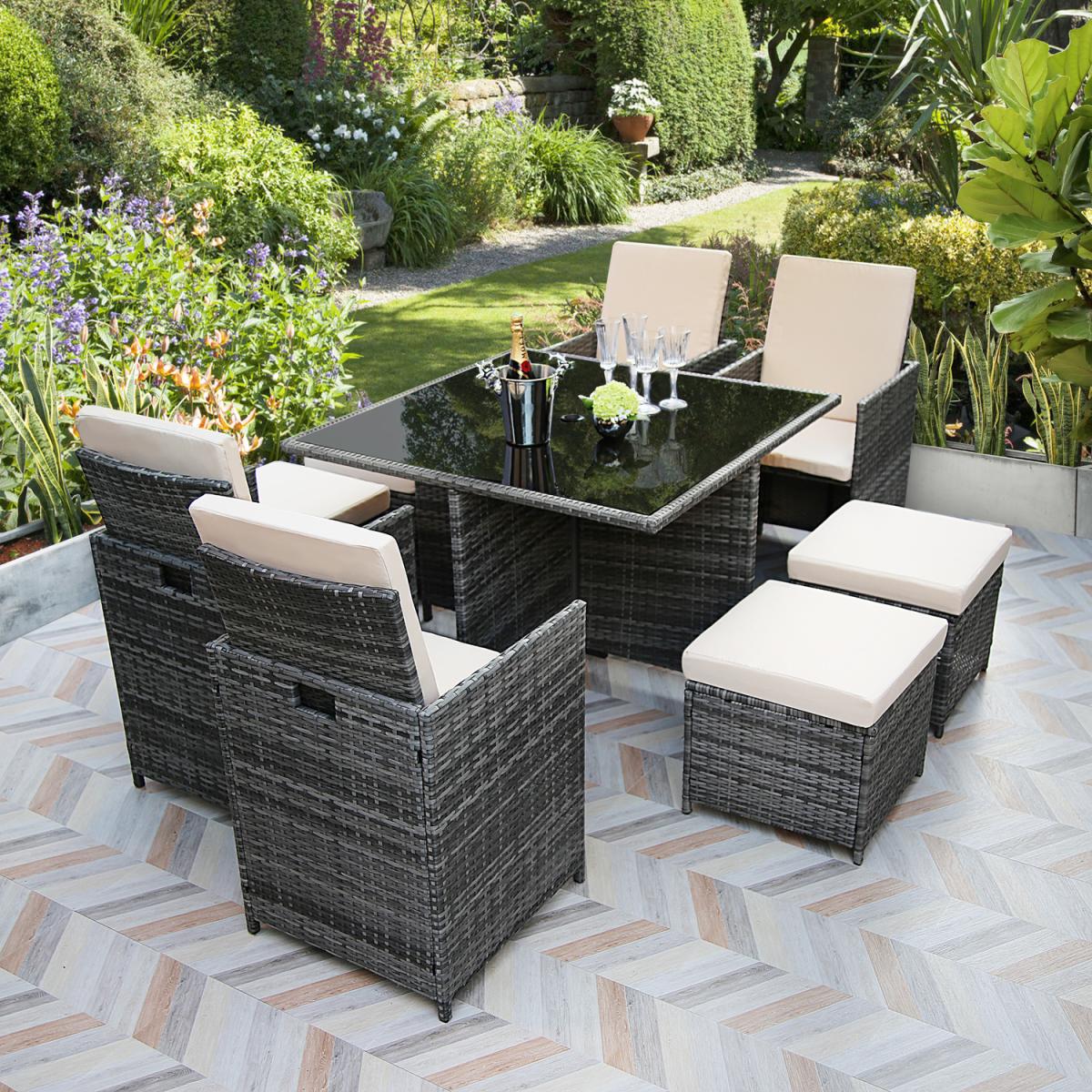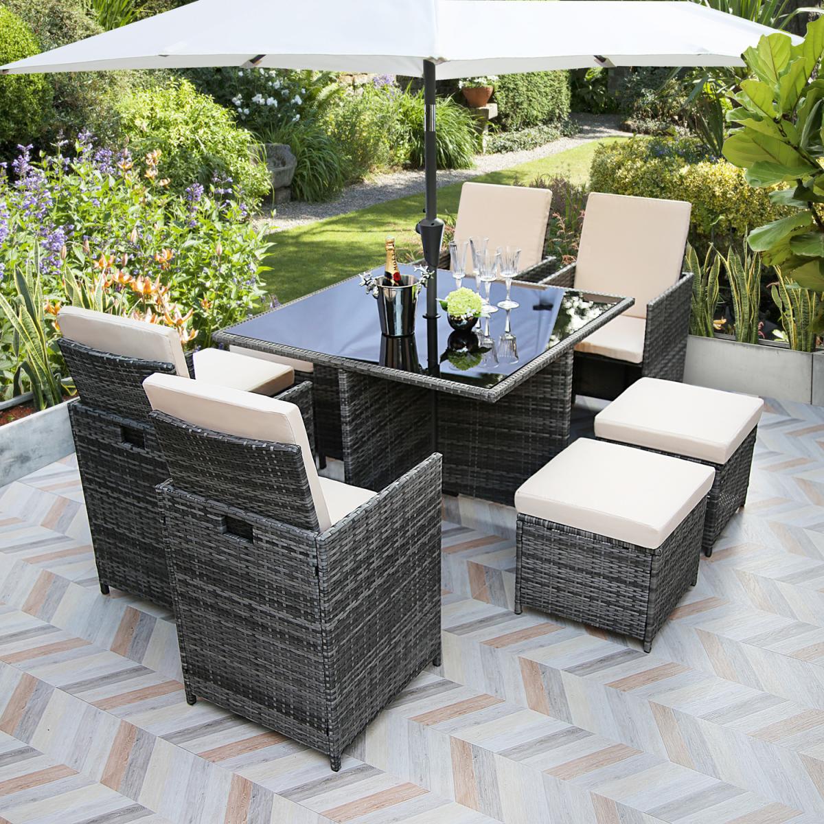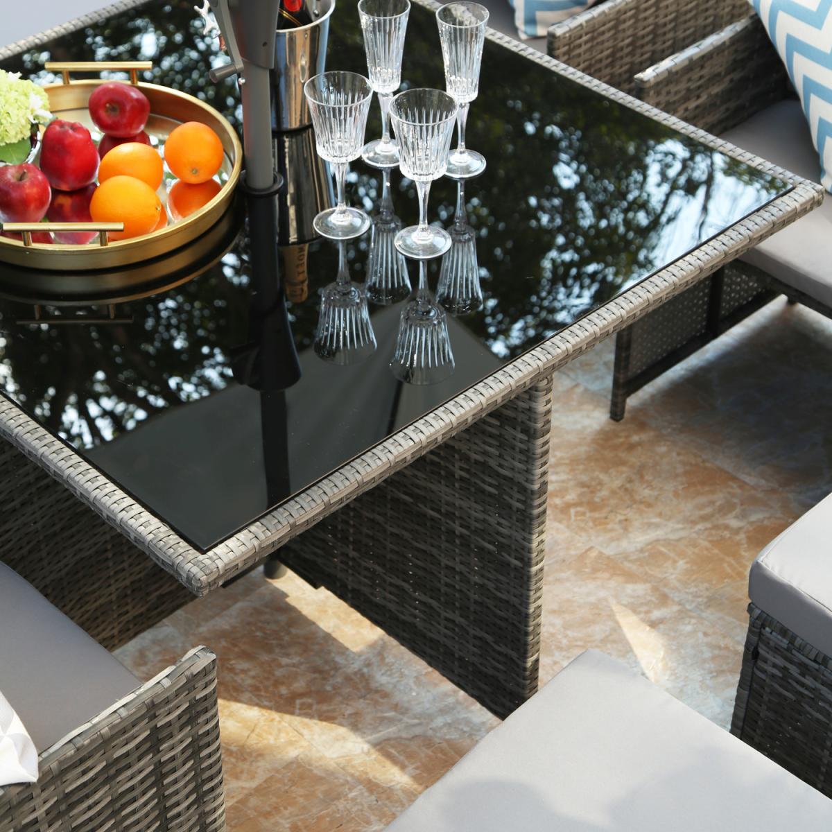 This high-quality, low-maintenance 8-seater compact rattan sofa is an excellent choice for outdoor dining and relaxation. It's highly comfortable with a compact design that can fit into any garden or backyard space. With 4 seats, 4 stools and a centre table, it's the ideal rattan corner sofa for those looking to relax and enjoy the outdoor summer air. The rattan garden corner sofa table comes fitted with tempered glass and a parasol holding bar while the seats are made of rattan weaving held together by powder-coated steel. It's a highly-durable outdoor sofa with a polyester cushion cover thats removable and easy to wash.