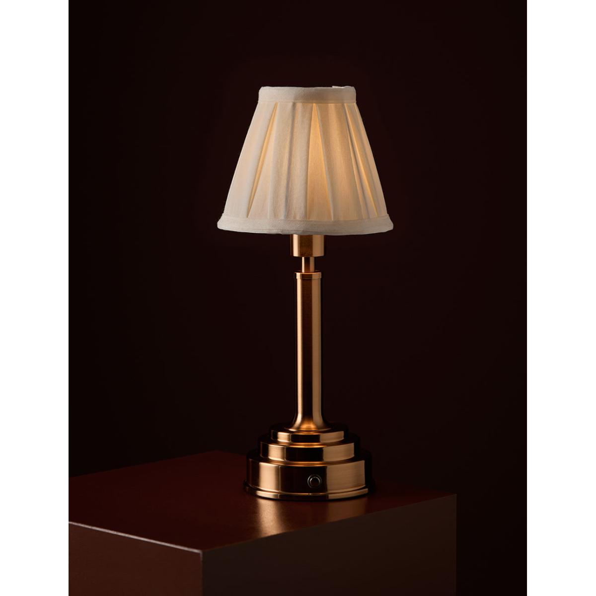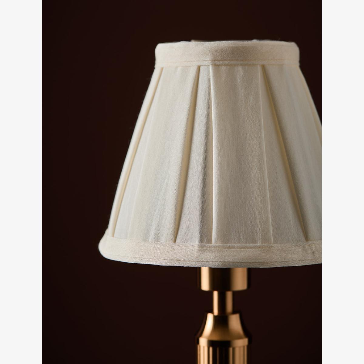 A small cream pleated fabric shade which is lined and edged beautifully. Fitting clips over the bulb.   Goes perfectly with our Gustave and Auguste rechargeable lamps. Also available in an Ikat and Zig Zag print A small 15cm cream pleated fabric shade suitable for our Gustave and Auguste portable brass lamps. Fitting simply clips onto the bulb.