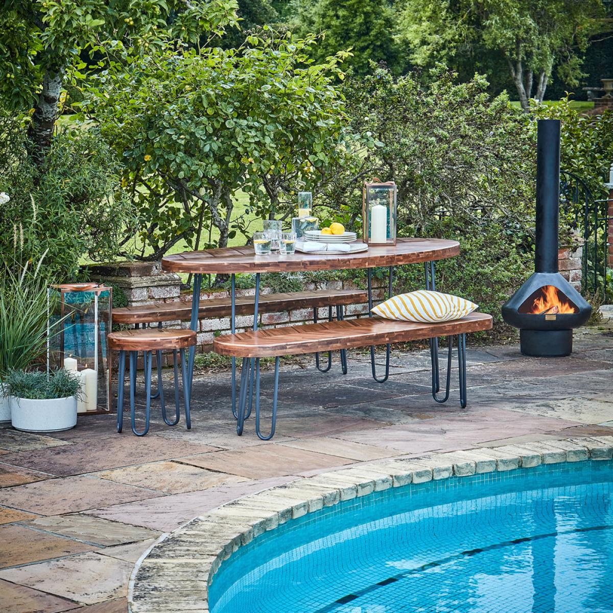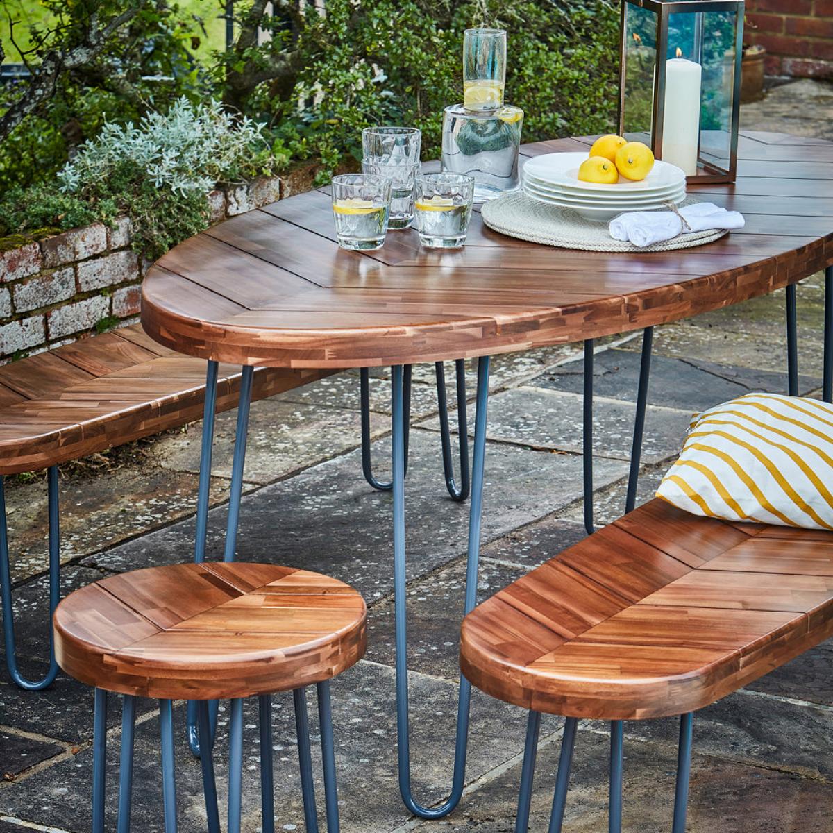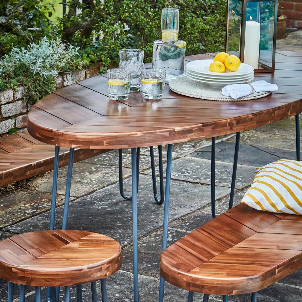 Those looking to revamp their outdoor dining space should look no further than our exquisite Borough furniture set. The unique contemporary design is made with coated FSC Certified acacia hardwood, and its robust frames are finished with a kiln-baked protective powder to protect against scratching or rusting. The Borough design set provides a stunning and practical dining setting. Dimensions: H: 78 x W: 180 x D: 83 cm Materials: Wood Assembly Required: No Care Instructions:We recommend storing outdoor items either under cover or inside during harsh or adverse weather to prolong the life of the product Additional Information: UV stable, Premium quality, Suitable for outdoors