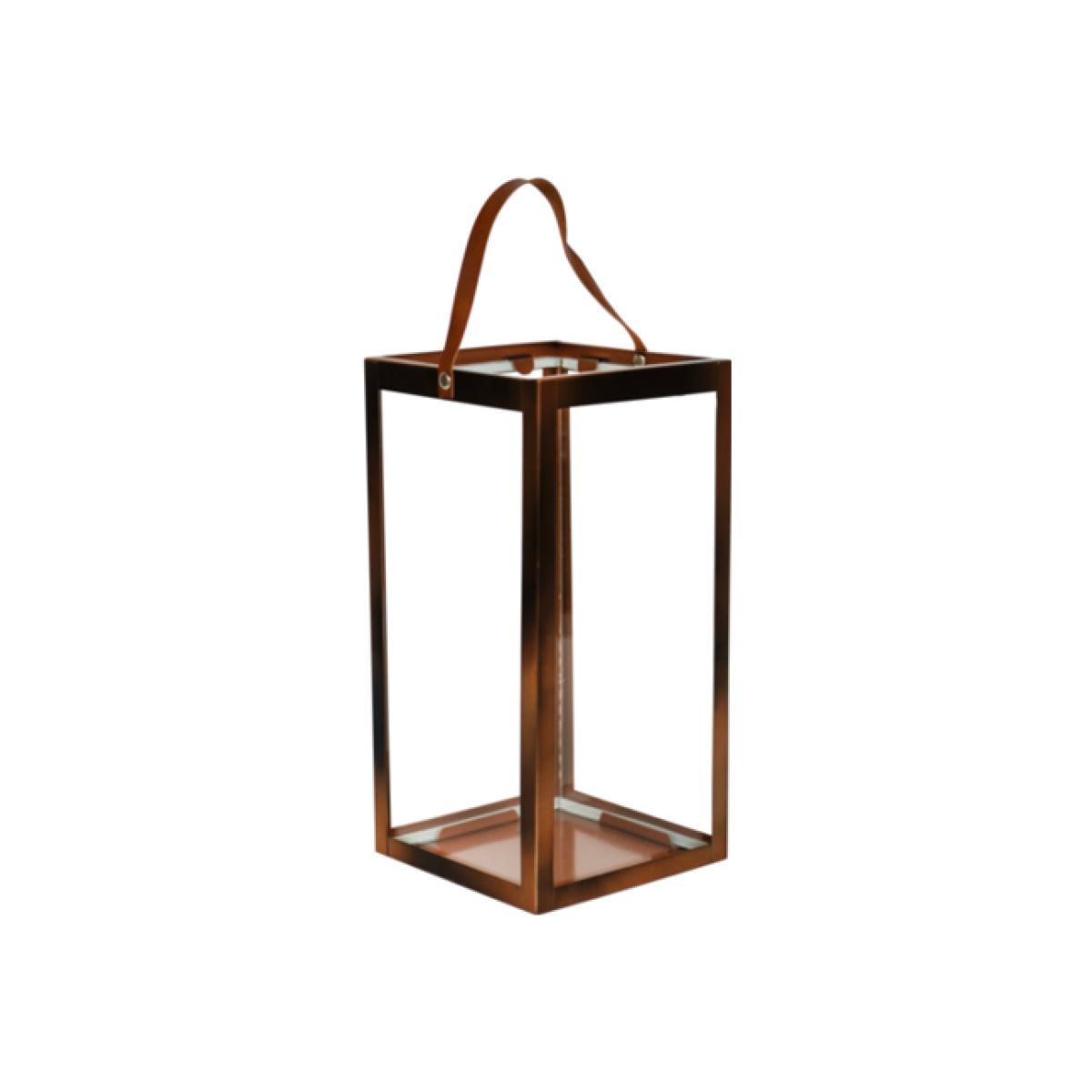 The Hampton copper lantern is a striking modern design with smooth lines made from the finest copper and its handy carry strap at the top that allows you to use it anywhere. The Hampton enhances and illuminates any indoor or outdoor space. Why not accessorize it with another lantern in a smaller size?