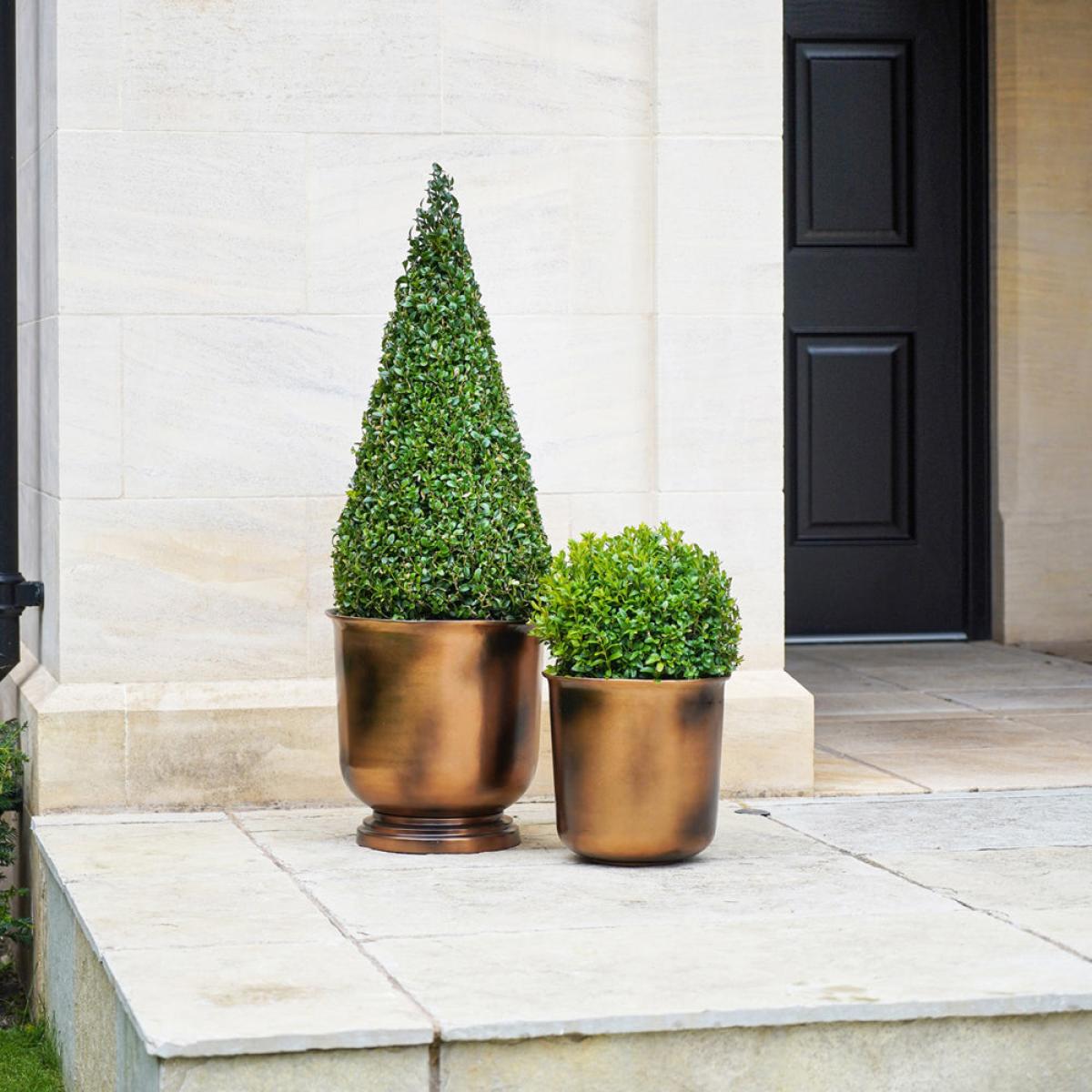 Frost and rust-resistant, this outdoor Hampton copper urn has a wonderfully luxurious feel and is in fact fresh from the design studio. Stable in the sunlight (and thus suitable for outdoors), this curved planter is perfect for enhancing your outdoor living space with your favourite flora and shrubbery. What's more, it's lightweight so you can position it with ease. Dimensions:Tall - H: 40 x W: 31.5 x D: 31.5 cm Wide - H: 35 x W: 34 x D: 34 cm Materials: Metal Assembly Required: No Care Instructions:Dust wipe a clean, soft cloth. No harsh abrasives or cleaners Additional Information: Rust resistant, UV stable, Premium quality, Suitable for outdoors, Frost resistant, Lightweight