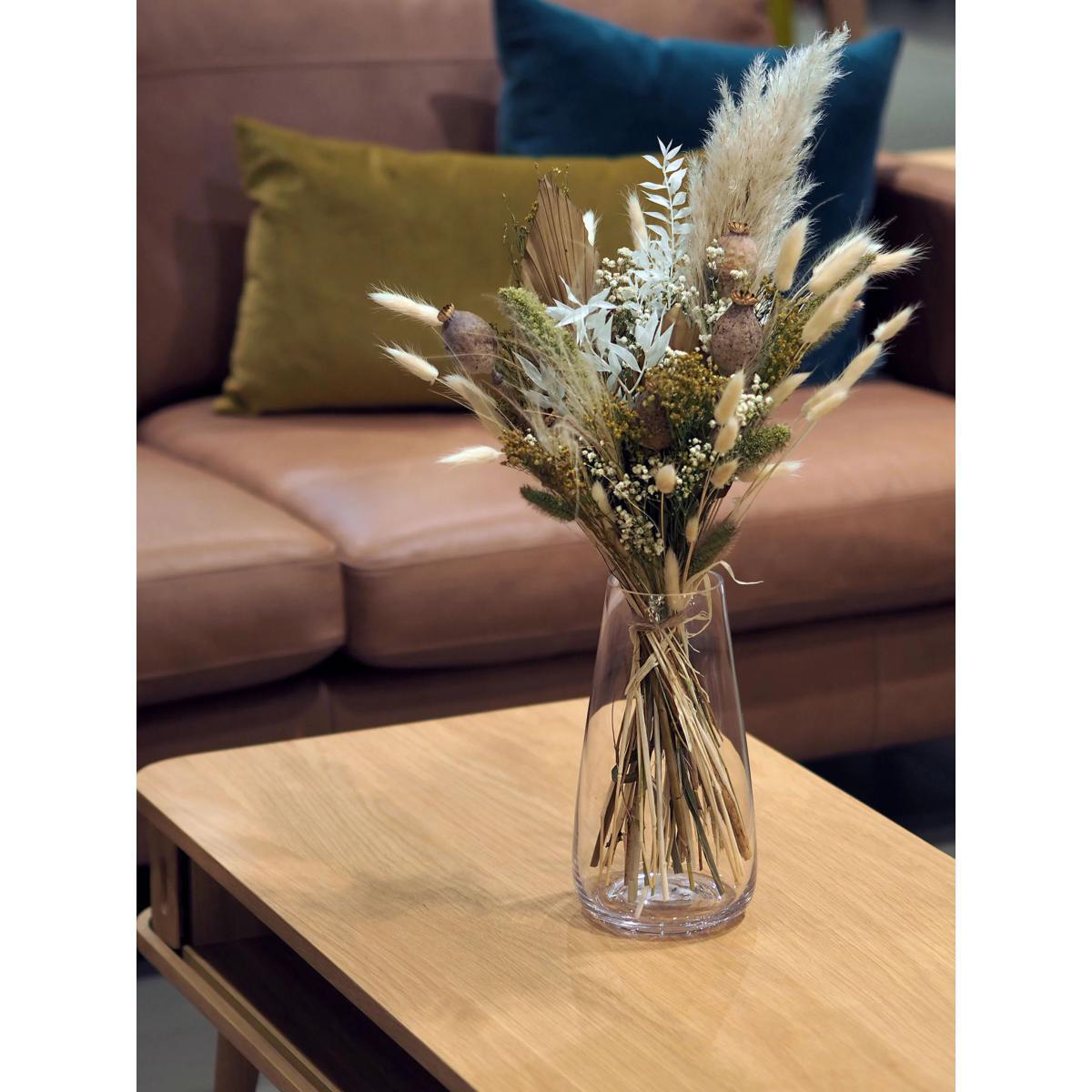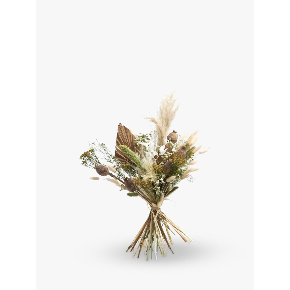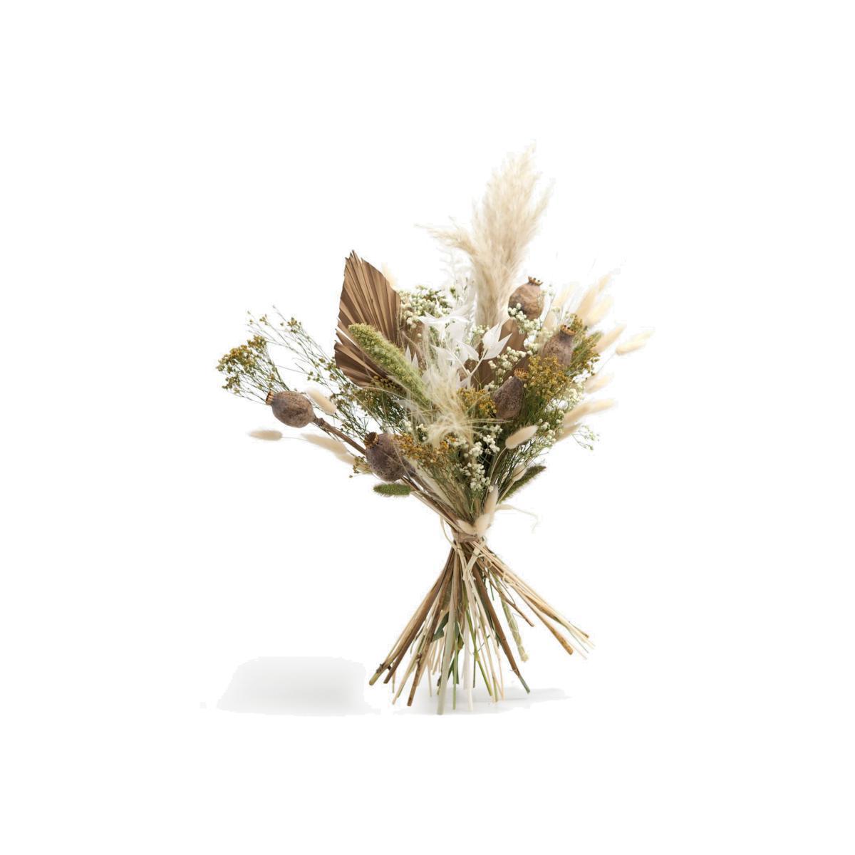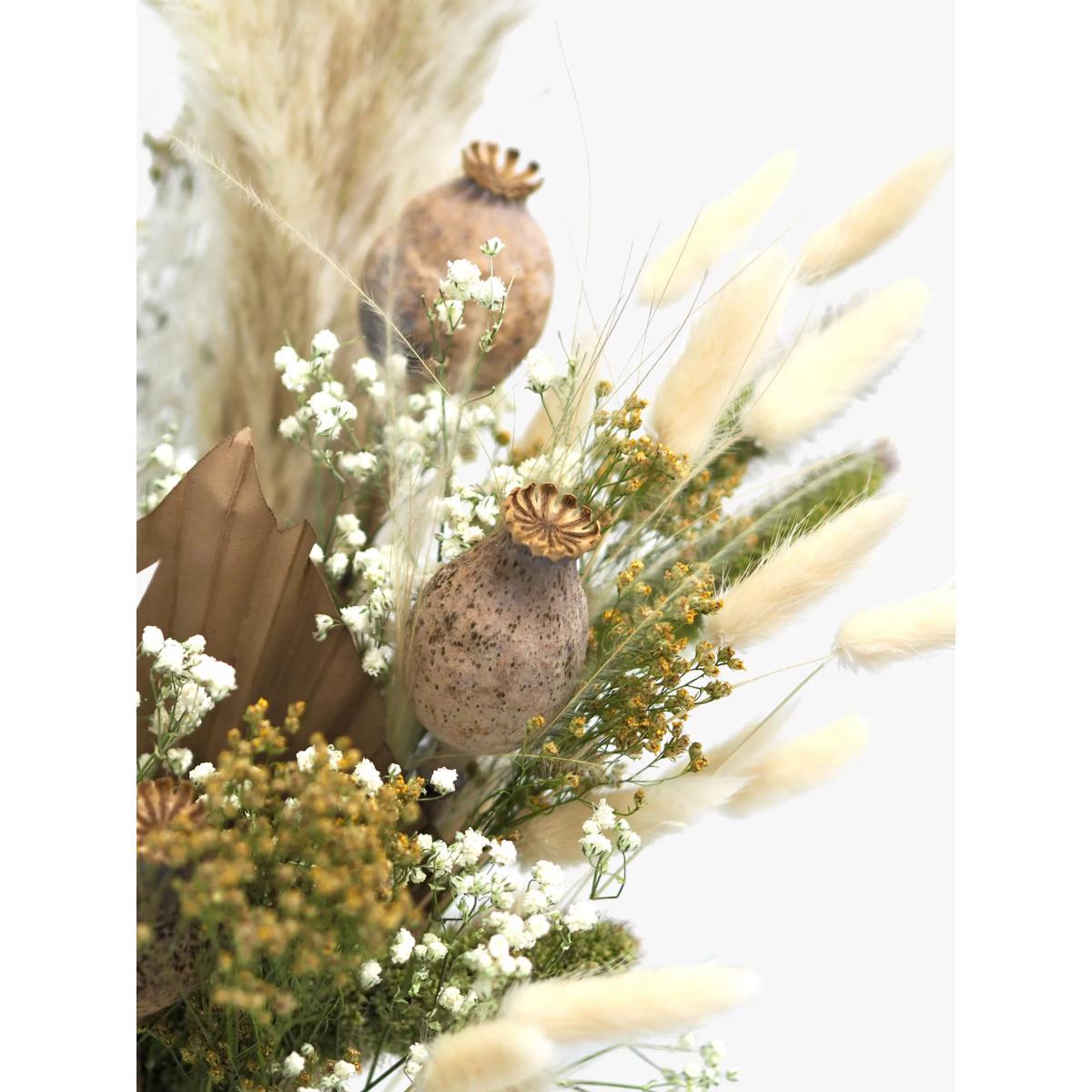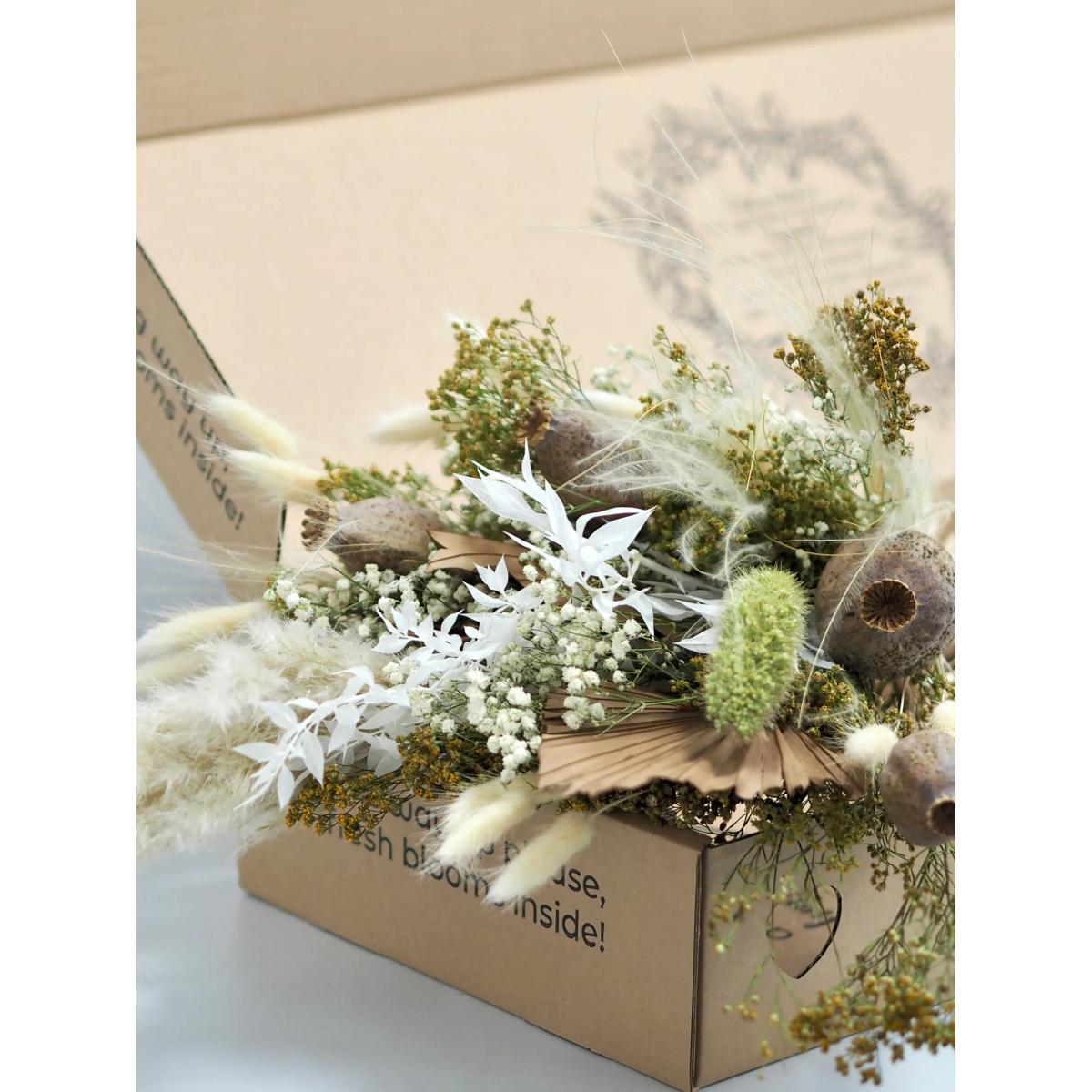 Luxury whites creates instant visual impact whilst retaining the detail and texture of the standard sized bunch and includes: dried natural avena, dried semi bleached phalaris, dried natural palm spear, dried bleached broom, dried natural gypsophila, dried stipa pennata, dried natural pampas, dried poppy seed heads and grasses. As Ixia Flowers only use natural products there will be a small variation in shade and height of individual arrangements. The arrangement is hand tied with twine and black silk ribbon, and packaged in tissue paper, brown paper and our signature Ixia flower box. Boxes include information on how to care for your arrangement. Care Instructions Remove the packaging from your dried flowers, leave the twine on the arrangement. Place in a clean dry vase, dried flowers do not need water and should be kept away from moisture and humidity. Place your arrangement somewhere where it is not being moved or brushed past to avoid fall out from the stems. Blow the dust off gently from a distance with a hairdryer on cool setting. Dried flowers should be kept out of the reach of children and animals and are not edible. Keep away from soft furnishings as the colour from some stems may transfer