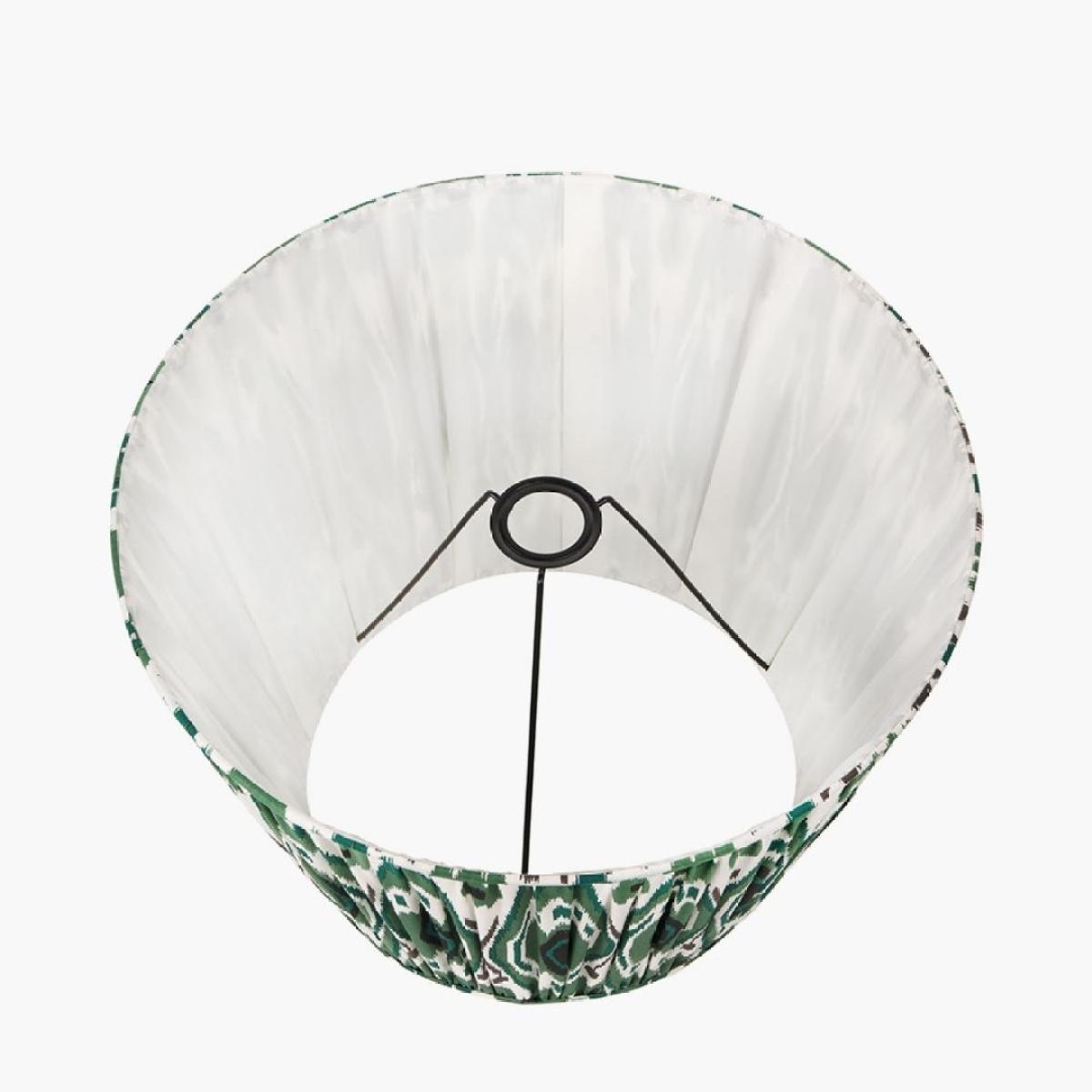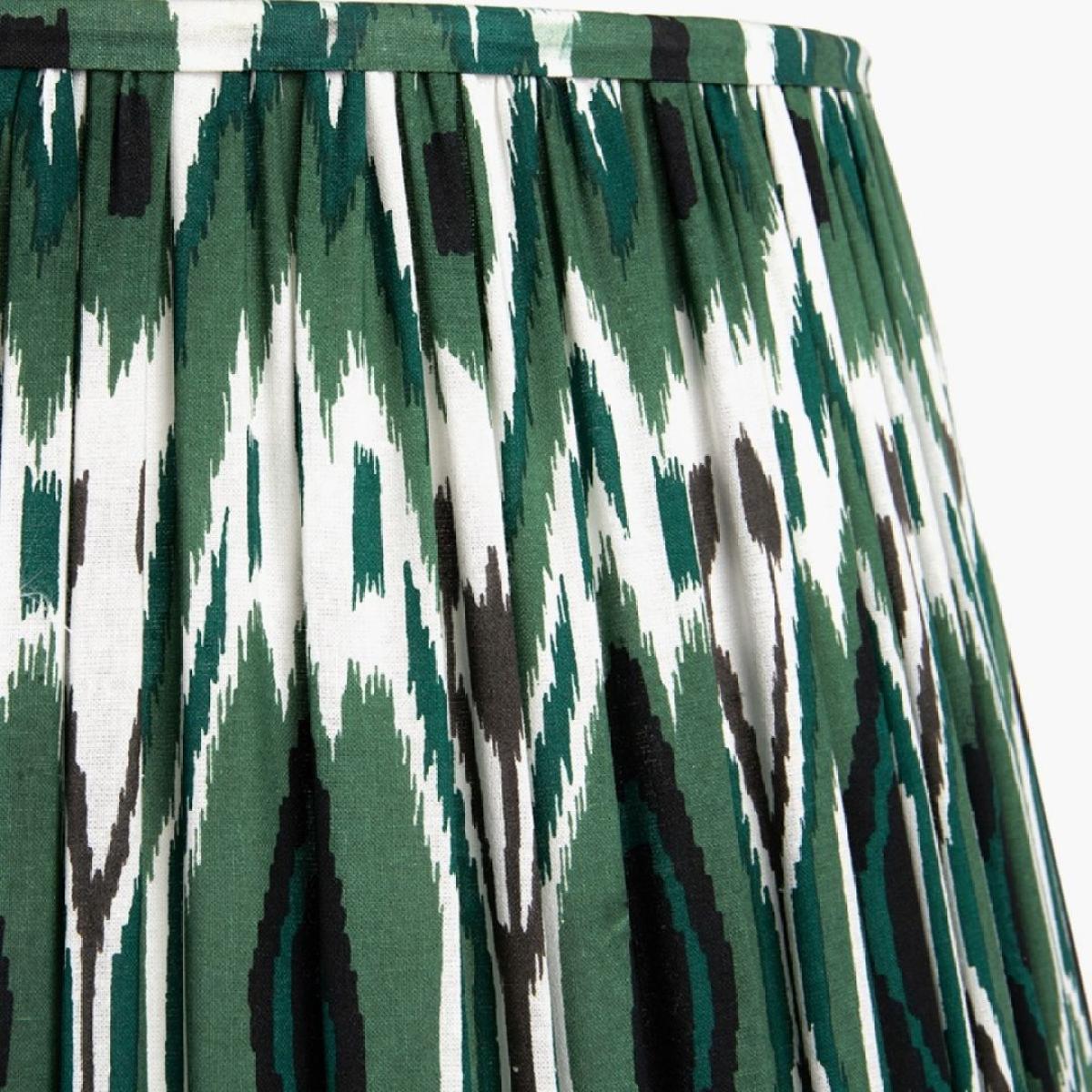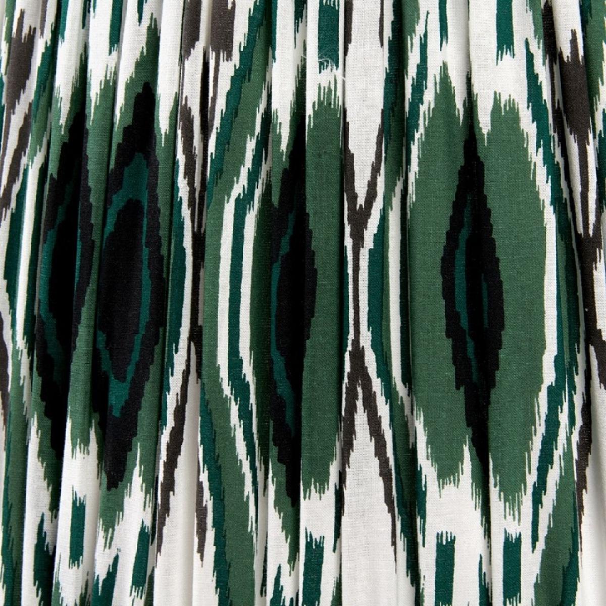 Izara 35cm cotton-gathered tapered shade, featuring a green Ikat pattern and mushroom pleating. A stylish and eye-catching addition to your home lighting collection, this beautifully crafted shade features a vibrant green Ikat pattern, bringing a touch of global elegance and contemporary flair to any room. The mushroom pleating adds a unique texture and depth, enhancing the overall aesthetic with its intricate detailing. Measuring 35cm in diameter, this Izara Shade is perfect for table lamps, accent lamps and small floor lamps. Its tapered shape ensures optimal light diffusion, creating a warm and inviting ambiance in your space. The combination of the green Ikat pattern and the mushroom pleating makes this shade a standout piece that adds personality and charm to your decor. Izara 35cm cotton-gathered tapered shade, featuring a green Ikat pattern and mushroom pleating. A stylish and eye-catching addition to your home lighting collection, this beautifully crafted shade features a vibrant green Ikat pattern, bringing a touch of global elegance and contemporary flair to any room. The mushroom pleating adds a unique texture and depth, enhancing the overall aesthetic with its intricate detailing. Measuring 35cm in diameter, this Izara Shade is perfect for table lamps, accent lamps and small floor lamps. Its tapered shape ensures optimal light diffusion, creating a warm and inviting ambiance in your space. The combination of the green Ikat pattern and the mushroom pleating makes this shade a standout piece that adds personality and charm to your decor.