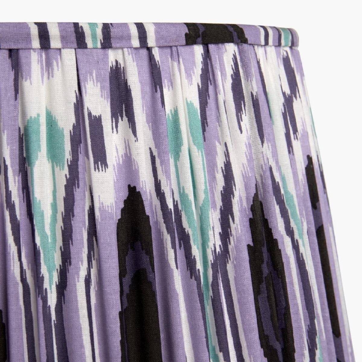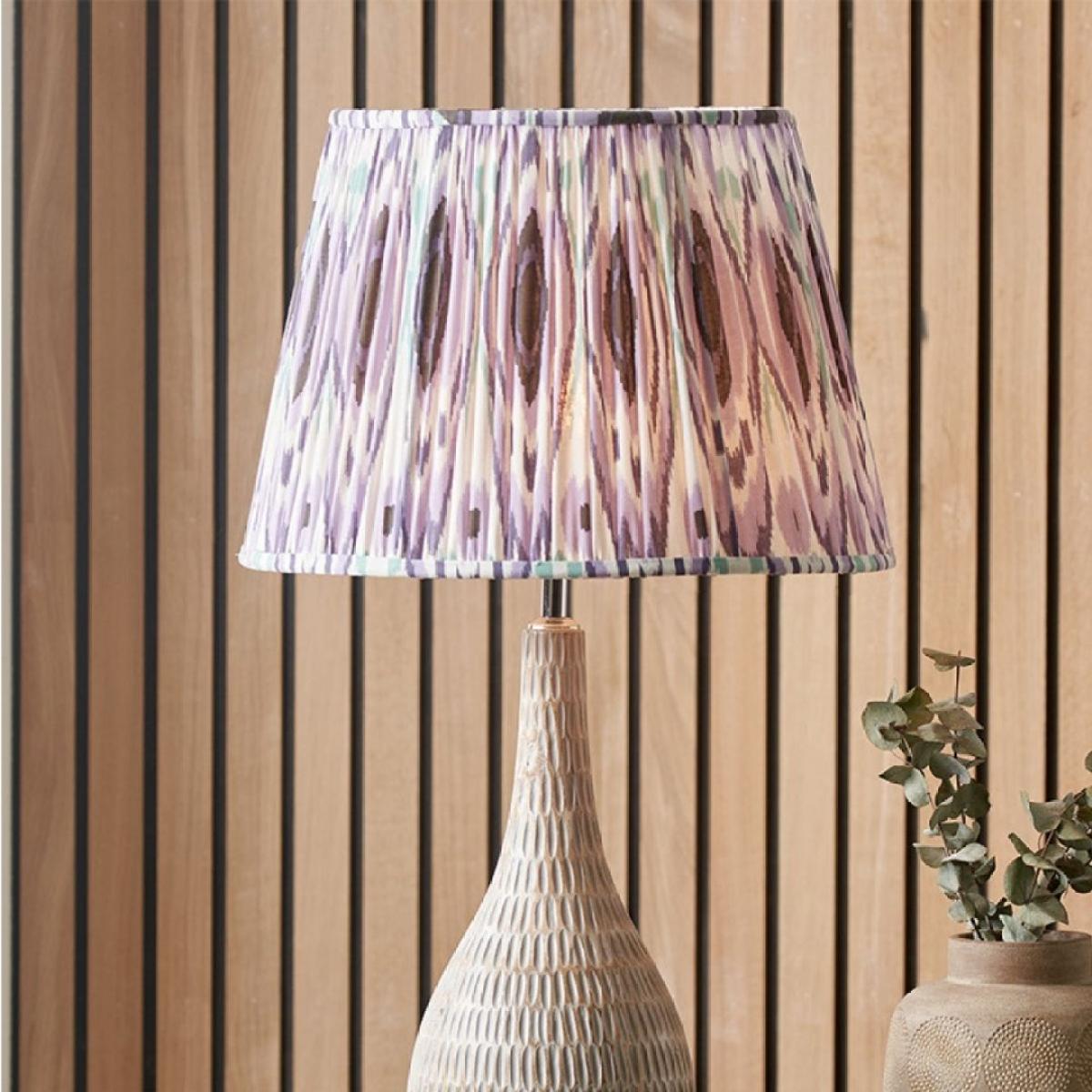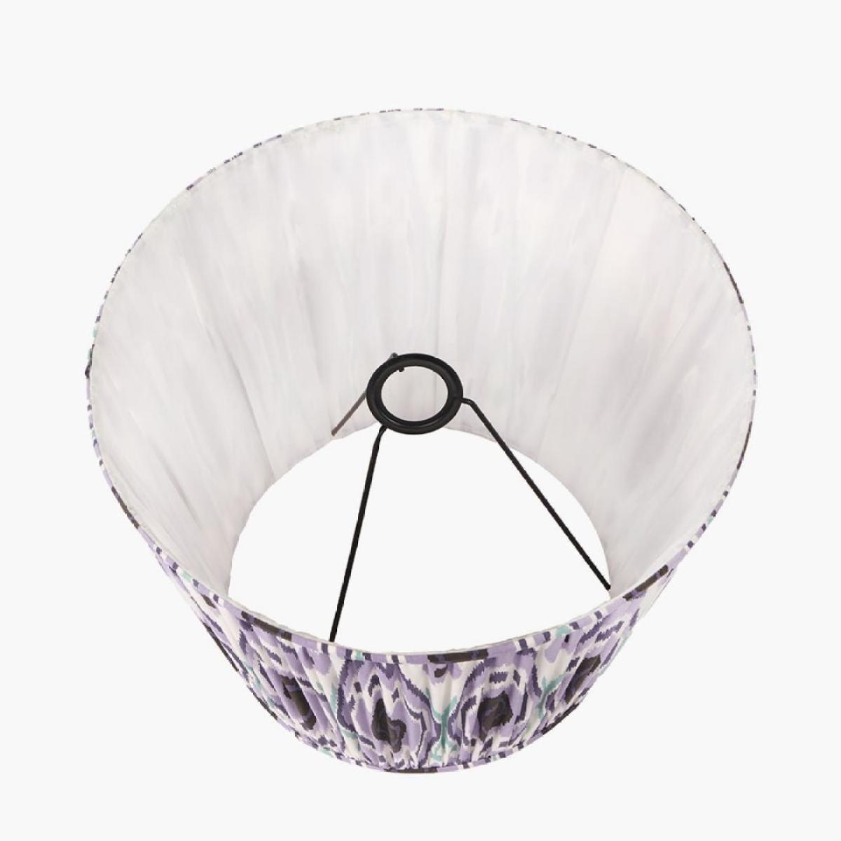 Izara 45cm cotton-gathered tapered shade, featuring a lilac Ikat pattern and mushroom pleating. A stylish and eye-catching addition to your home lighting collection, this beautifully crafted shade features a vibrant lilac Ikat pattern, bringing a touch of global elegance and contemporary flair to any room. The mushroom pleating adds a unique texture and depth, enhancing the overall aesthetic with its intricate detailing. With a diameter of 45cm, this Izara shade is ideal for a variety of fixtures, from larger table lamps to stylish floor lamps and ceiling pendants. Its tapered shape ensures optimal light diffusion, creating a warm and inviting ambiance in your space. The combination of the lilac Ikat pattern and the mushroom pleating makes this shade a standout piece that adds personality and charm to your decor. Izara 45cm cotton-gathered tapered shade, featuring a lilac Ikat pattern and mushroom pleating. A stylish and eye-catching addition to your home lighting collection, this beautifully crafted shade features a vibrant lilac Ikat pattern, bringing a touch of global elegance and contemporary flair to any room. The mushroom pleating adds a unique texture and depth, enhancing the overall aesthetic with its intricate detailing. With a diameter of 45cm, this Izara shade is ideal for a variety of fixtures, from larger table lamps to stylish floor lamps and ceiling pendants. Its tapered shape ensures optimal light diffusion, creating a warm and inviting ambiance in your space. The combination of the lilac Ikat pattern and the mushroom pleating makes this shade a standout piece that adds personality and charm to your decor.