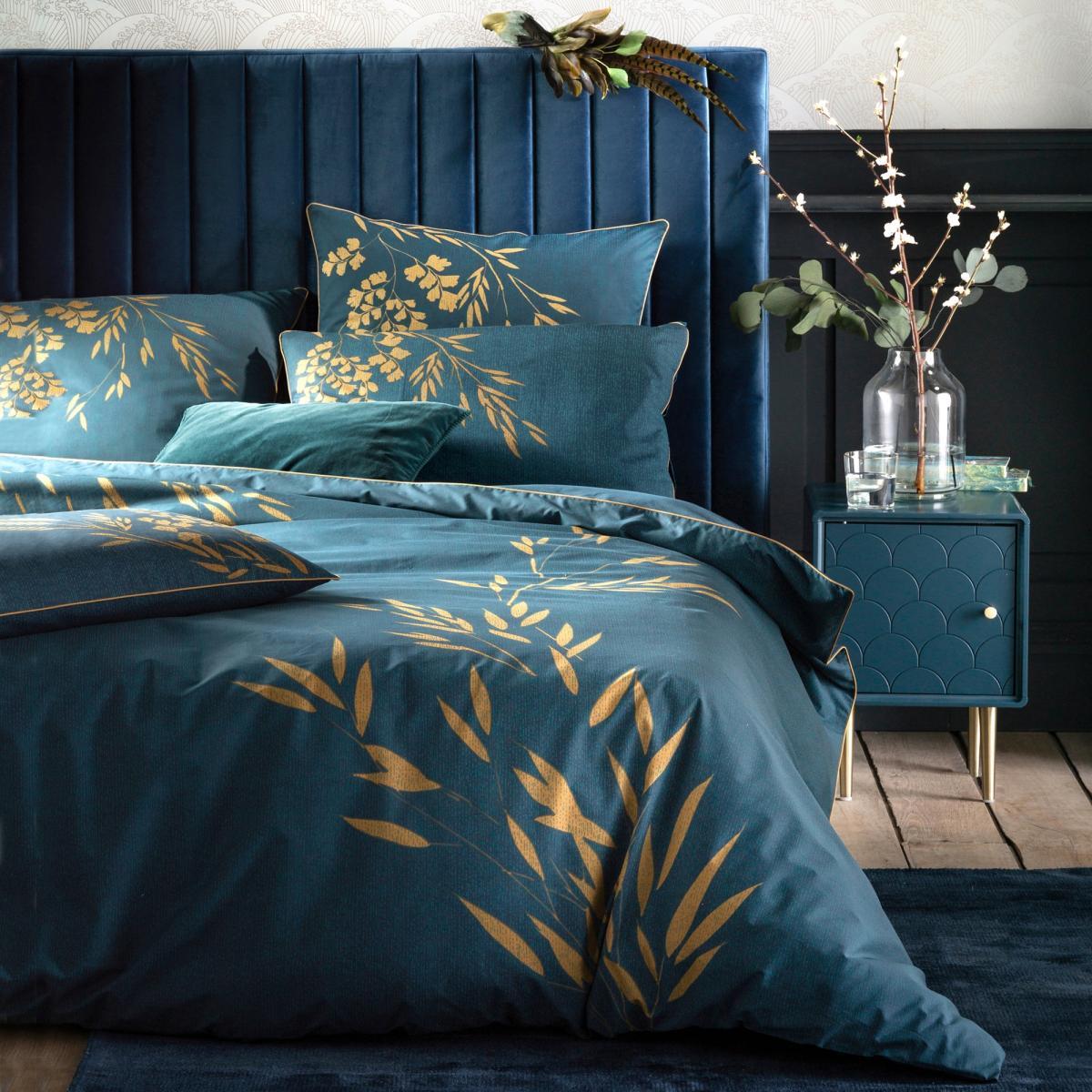 I love the Izumi duvet in cotton percale for its sleek, sophisticated look and its versatility across various interiors. Its rich teal hue combined with subtle gold botanical detailing makes it ideal for contemporary bedrooms, especially those leaning towards luxe or minimal styles. It pairs beautifully with both neutral tones and more dramatic colour schemes, serving as a standout piece without overwhelming the space. Practical styling tips include layering with textured throws or adding contrasting cushions in velvet or linen to create depth. Since cotton percale is durable and crisply woven, it’s perfect for everyday use, offering a fresh feel that only improves with washing-making it both stylish and sensible for a well-edited bedroom.