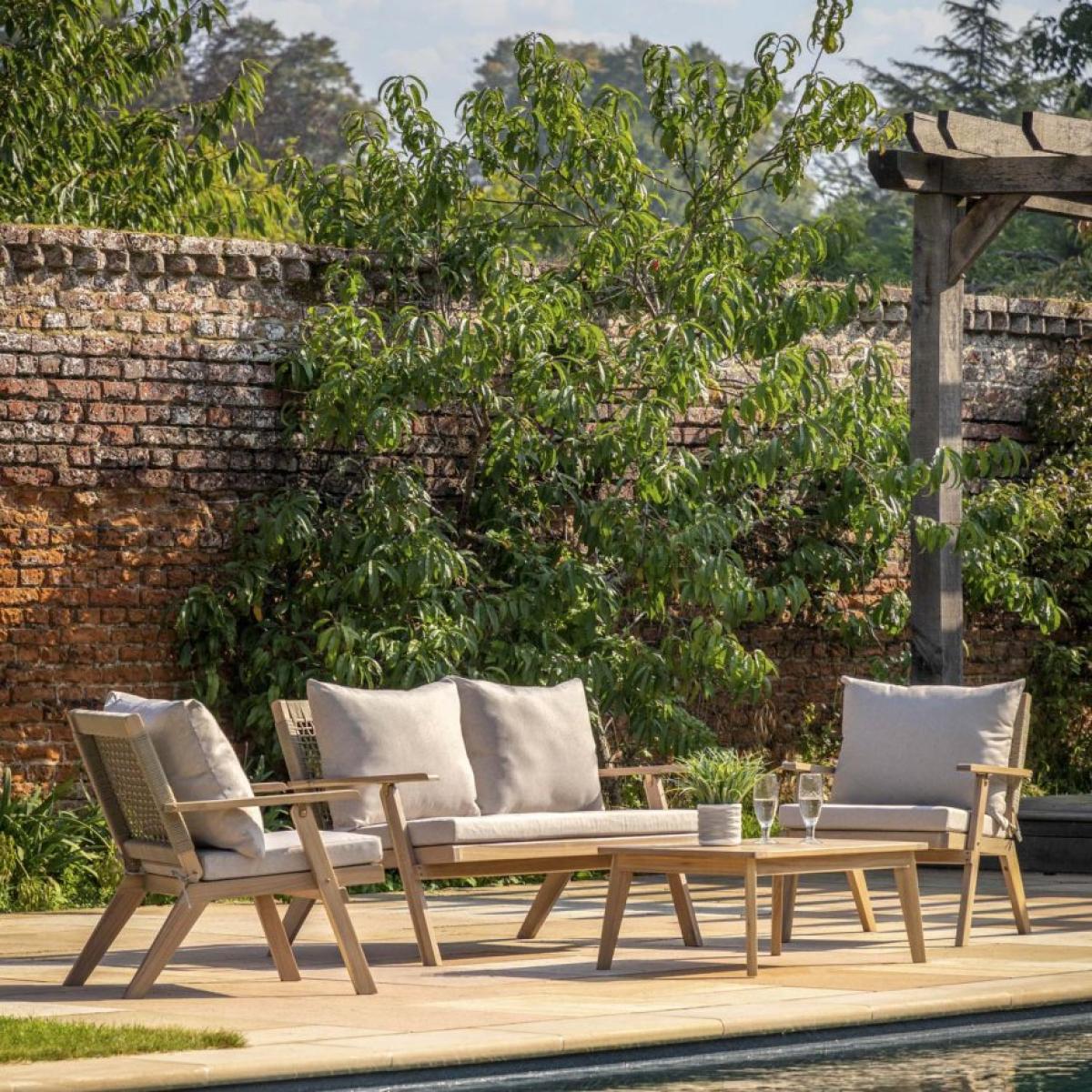 The Jaca Lounge Set will allow you to make the most of your outside space. The 2 seater sofa and 2 armchairs are finished with woven rope backs and grey cushions, and the set is completed by a slatted top coffee table, all made from FSC Acacia wood with a beautiful finish. Designed for easy storage, both armchairs and the 2 seater sofa fold flat once the cushions are removed, showcasing its practicality. *Simple Self Assembly *Table Dimensions: W80cm x D55cm x H35cm *Table Clearance To Floor: 34.5cm *Chair Dimensions: W64cm x D75cm x H75cm *Chair Seat Width: 54cm *Bench Dimensions: W124cm x D75cm x H75cm *Bench Seat Width: 114cm *Chair and Bench Clearance To Floor: 30cm *Seat Height: 35cm *Seat Depth: 49cm *Made From Acacia, Foam, Rope, Polyester, and Fibre