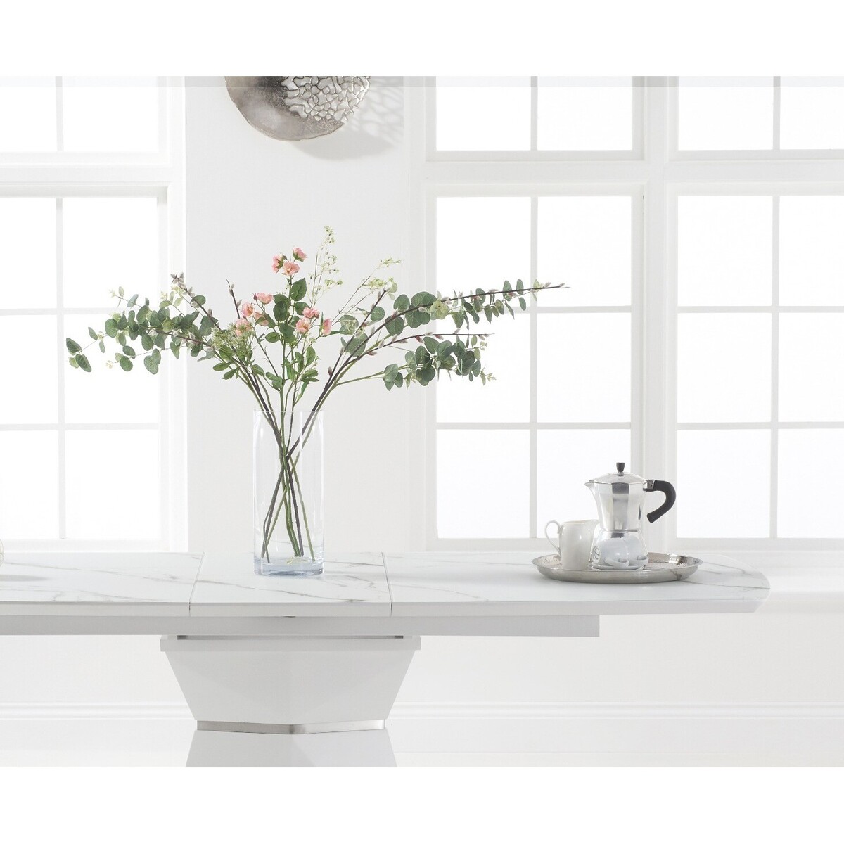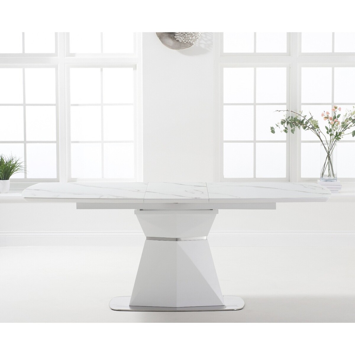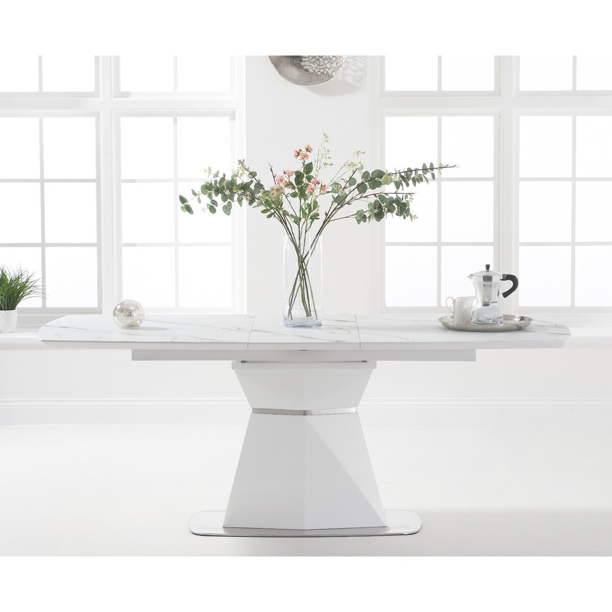 The Jackson 160cm White Extending Dining Table features a unique modern design that makes an impression. Comfortably seating up to 8 people, the contemporary dining table features a smooth and strong table top that extends to 200cm supported by a durable pedestal leg. Stylish and versatile extending dining table Extends to 200cm to comfortably seat 8 Convenient inbuilt extension feature Smooth and strong table top and sturdy pedestal leg Protective wipe-clean finish for simple maintenance Sleek and sturdy metal base