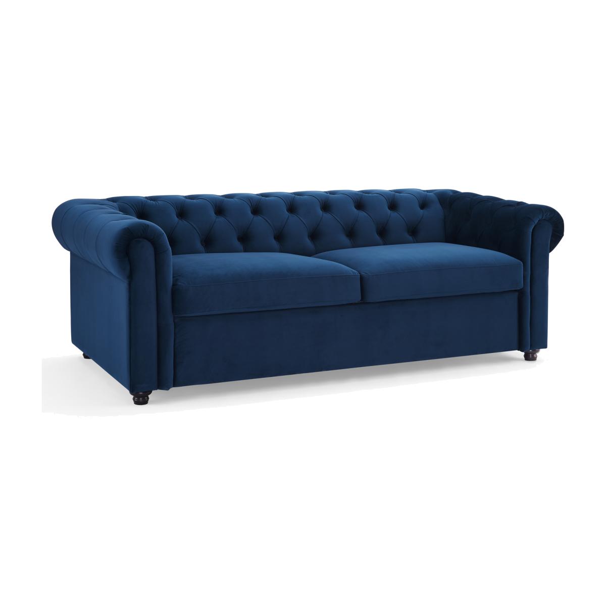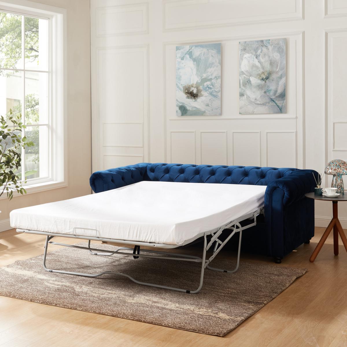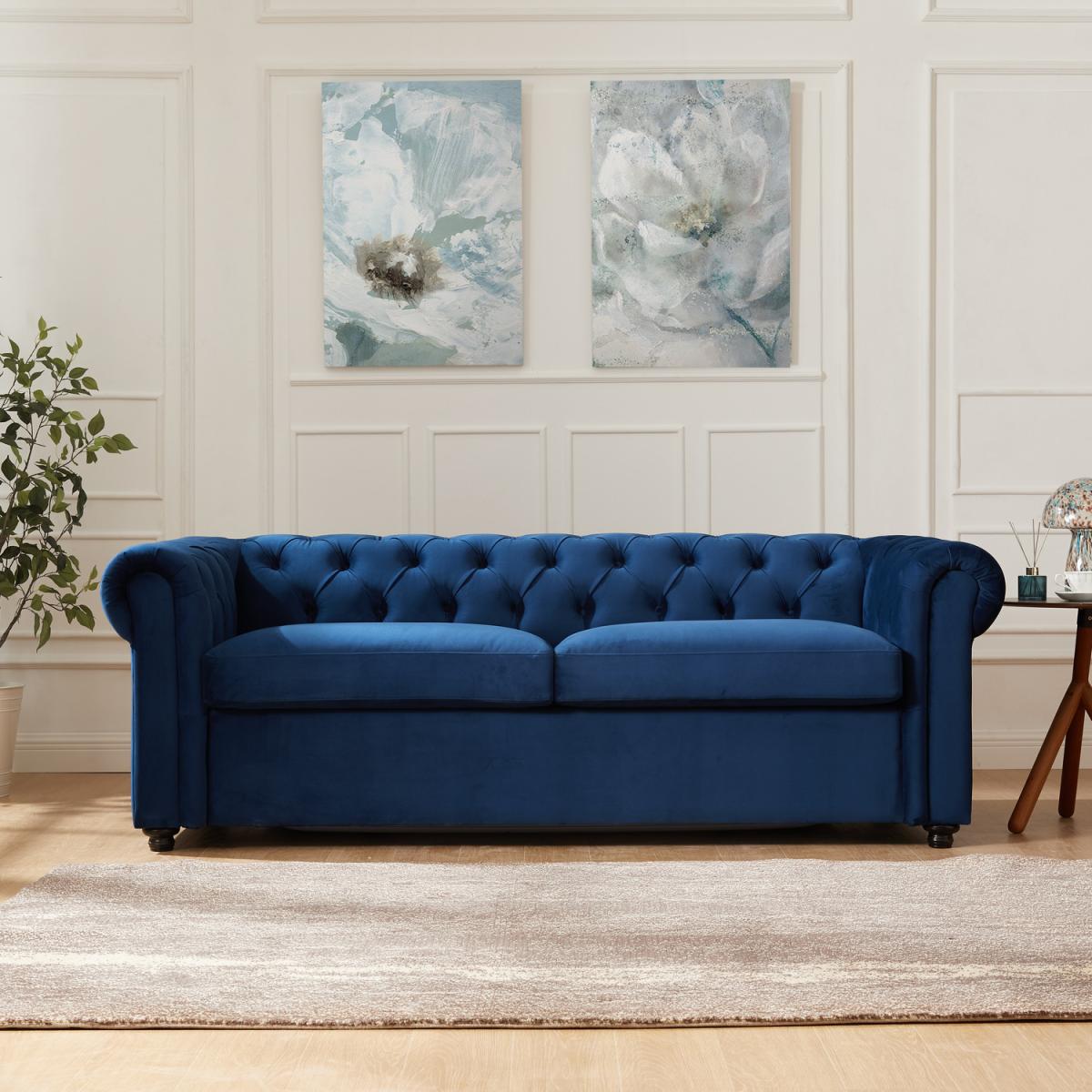 Introducing JACKSON our compact pull out chesterfield inspired sofa bed with fold out mattress available in grey velvet and blue velvet. JACKSON can seat up to 2 people as a sofa and the sleeping area converts to the size of a small double as a sofa bed. JACKSON has a compact boxy design ideal for small spaces where living and sleeping are needed in one place. It has has the classic chesterfield inspired tufted detail on the interior of the seat area and smooth velvet wrapping around the outside and stands on dark wooden block feet. JACKSON has a convertible design with a simple lift out mechanism with a fold out mattress supported by metal framework. Velvet is one of the most desirable upholstery fabrics. Its soft texture perfectly suits any piece of furniture and adds a touch of opulence and elegance. It is a woven polyester fabric with a short, thick, plush pile. This sofa is a large item, therefore we require you to ensure it will fit through any access doors and walkways in your property. Please consult our sofa fit guide which you can find in the pictures section. Minimum door width of 80cm. All sizes are approximate, please allow for small variations. Some fabrics may look slightly different in person due to variations in lighting and screen resolution on laptop, desktop and mobile devices. Velvet can have a distinct appearance, in natural light it tends to shimmer more, whereas in artificial lighting indoors, it tends to look more subdued. The colour of velvet may change if you stroke it in different directions, to maintain consistency, stroke the velvet in one direction with an open palm.